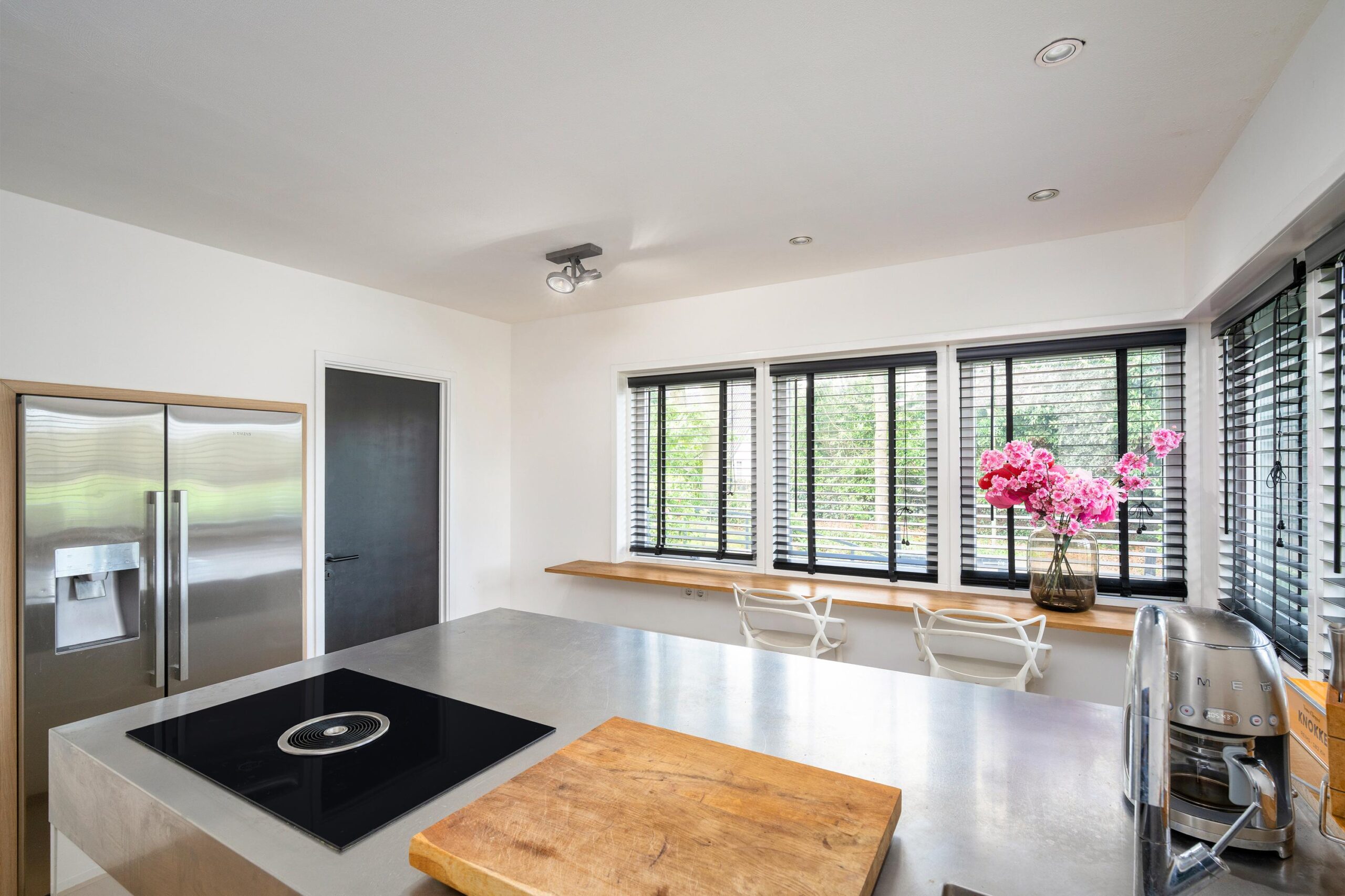 De entree straalt direct klasse uit. Een ruime hal met hoge lichte vide, garderobe, toilet en moderne afwerking leidt naar de indrukwekkende living en keuken van circa 100 m². Aan de tuinzijde bevindt zich de woonkamer, voorzien van een gezellige open haard en een serre met dubbele deuren. Vanuit de eethoek leiden eveneens dubbele deuren naar de groene buitenruimte. Door de glazen deur is er een aparte, lichte ruimte die nu in gebruik is als kantoor, maar ook perfect geschikt is als speelkamer of tv-kamer. De keuken is voorzien van een kookeiland en uitgerust met alle denkbare inbouwapparatuur, waaronder een vaatwasser, koffieautomaat, stoomoven en Bora BFIU inductieplaat.