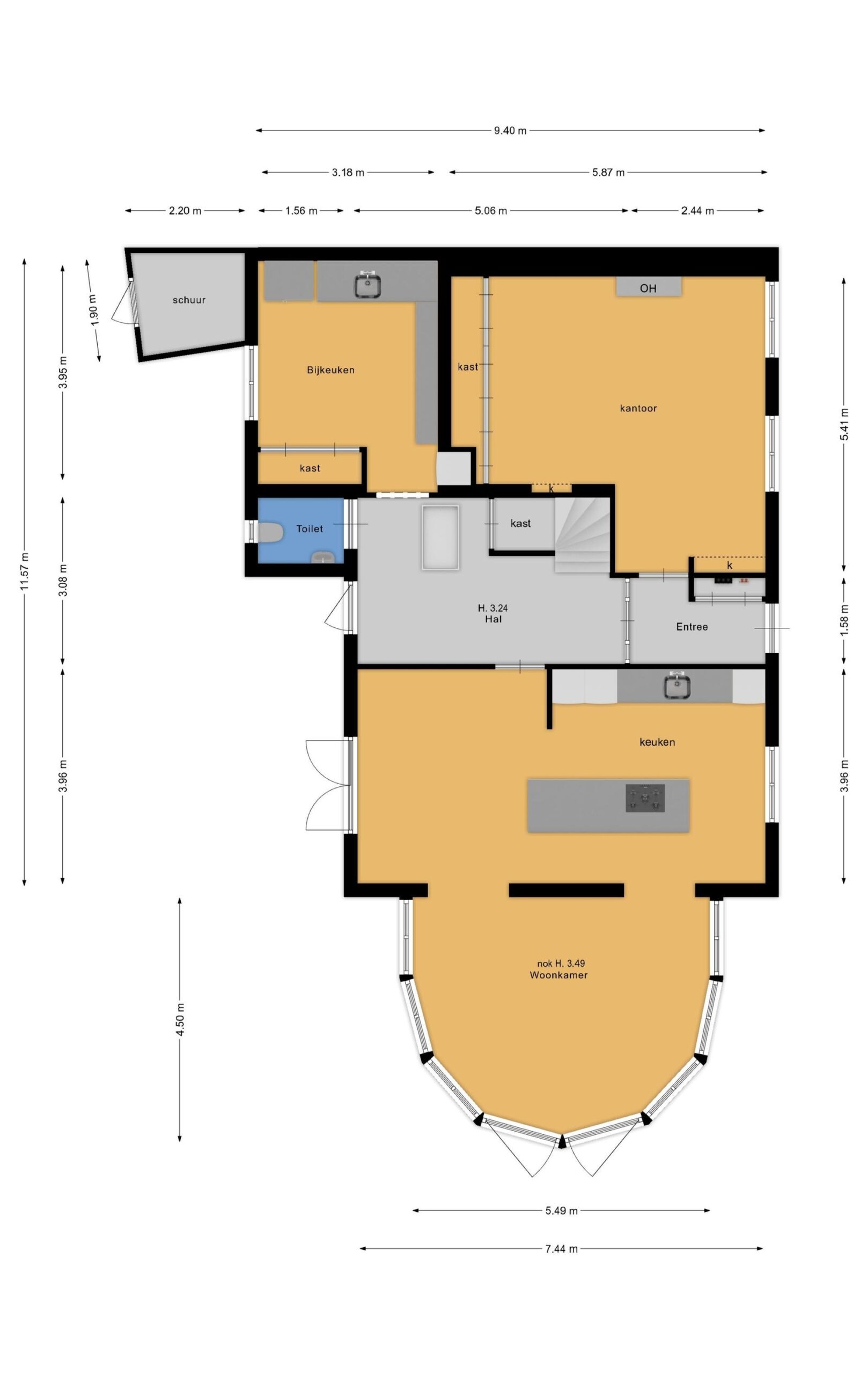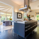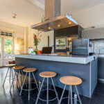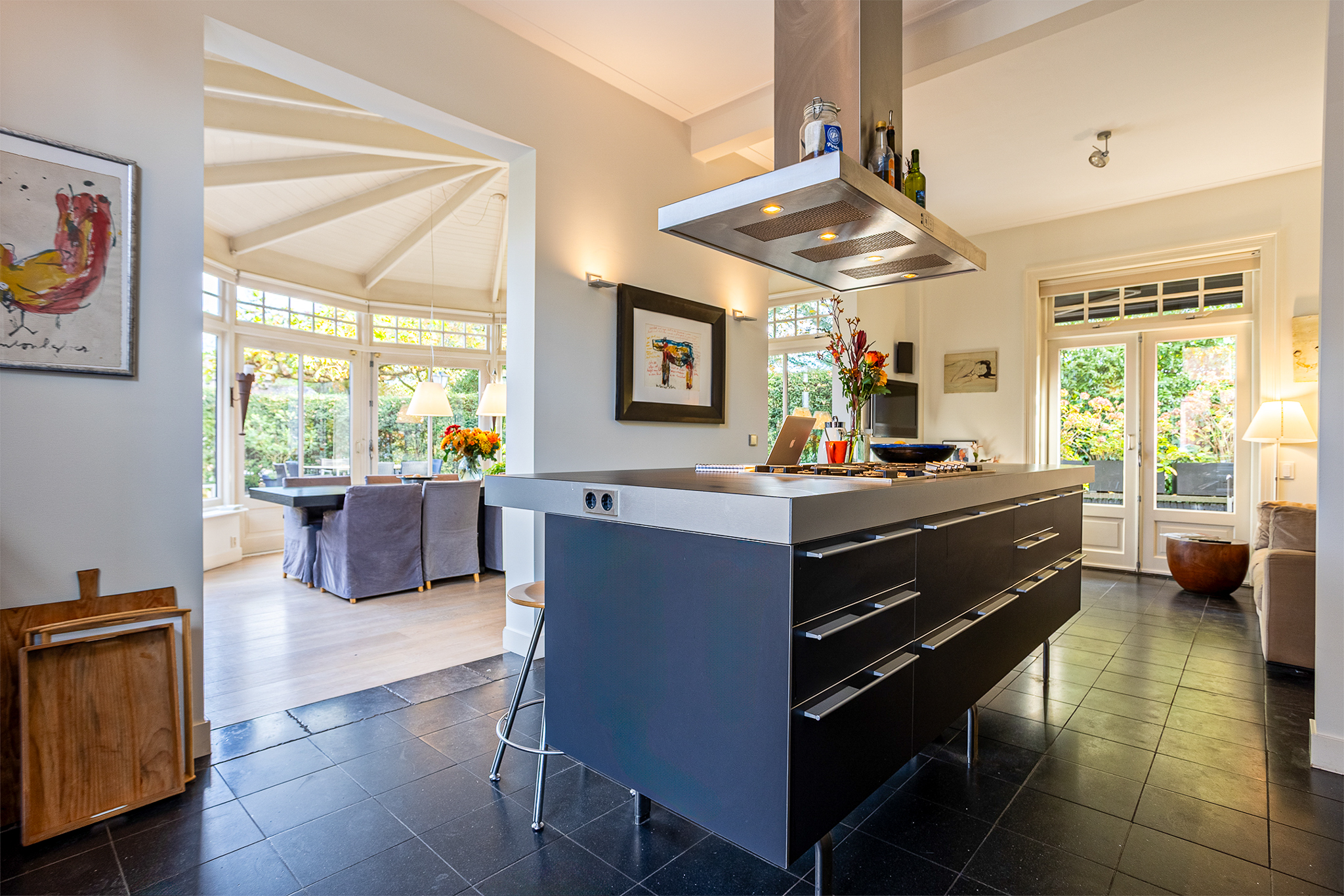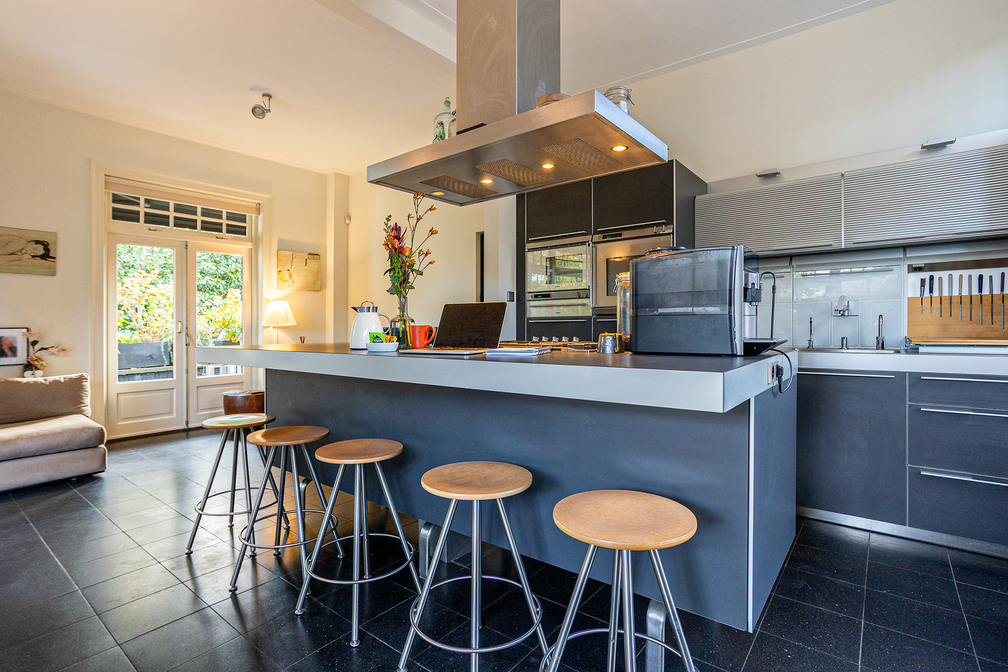 Entree met toegang naar een royale werkkamer/ kantoorruimte, perfect als thuiswerkplek of praktijkruimte aan huis en voorzien van vaste kasten. Via de entree betreedt u de ruime hal met trapopgang, luik naar de kelder en toegang tot de bijkeuken, aparte wc en leefruimtes. Aan de linkerzijde van de woning bevindt zich de royale woon-/ eetkamer in de serre met grote glaspartijen rondom. Hierdoor heeft de ruimte een prachtige lichtinval en een directe verbinding met de tuin via openslaande deuren. De woonkamer loopt naadloos over in de moderne woonkeuken, waar een groot kookeiland het hart van de ruimte vormt, hetgeen dit een ideale plek maakt om uitgebreid te koken en te tafelen. Ook is een zithoek/ tv ruimte gecreëerd en heeft u via de openslaande deuren toegang naar de tuin met naastgelegen berging.