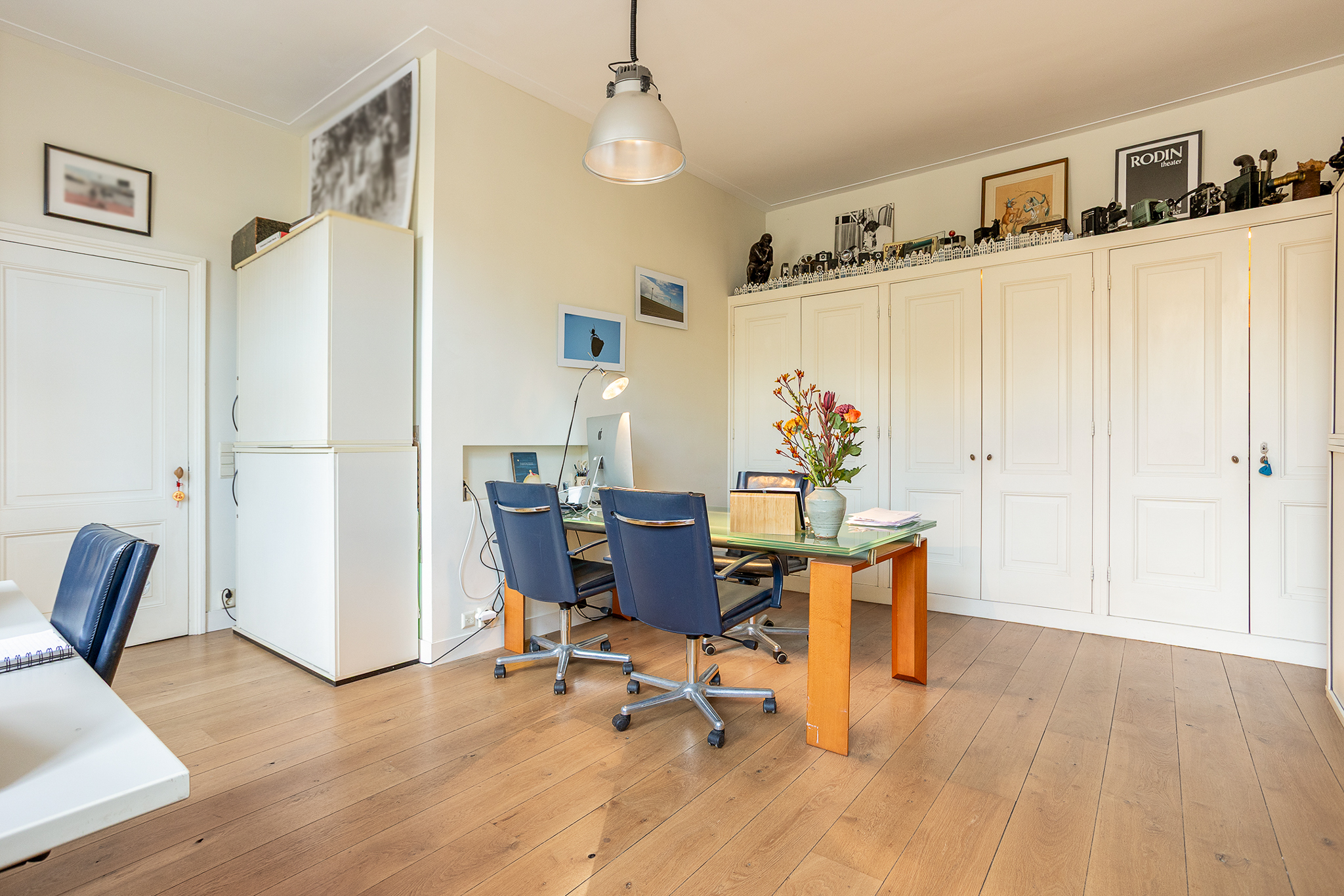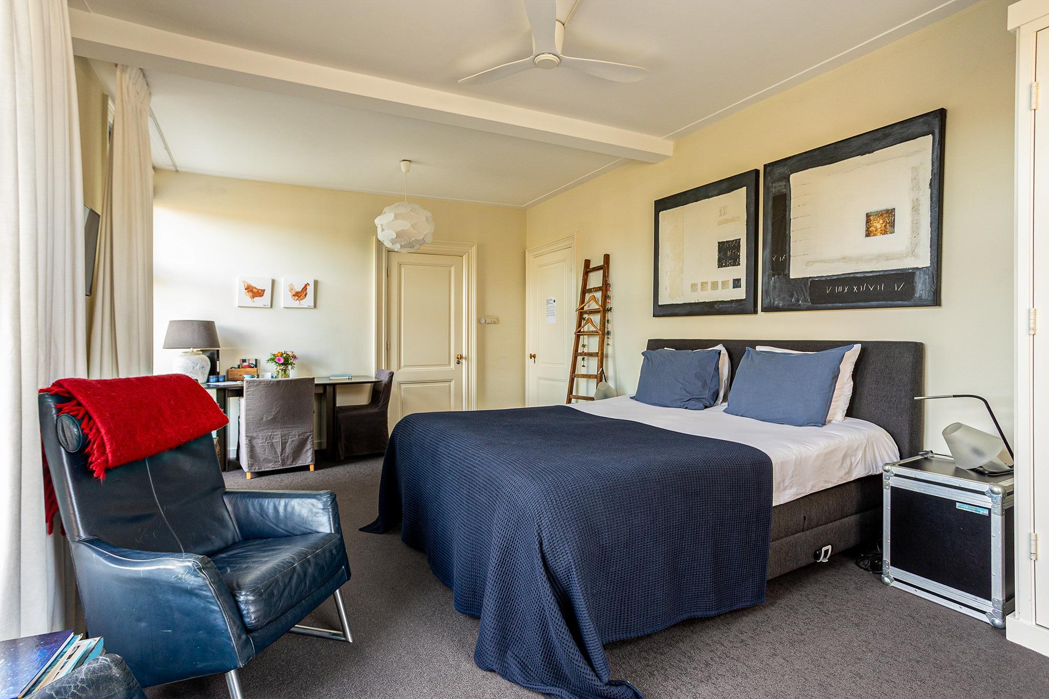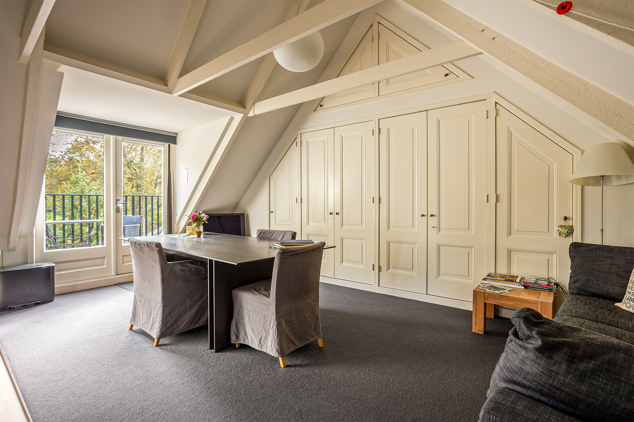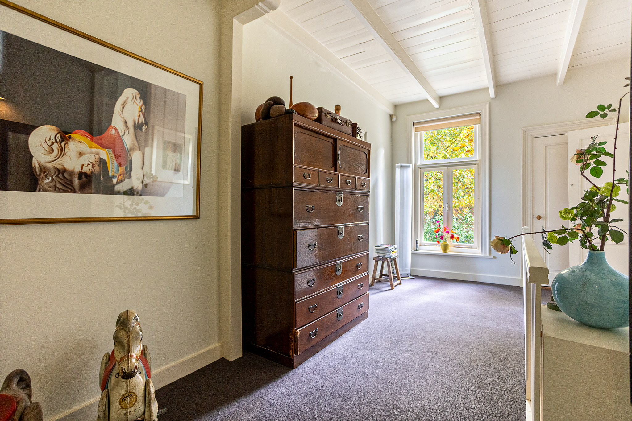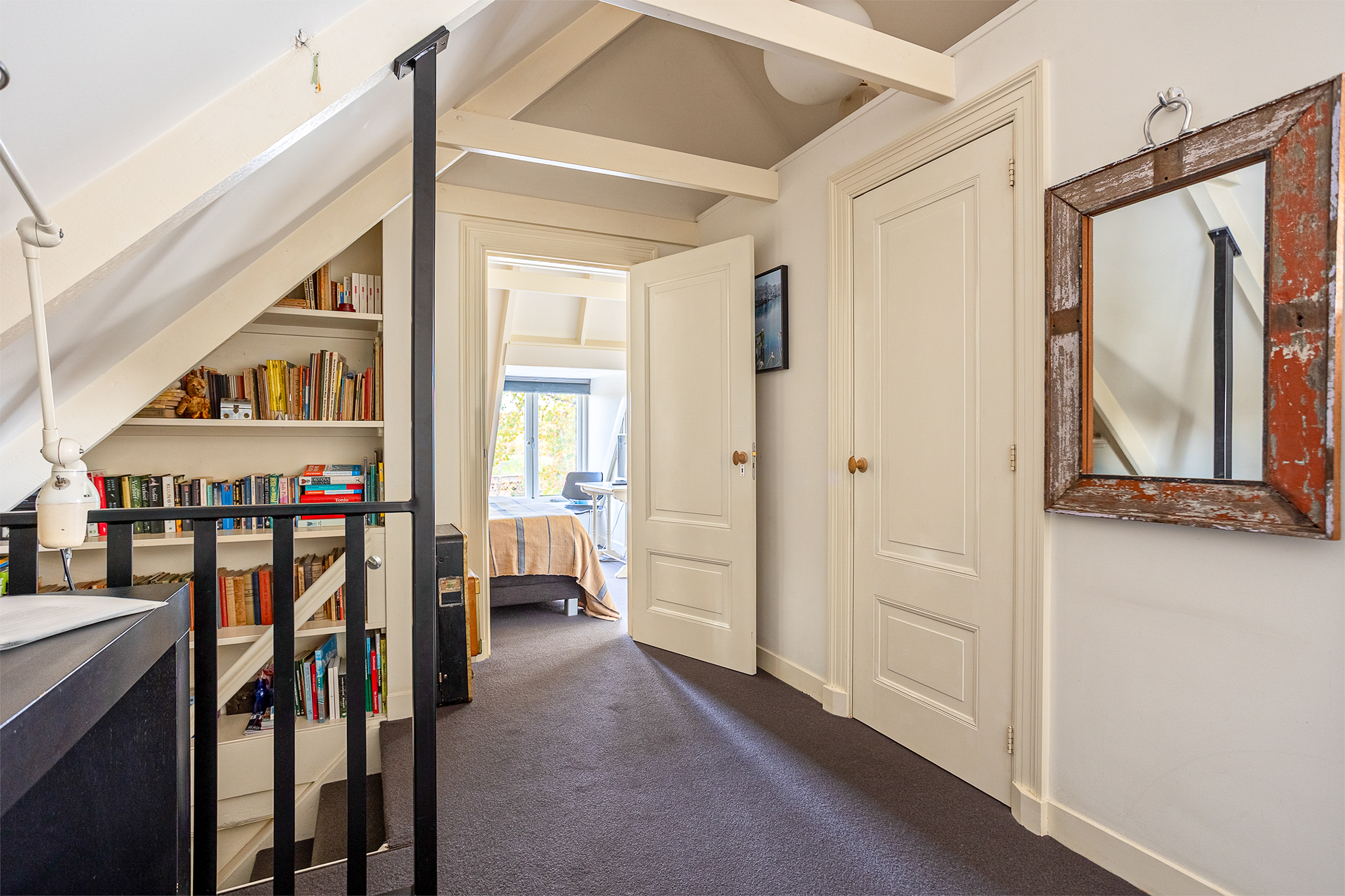 Deze verdieping biedt een verrassend ruime en zelfstandige woonlaag. Vanaf de overloop bereikt u een royale living/woonkamer met hoge nok en goed lichtinval. Deze sfeervolle ruimte is multifunctioneel in te richten, bijvoorbeeld als tweede living, master bedroom of evt. zelfstandig appartement voor gasten. Langs de gehele wand bevindt zich een praktische vaste kastenwand met veel opbergruimte.