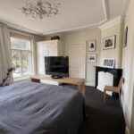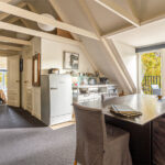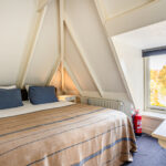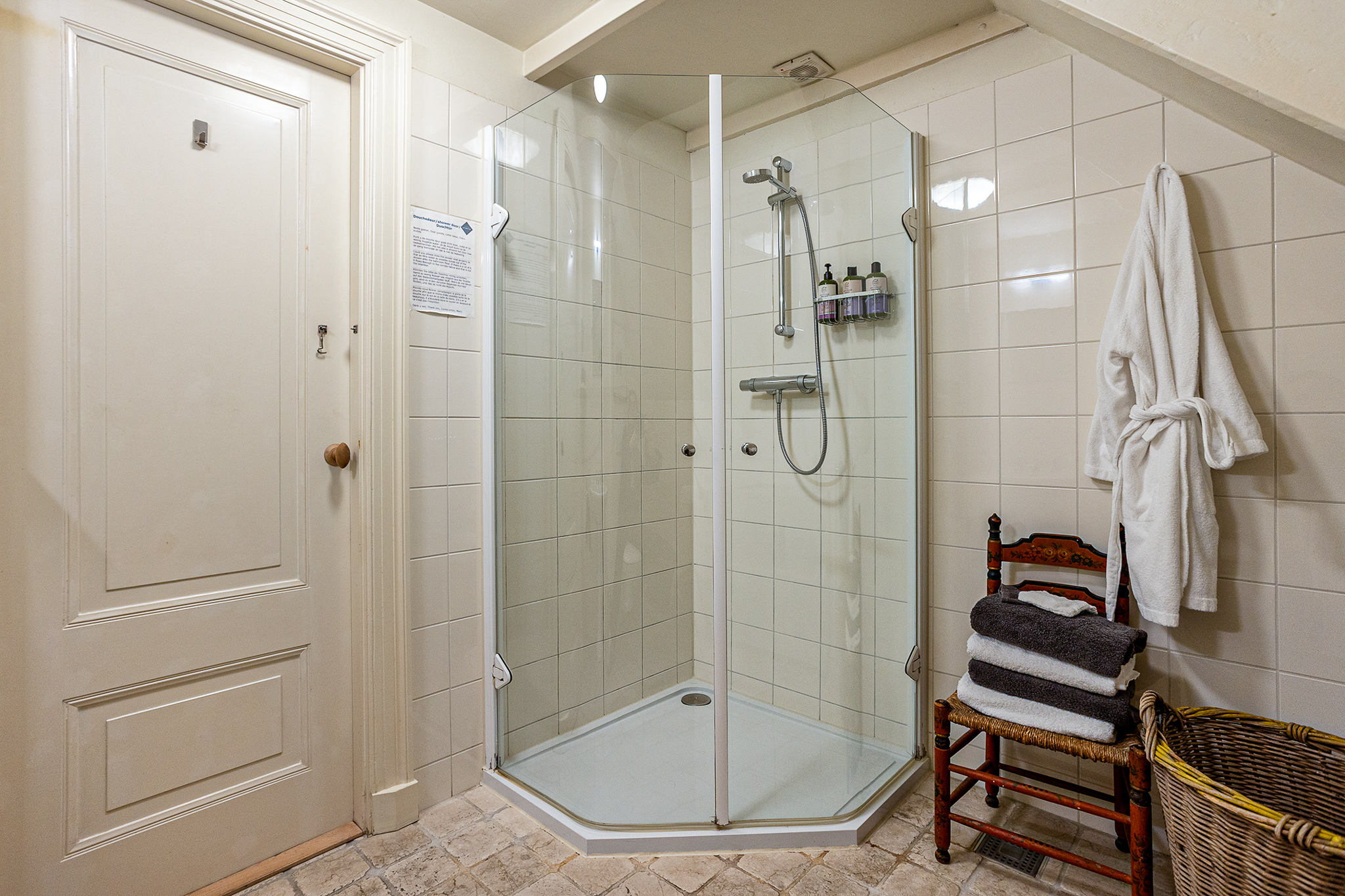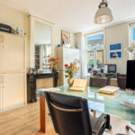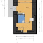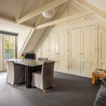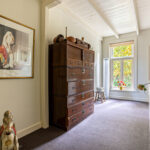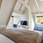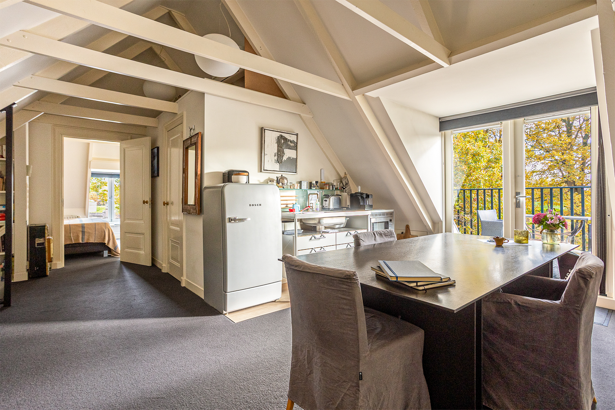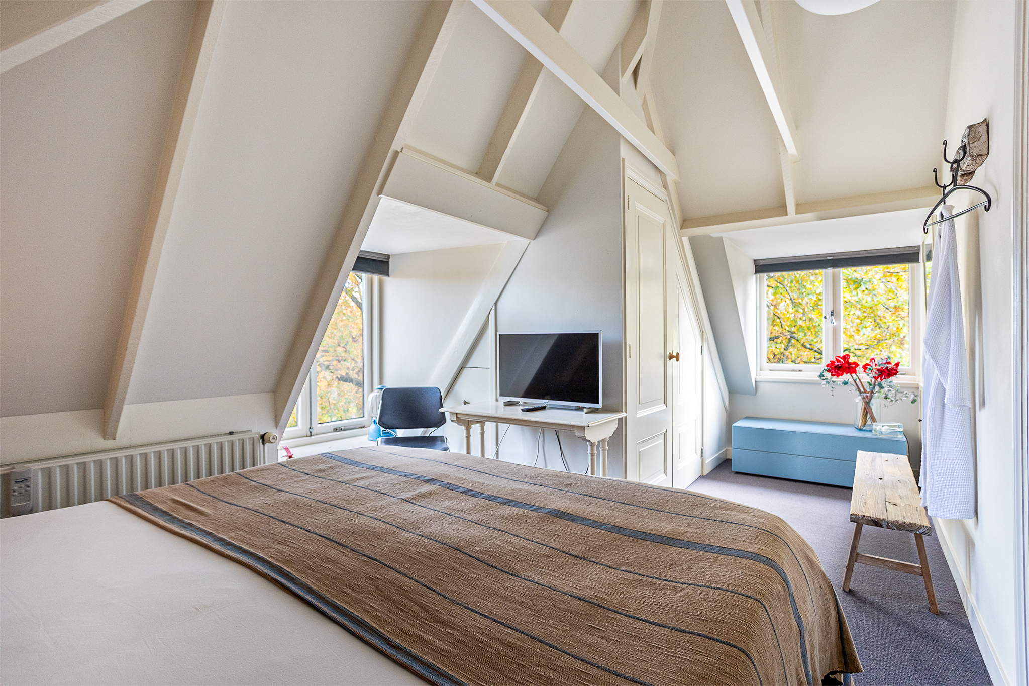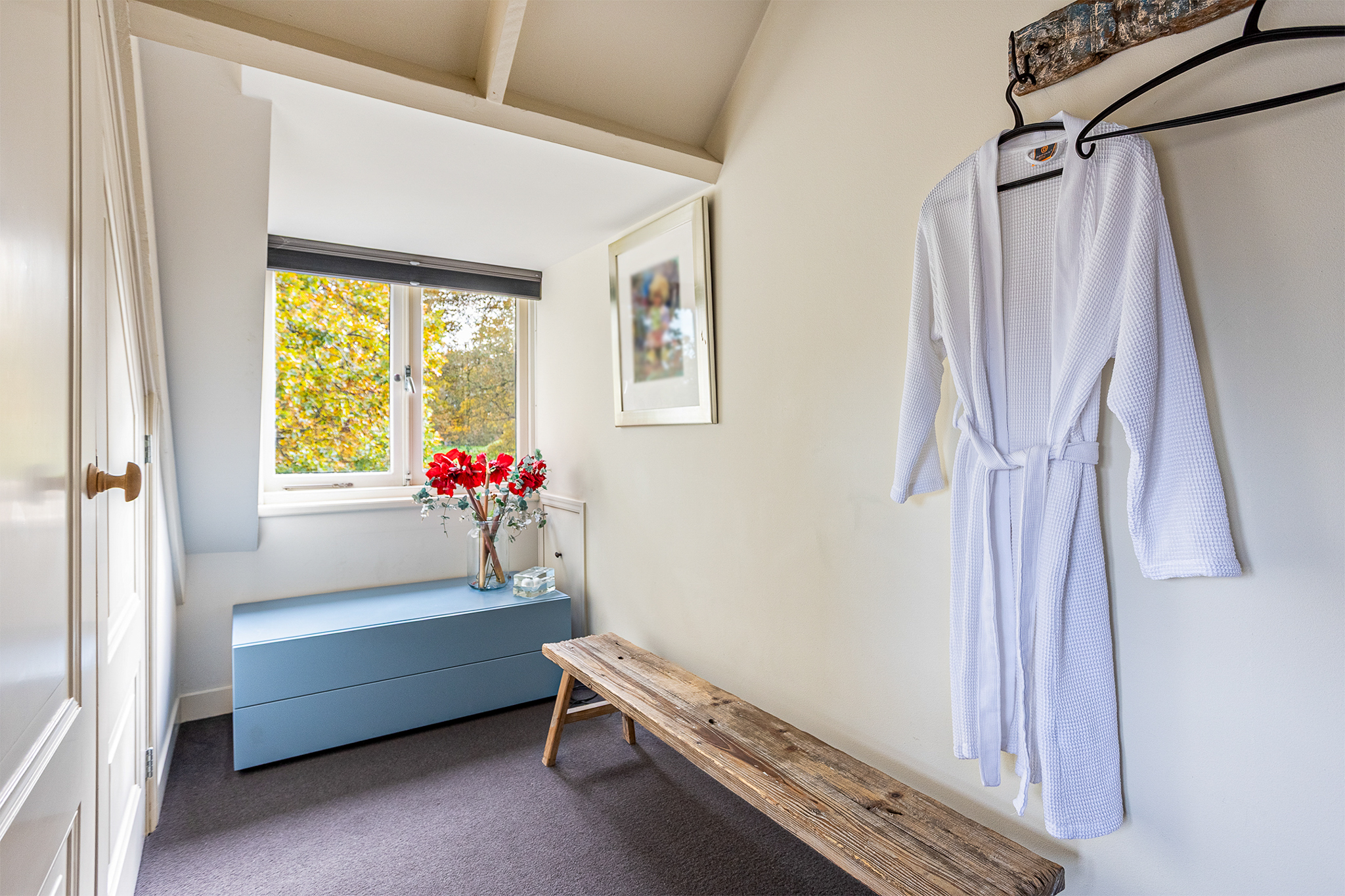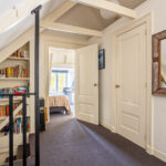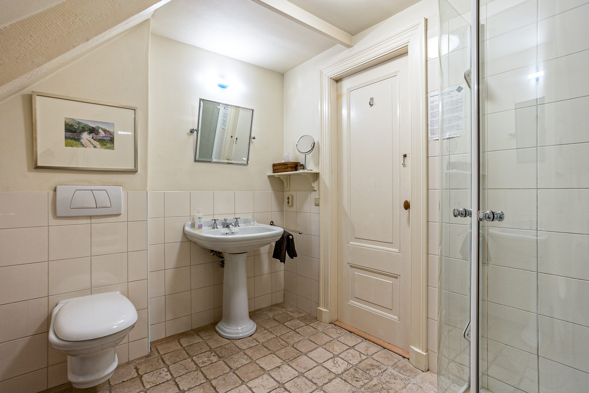 Deze verdieping biedt een verrassend ruime en zelfstandige woonlaag. Vanaf de overloop bereikt u een royale living/woonkamer met hoge nok en goed lichtinval. Deze sfeervolle ruimte is multifunctioneel in te richten, bijvoorbeeld als tweede living, master bedroom of evt. zelfstandig appartement voor gasten. Langs de gehele wand bevindt zich een praktische vaste kastenwand met veel opbergruimte.