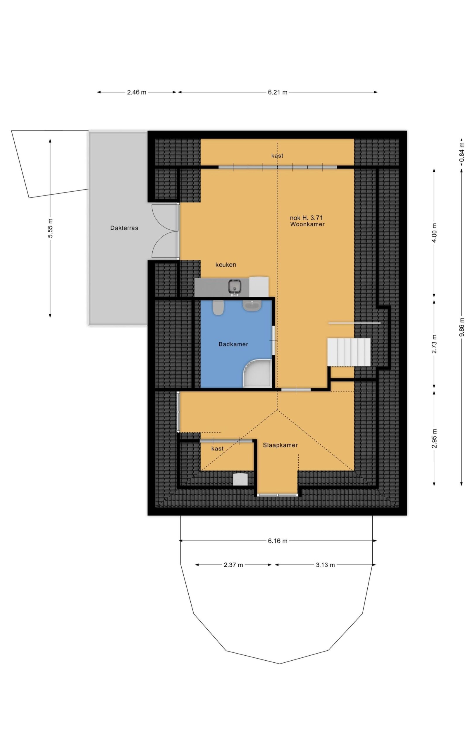 Aan de achterzijde is het dakterras, met ligging zuid en bereikbaar via openslaande deuren vanuit de woonkamer. Hier geniet u in alle privacy van de zon en het uitzicht! Verder beschikt deze verdieping over een tweede keuken, ideaal voor gasten of als extra gemak bij het gebruik van het dakterras. Aangrenzend vindt u de badkamer, voorzien van wastafel(s), toilet en inloopdouche. Tot slot is er nog een ruime slaapkamer met vaste kast. Door de slimme indeling en het vele licht is deze verdieping een volwaardige woonetage.