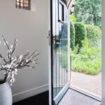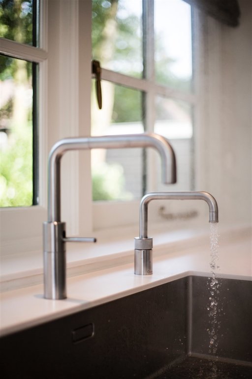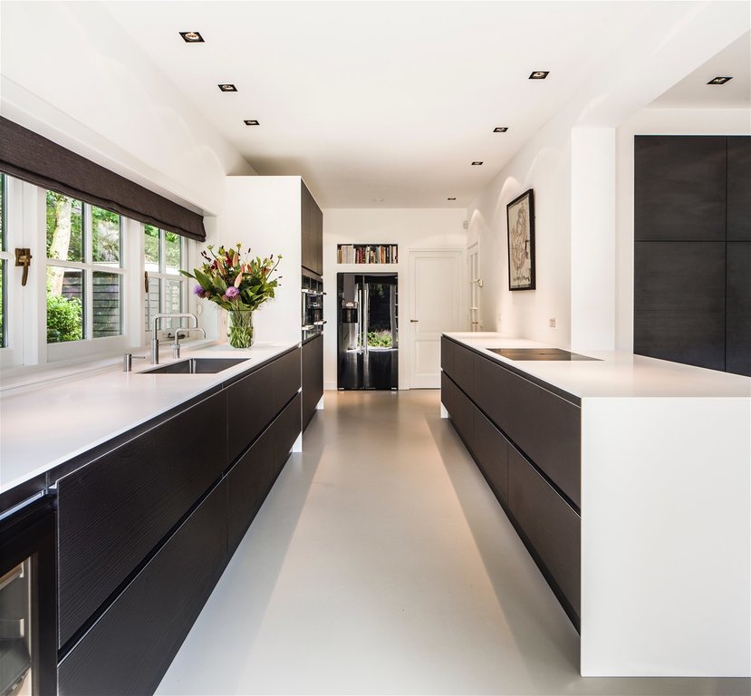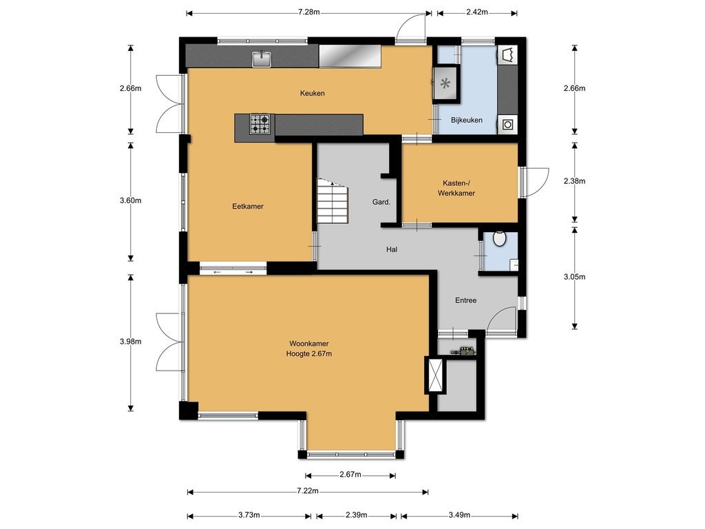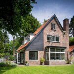Entree, hal, meterkast, garderobe, provisiekelder, modern toilet met fontein, ruime leefkeuken, voorzien van inbouwapparatuur, openslaande deuren en aangrenzend het eetgedeelte met gashaard. De hal en keuken hebben een prachtige gietvloer met vloerverwarming. Gezellige woonkamer met erker, openhaard en houten vloer. Vanuit de hal komt u tevens in een werk-/kastenkamer.…