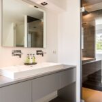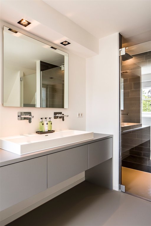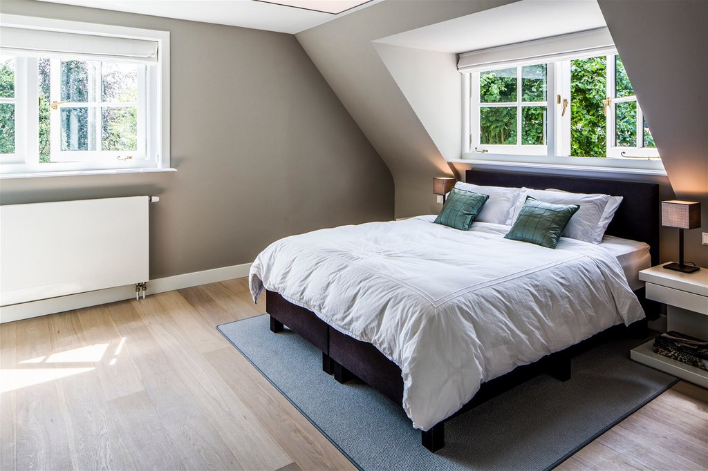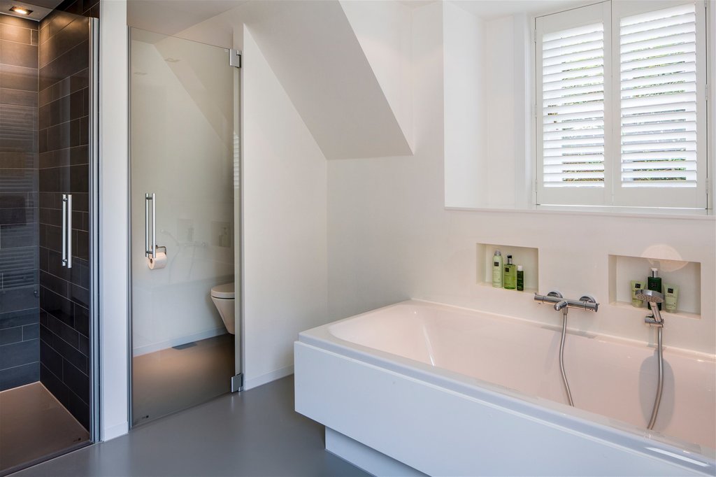 Overloop, 2 slaapkamers met gedeelde badkamer en-suite voorzien van toilet, wastafel, inloopdouche en vloerverwarming, ruime ouderslaapkamer met eigen badkamer voorzien van ligbad, inloopdouche, toilet, dubbel wastafelmeubel en vloerverwarming.