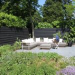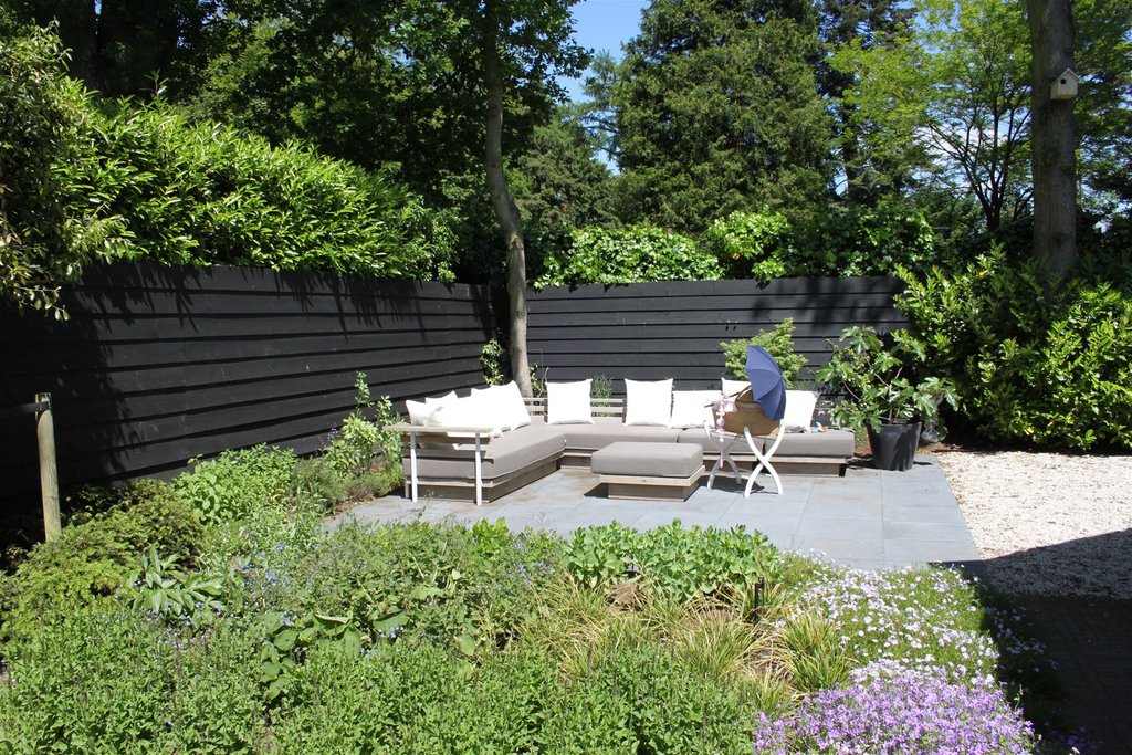 De fraai aangelegde tuin met schuur biedt veel privacy, heeft meerdere terrassen en heeft de gehele dag zon. De tuin beschikt over een sproei-installatie met eigen bron.