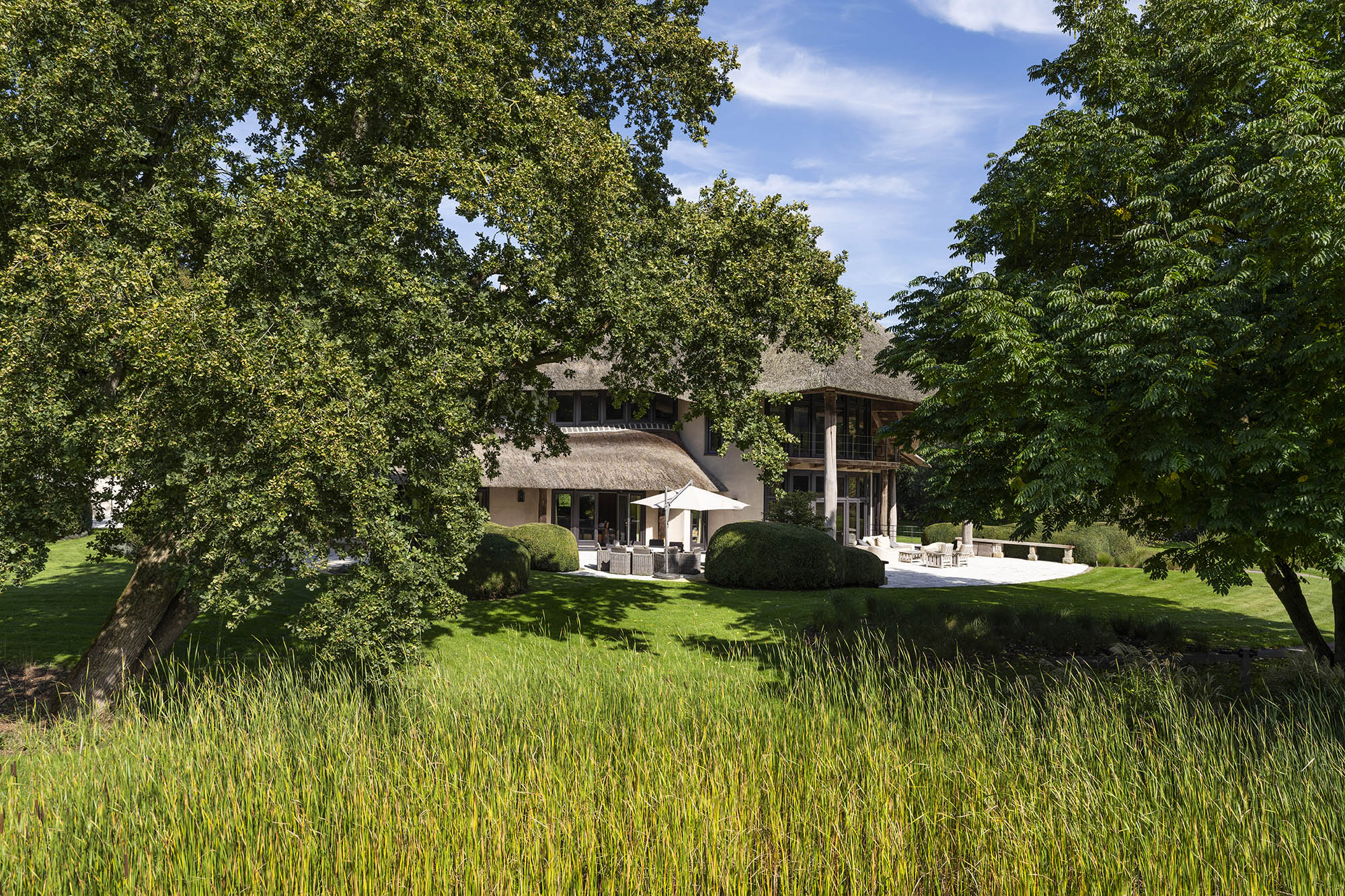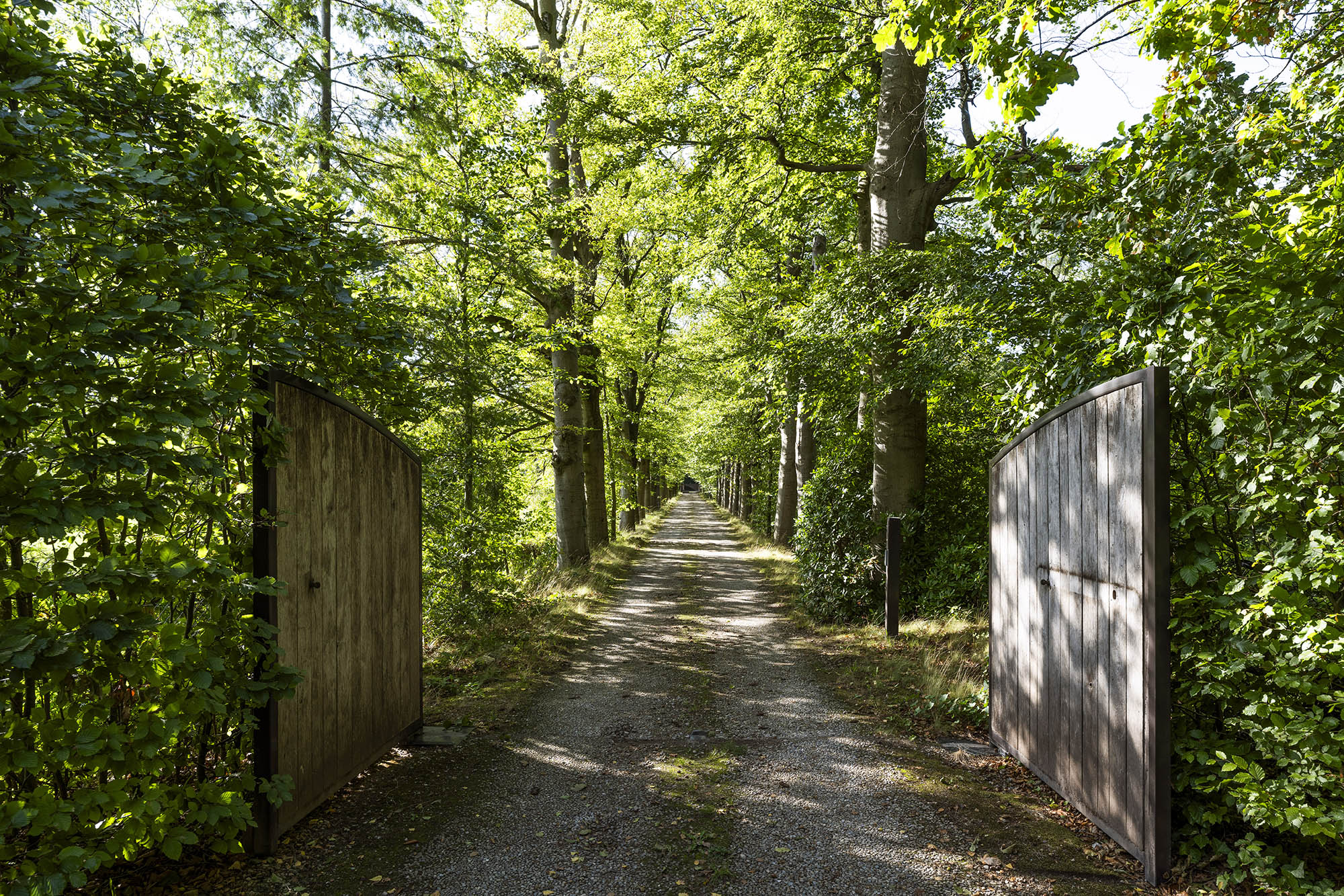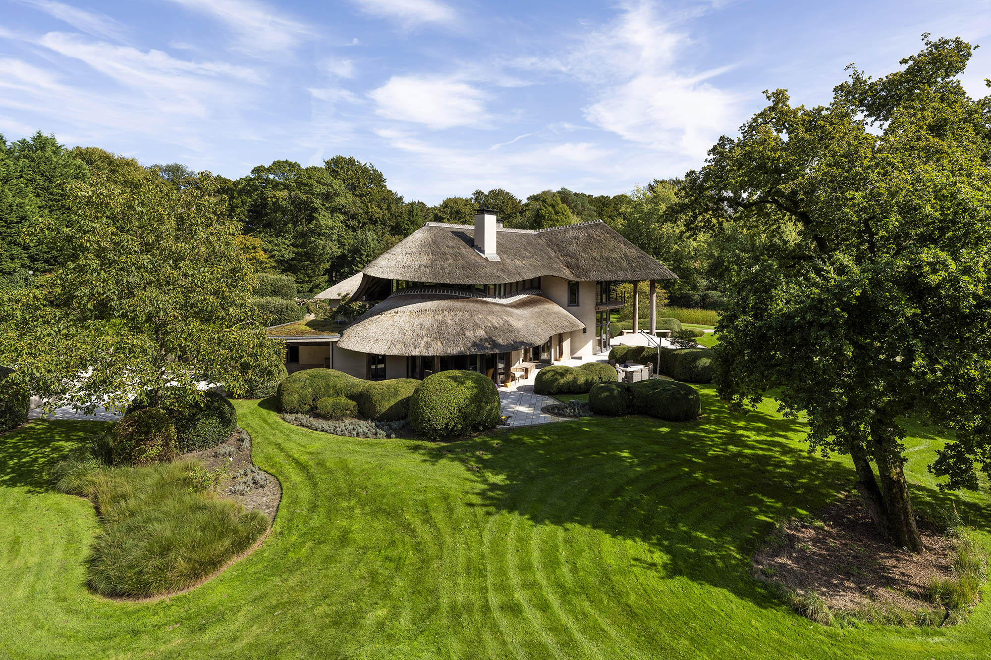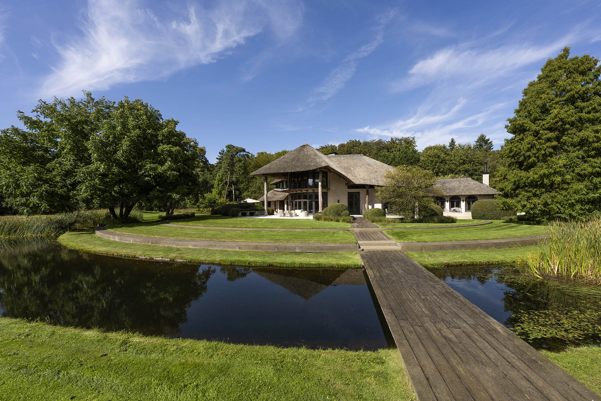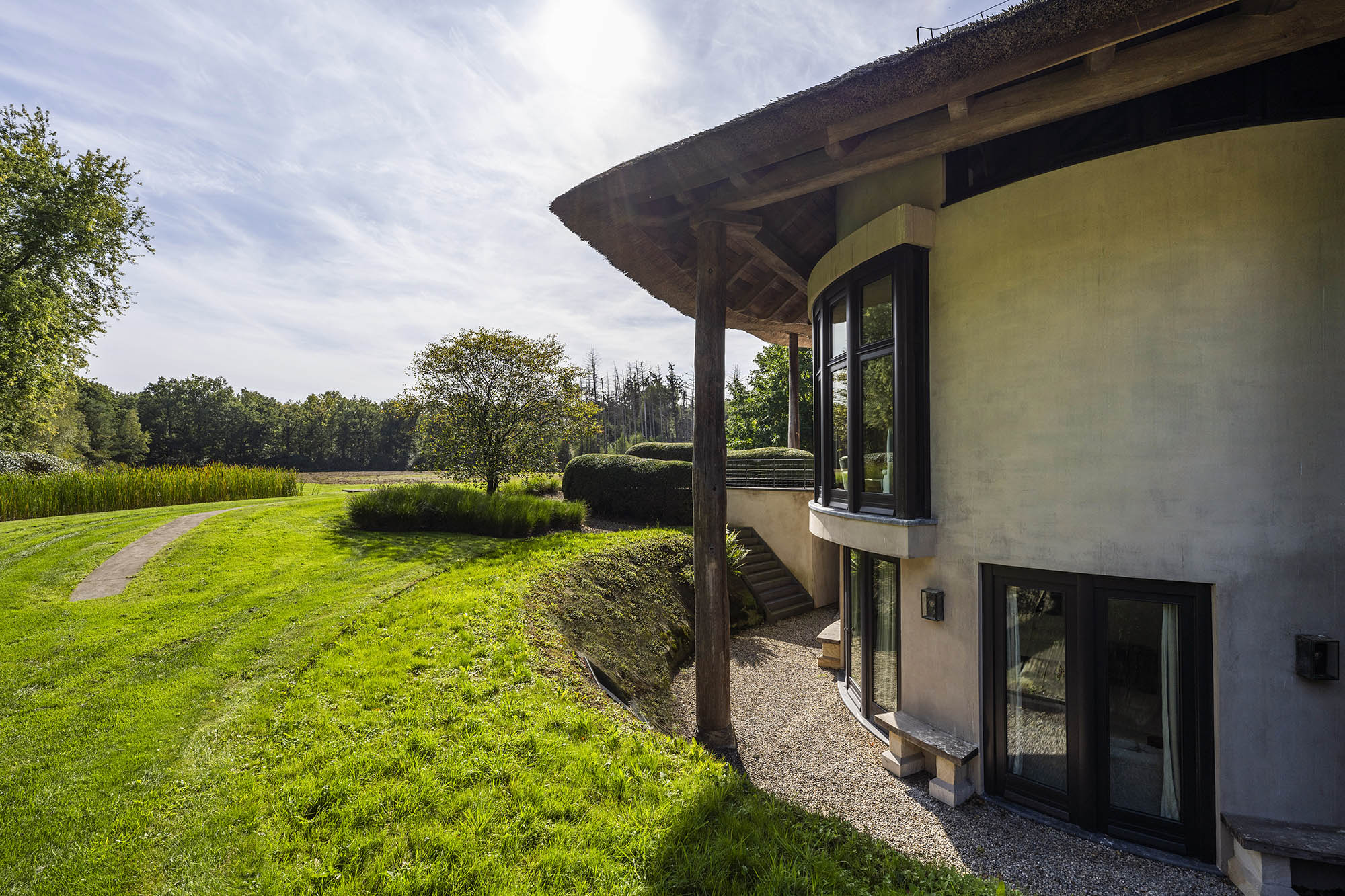 Aan de Soestdijkerweg wijst niets erop dat achter het groen een statige oprijlaan schuilgaat die leidt naar een waar paradijs. De laan slingert ruim driehonderd meter door eeuwenoud bos, tot plots het landhuis zichtbaar wordt, een sculpturaal bouwwerk, ontworpen door de Antwerpse architect Axel Vervoordt. Het is een huis dat lijkt te ademen met zijn omgeving: met ronde vormen, natuurlijke kleuren en materialen die opgaan in het landschap. Hier geen harde lijnen, maar vloeiende overgangen tussen binnen en buiten, tussen wonen en beleven.