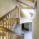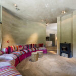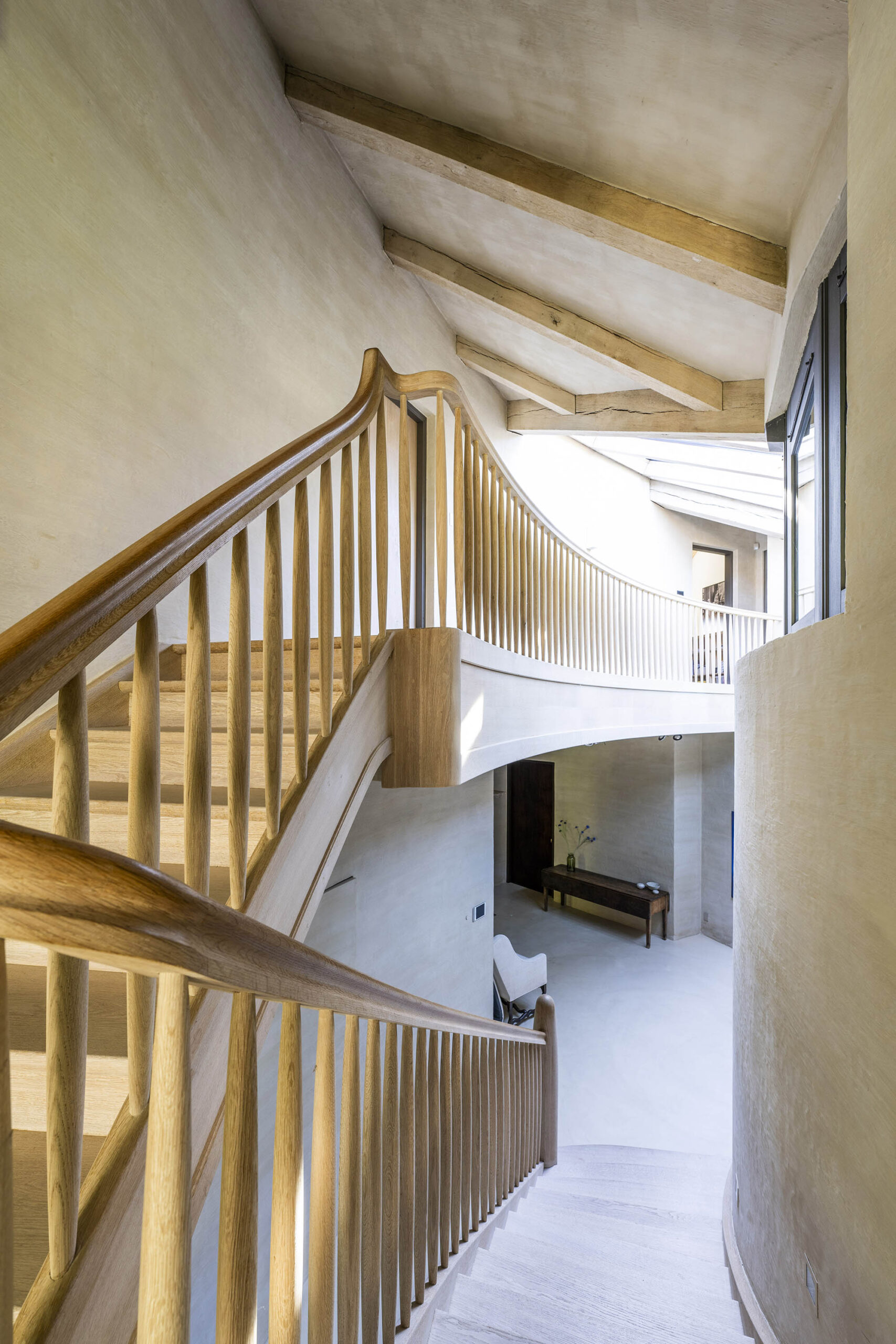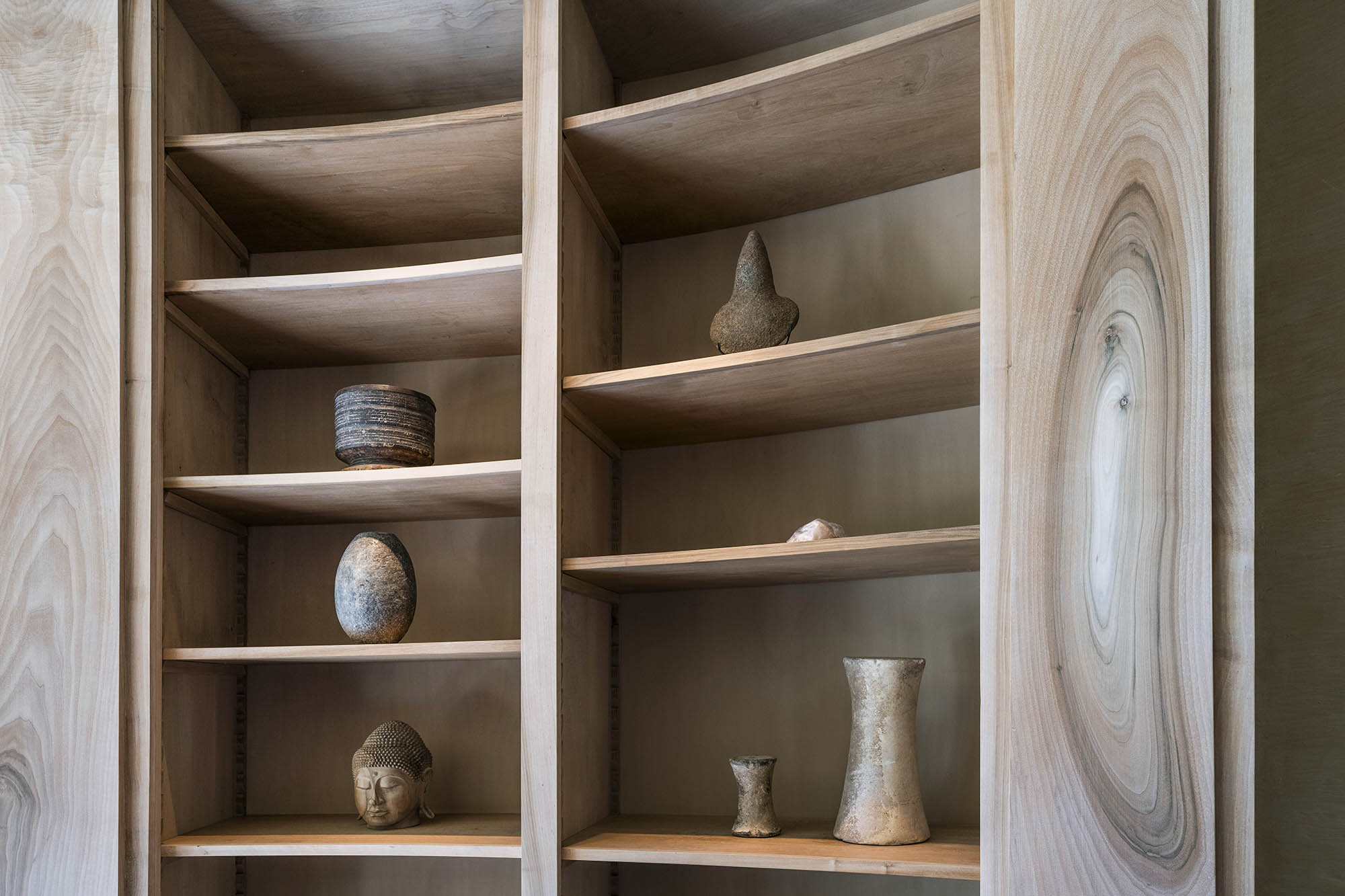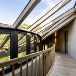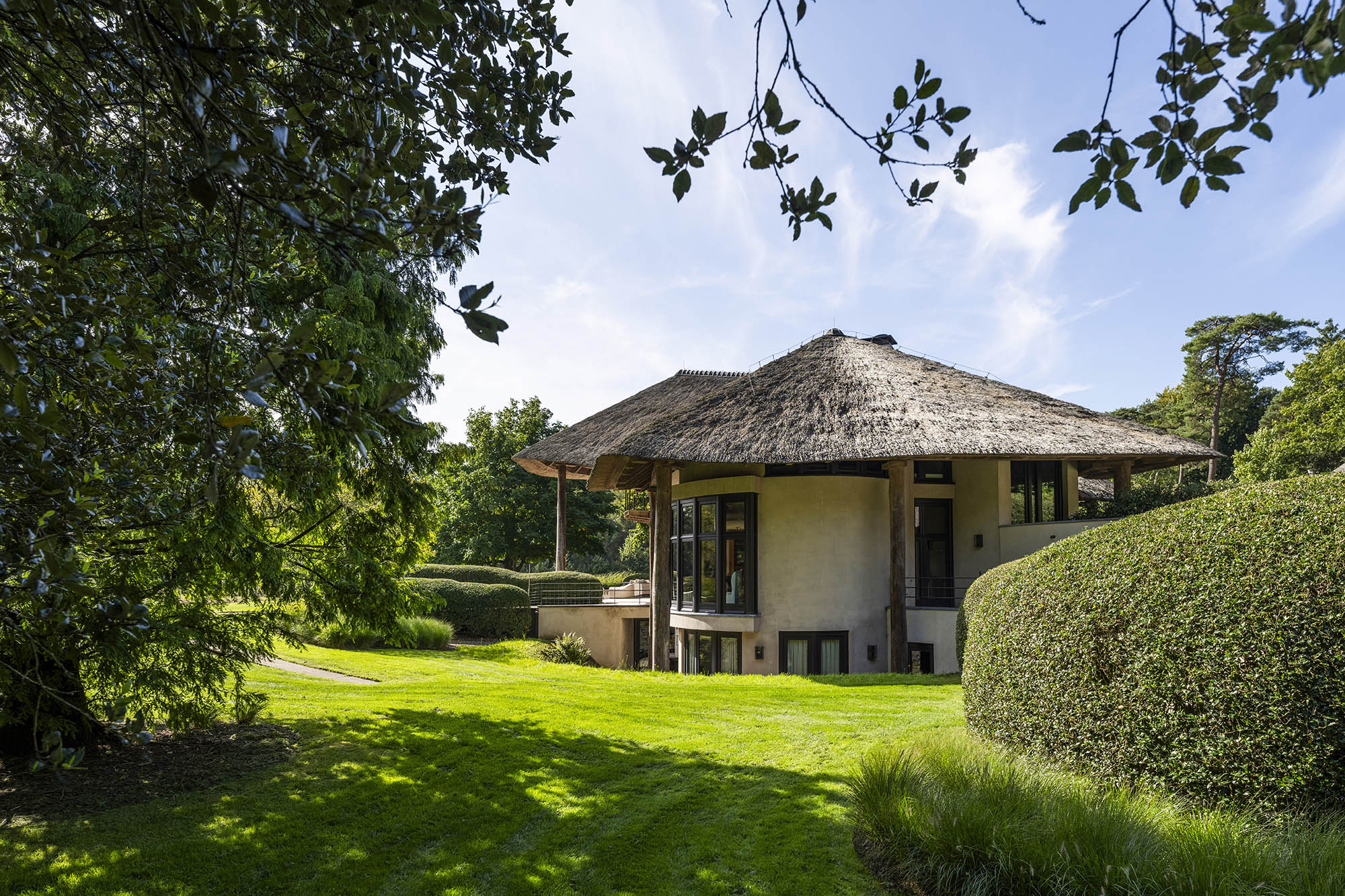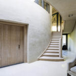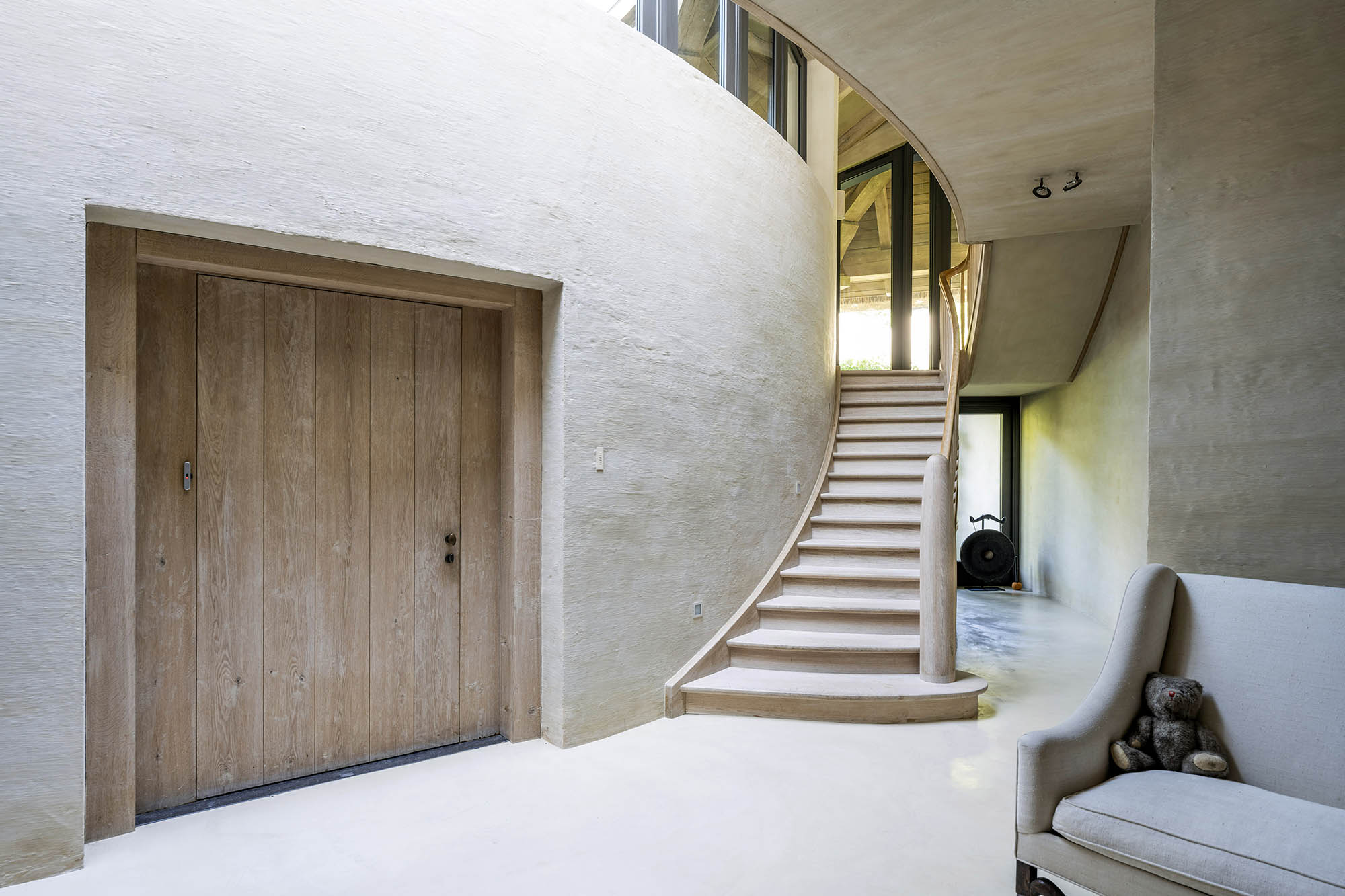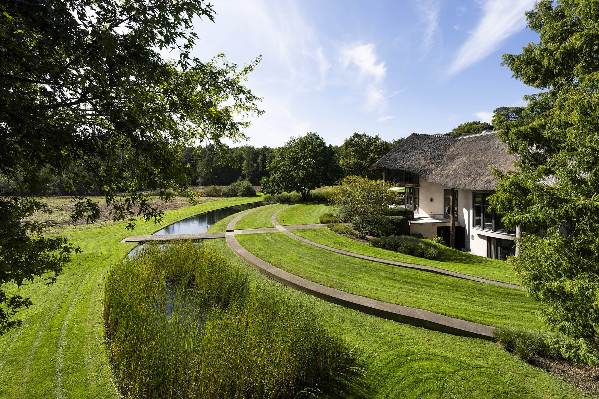 Aan de Soestdijkerweg wijst niets erop dat achter het groen een statige oprijlaan schuilgaat die leidt naar een waar paradijs. De laan slingert ruim driehonderd meter door eeuwenoud bos, tot plots het landhuis zichtbaar wordt, een sculpturaal bouwwerk, ontworpen door de Antwerpse architect Axel Vervoordt. Het is een huis dat lijkt te ademen met zijn omgeving: met ronde vormen, natuurlijke kleuren en materialen die opgaan in het landschap. Hier geen harde lijnen, maar vloeiende overgangen tussen binnen en buiten, tussen wonen en beleven.
