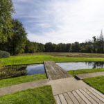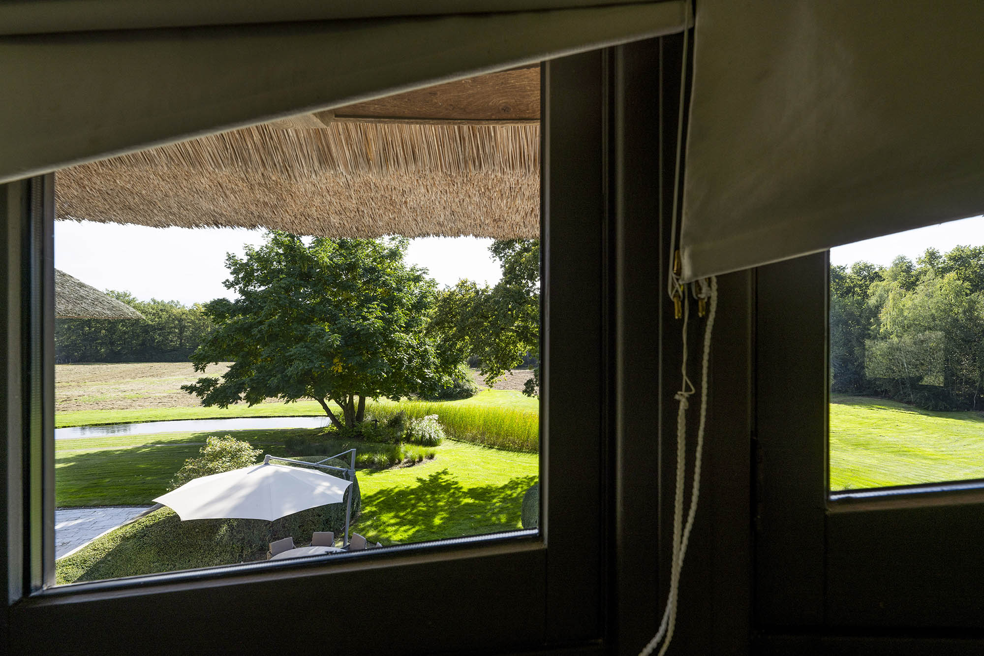 Aan de andere zijde van de woning liggen twee lichte woonkamers met uitzicht op de vijver, de houten vlonder en de weide daarachter. De verbinding tussen binnen en buiten is overal voelbaar: het uitzicht is telkens onderdeel van het interieur.