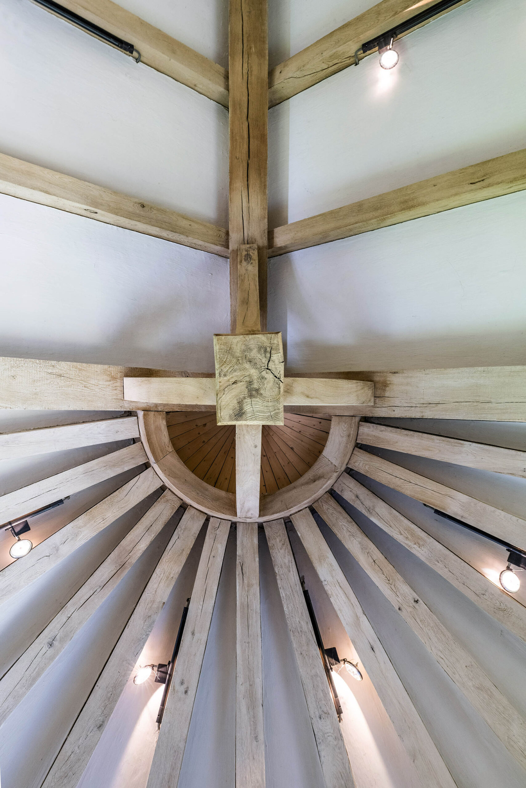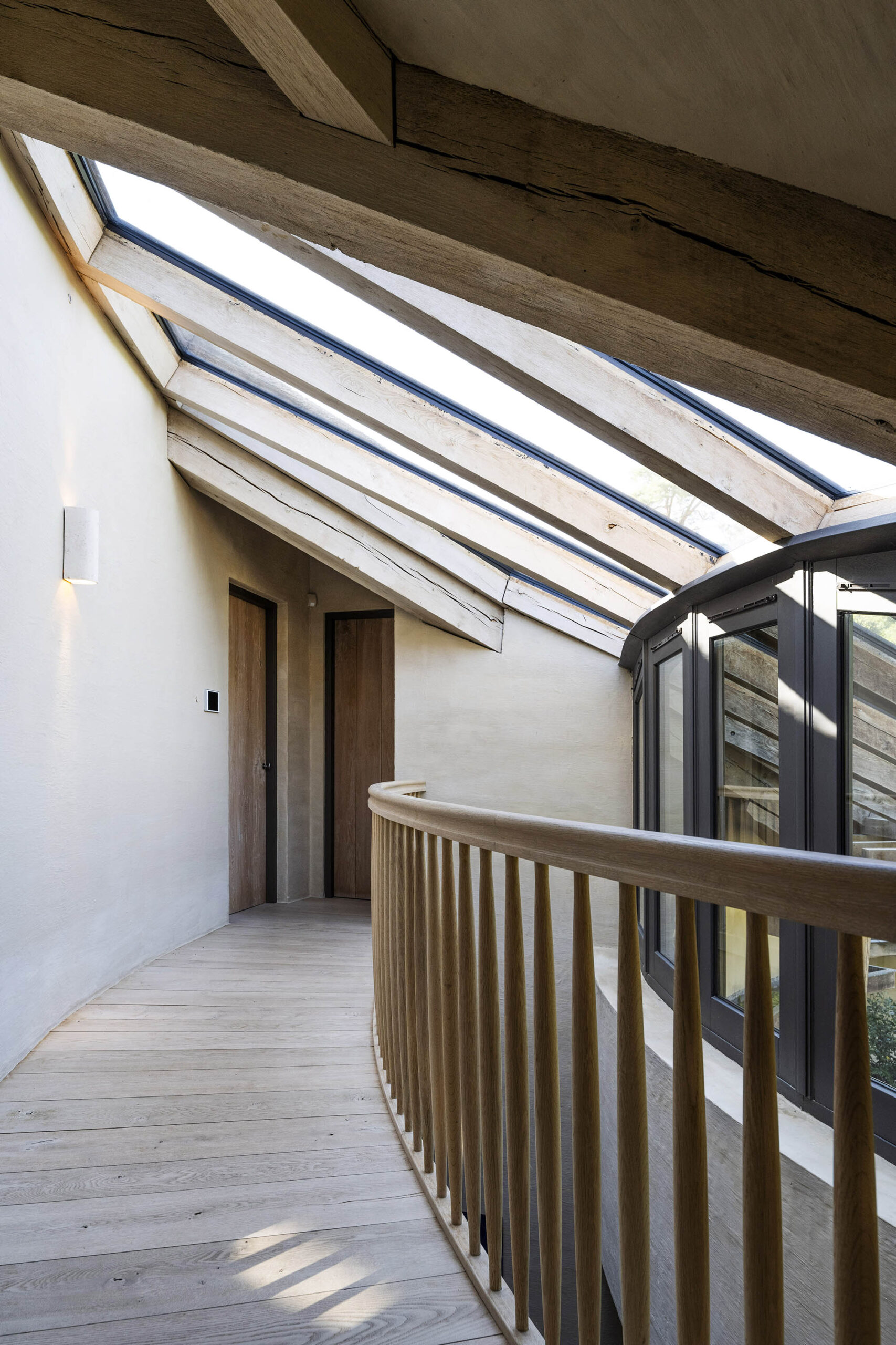 Op de verdieping bevinden zich drie luxe suites, elk met een eigen badkamer. De master suite beschikt over een royale slaapkamer, een walk-in closet met cederhouten kasten en een verfijnde badkamer met spiraalvormige wand en dubbele inloopdouche. De zichtbare eikenhouten kapconstructie, afkomstig uit de bossen rond Leipzig, geeft karakter en warmte.