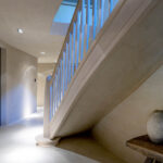 Bij binnenkomst wordt u verwelkomd door licht en warmte. Via de imposante eikenhouten voordeur betreedt u de centrale hal met open haard, waar het daglicht door het glazen dak via de vide naar binnen stroomt. De vloeiende lijnen van de muren, de natuurlijke kleuren van het stucwerk en de zachte overgangen tussen ruimtes zorgen voor een rustgevend geheel. Het stucwerk is van de hand van Eddy Dankers, wiens ambachtelijke afwerking beroemd is tot ver buiten de landsgrenzen.