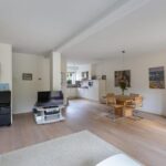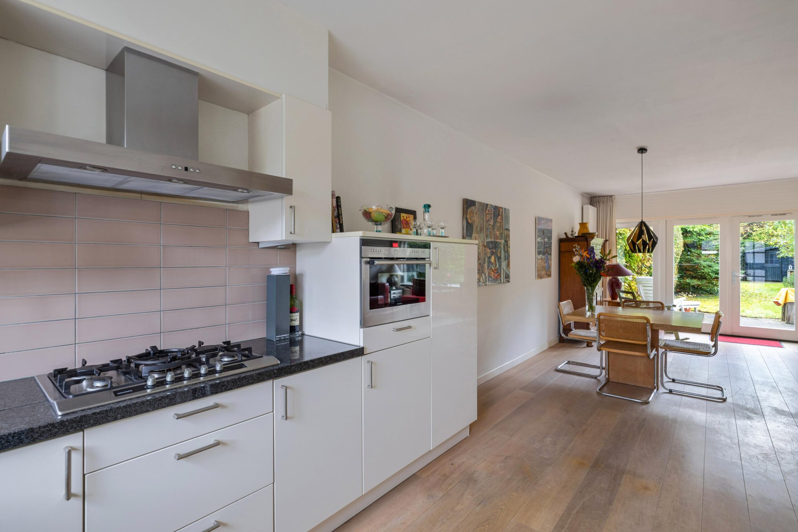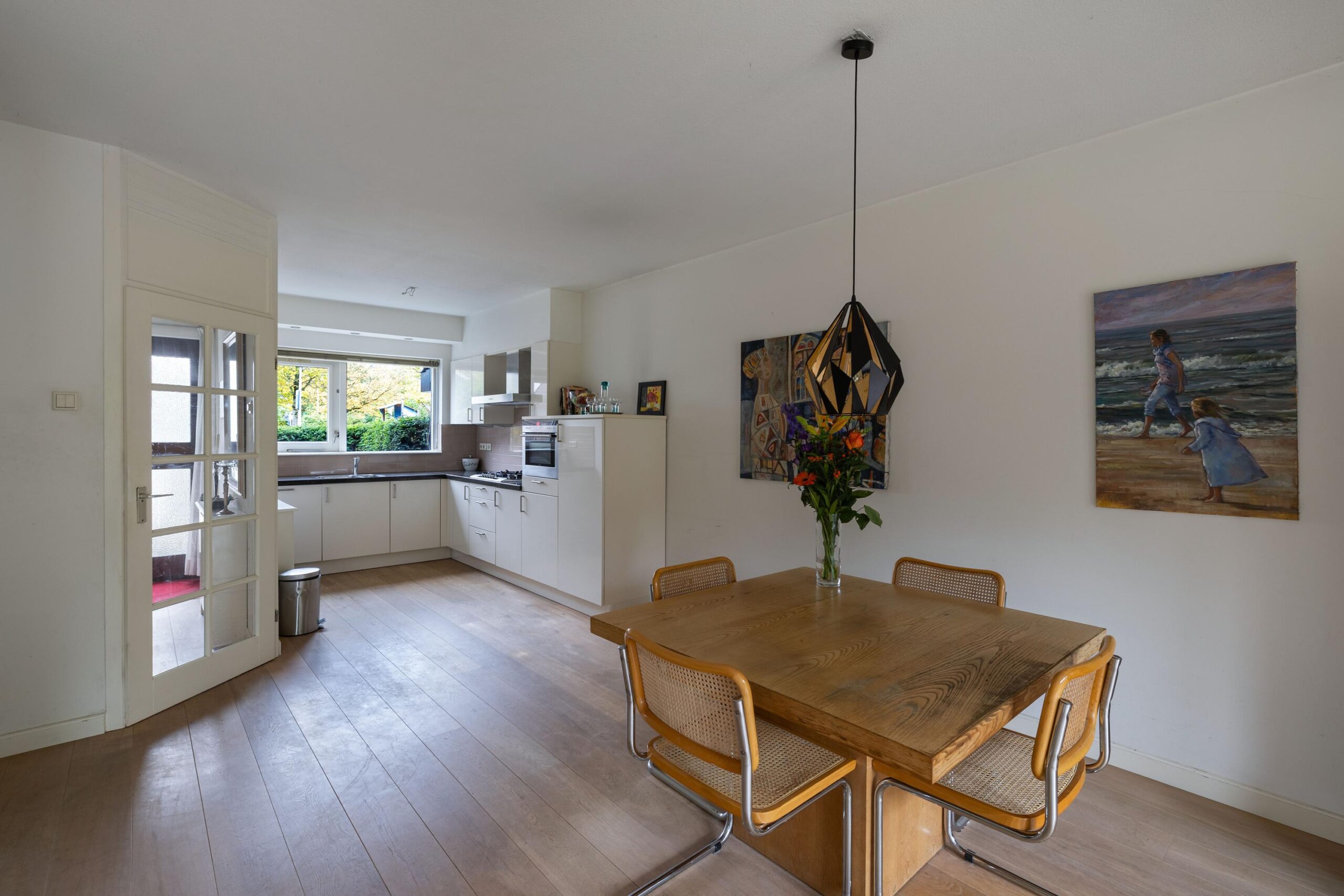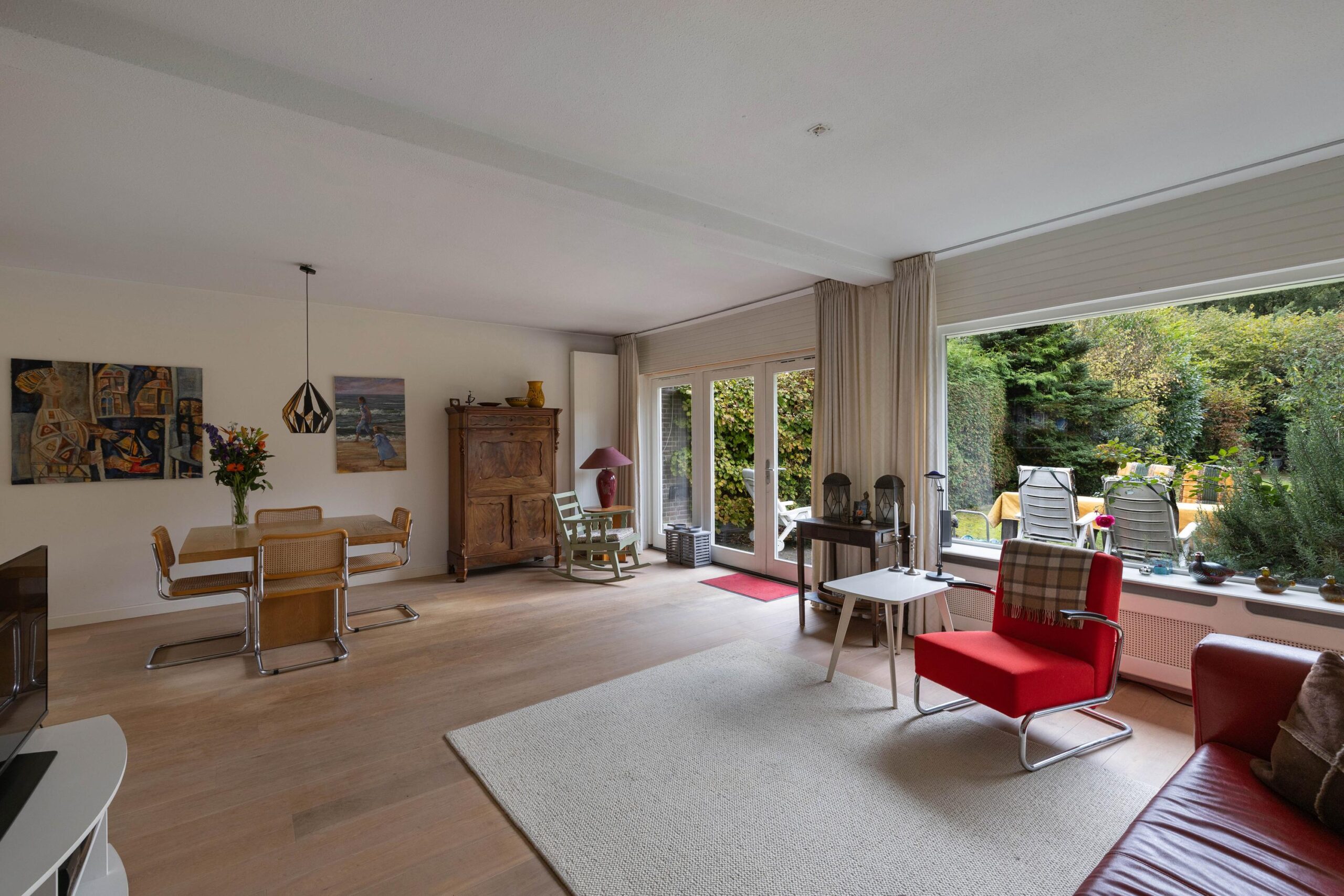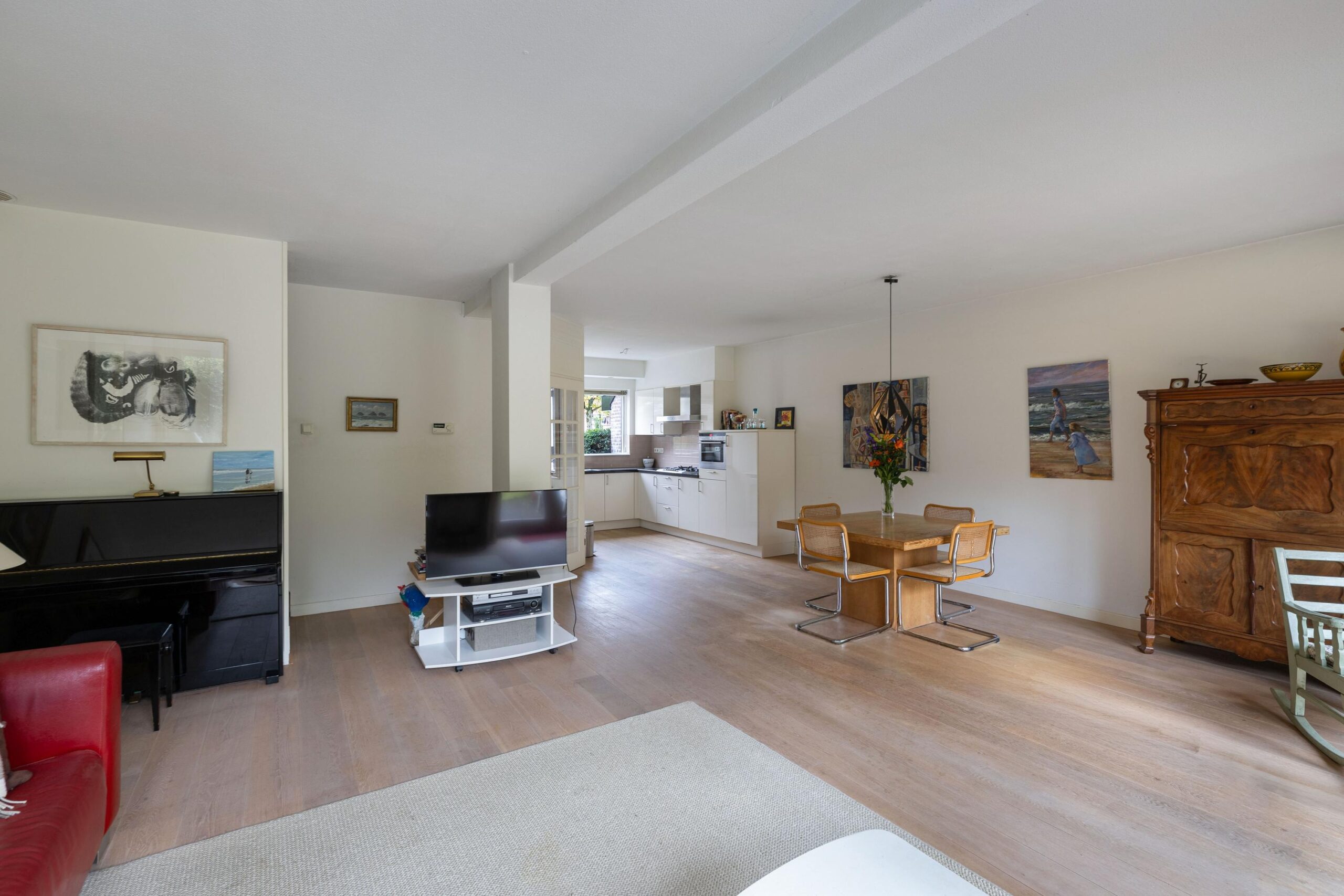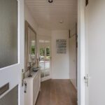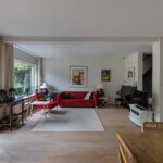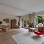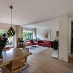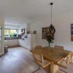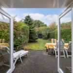 eiken houten vloer en openslaande deuren naar de zonnige achtertuin.