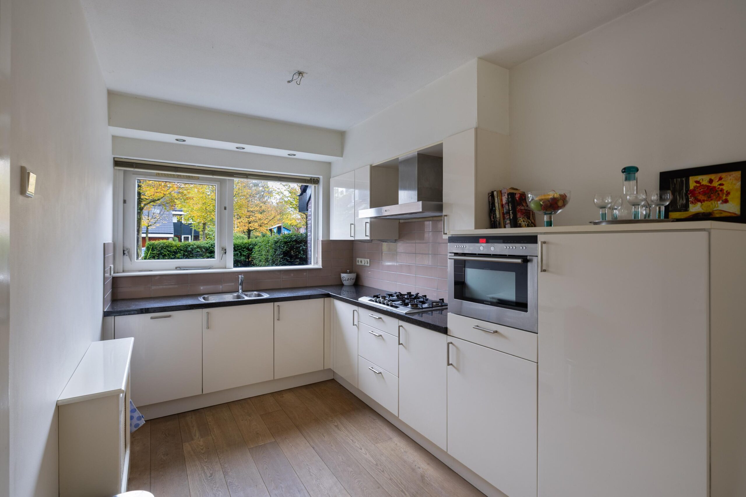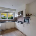Moderne keuken heeft uitzicht op het plein en is voorzien van natuurstenen blad, 5 pits gaskookplaat, afzuigkap, vaatwasser, koelkast en combi oven/magnetron.