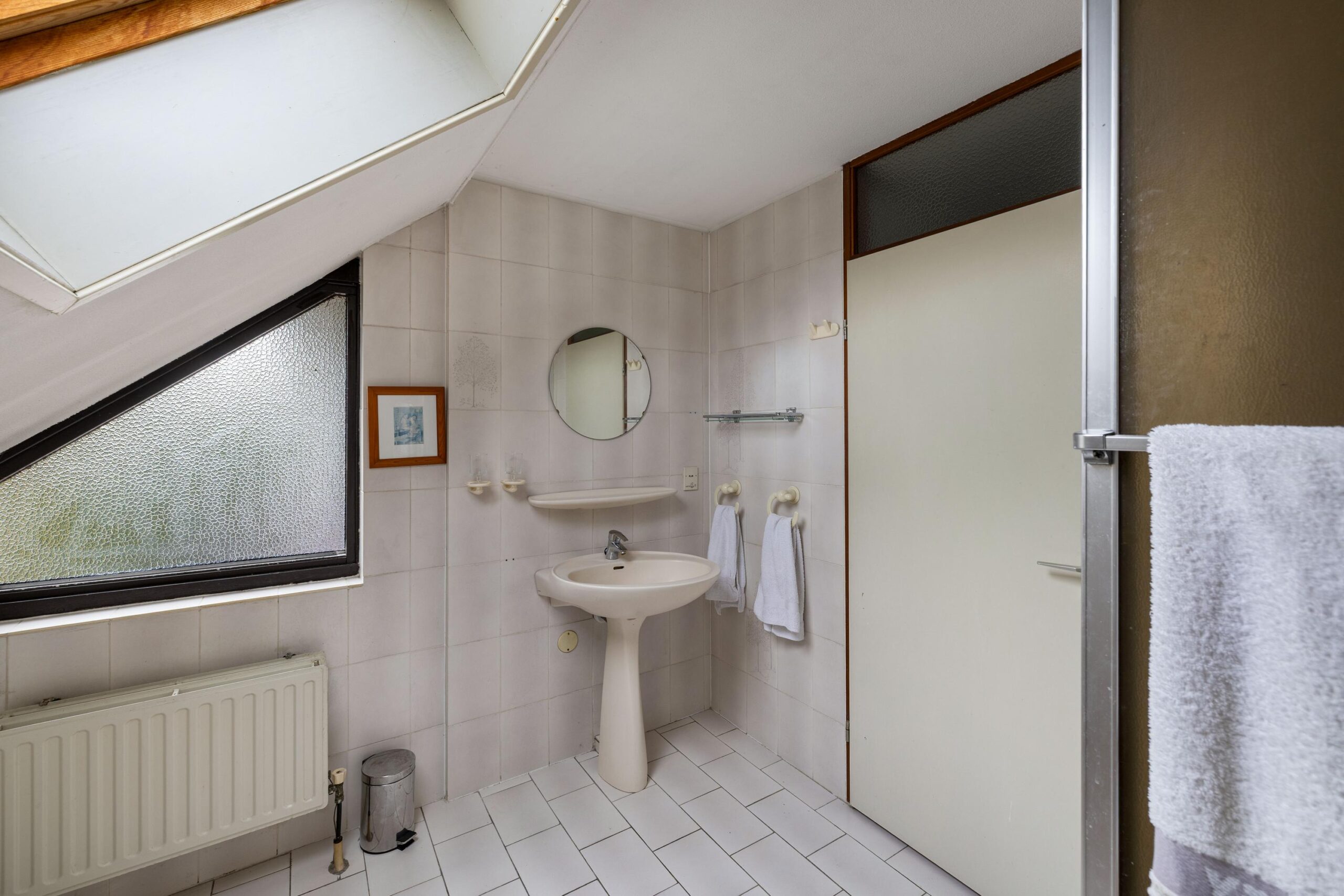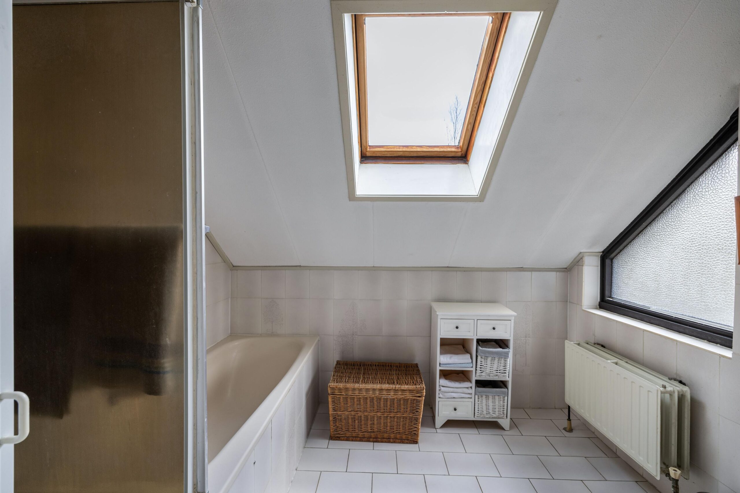 Overloop, ruime ouderslaapkamer aan de voorzijde, badkamer met ligbad, douchecabine en wastafel, separaat toilet met fonteintje op de overloop.