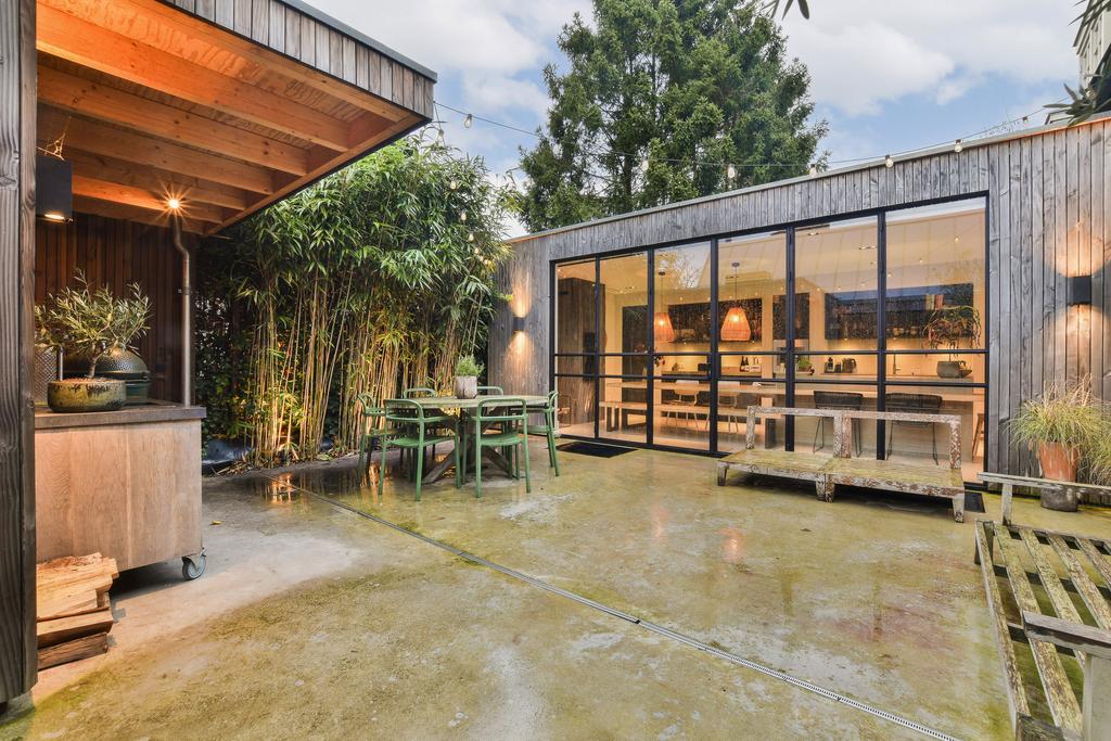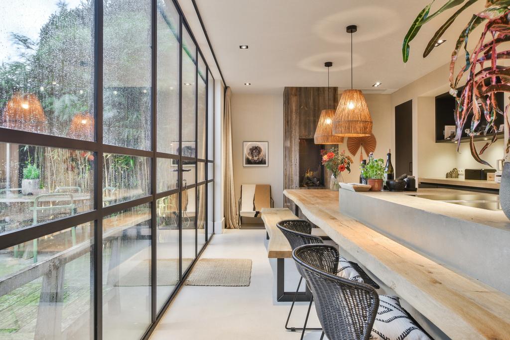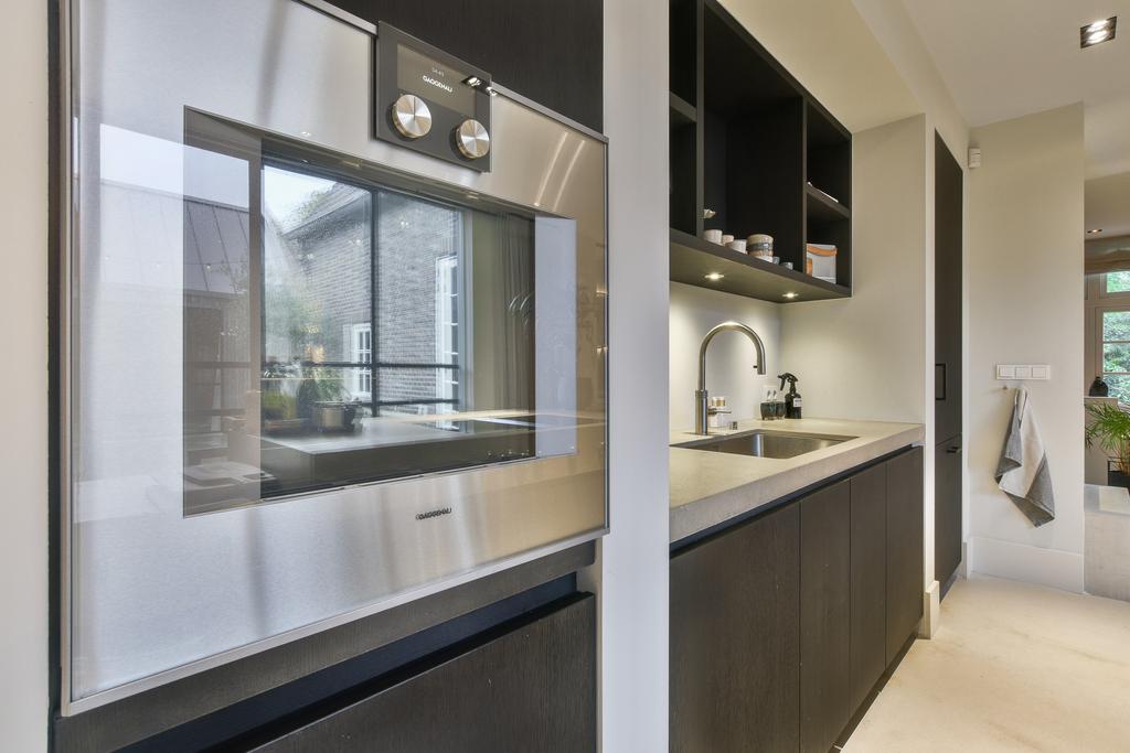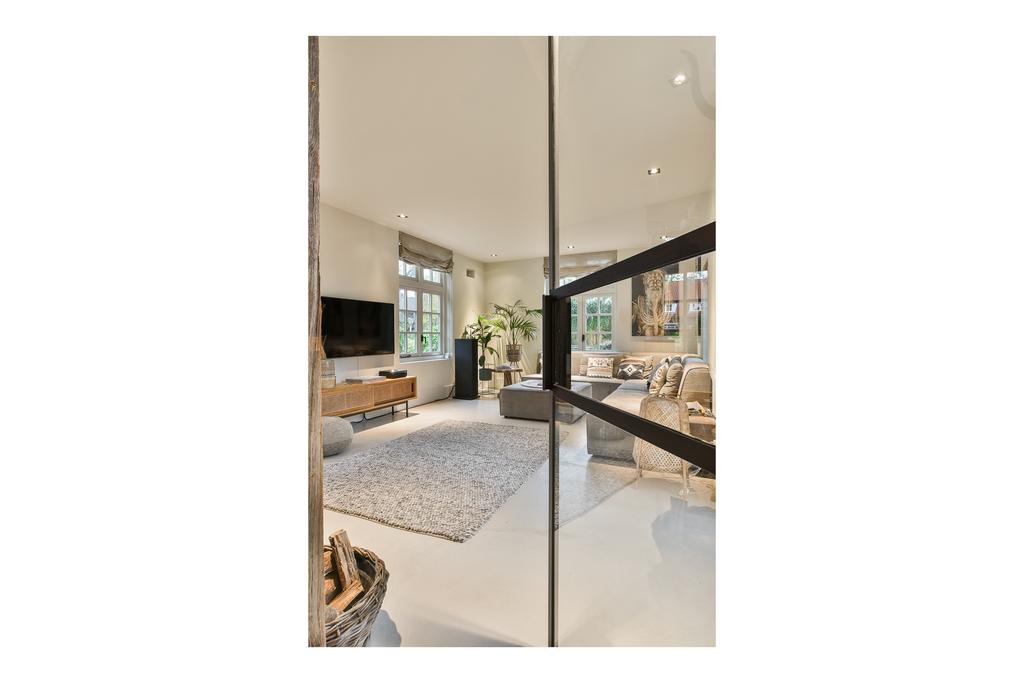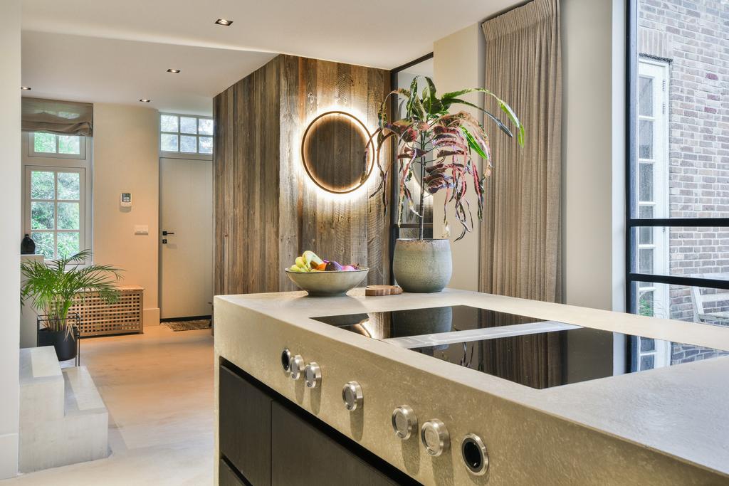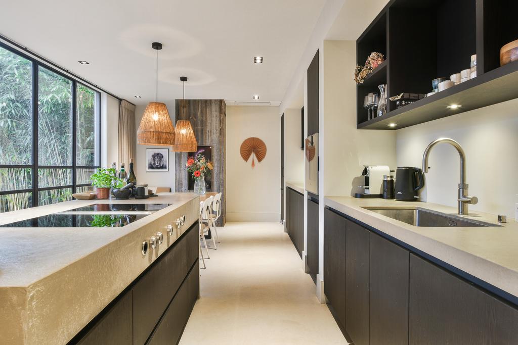 Entree, hal met garderobe, meterkast en toegang middels stalen deuren tot de sfeervolle living met open haard, gietvloer en openslaande deuren naar de achtertuin. De royale en sfeervolle en uitgebouwde leefkeuken met kookeiland, massief houten kasten, betonnen aanrechtblad, gashaard, airconditioning en stalen harmonica pui naar de achtertuin is van alle luxe voorzien: o.a. Quooker, Gaggenau inbouwapparatuur, Bora Professional kookplaat en afzuiger. Overigens is de gehele begane grond vloer voorzien van beton ciré/mortex vloeren met vloerverwarming.