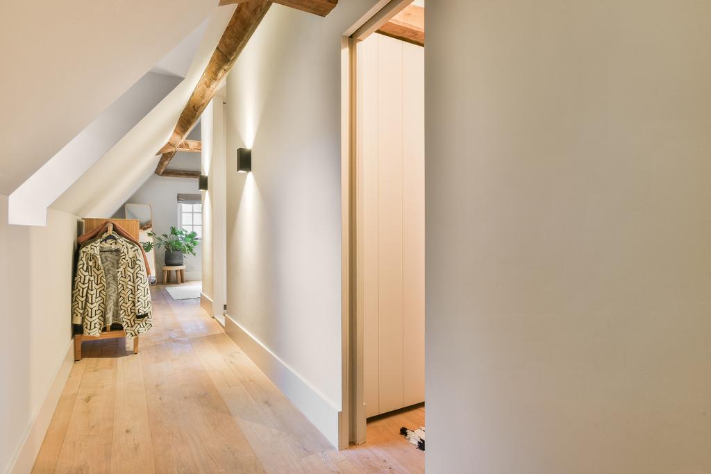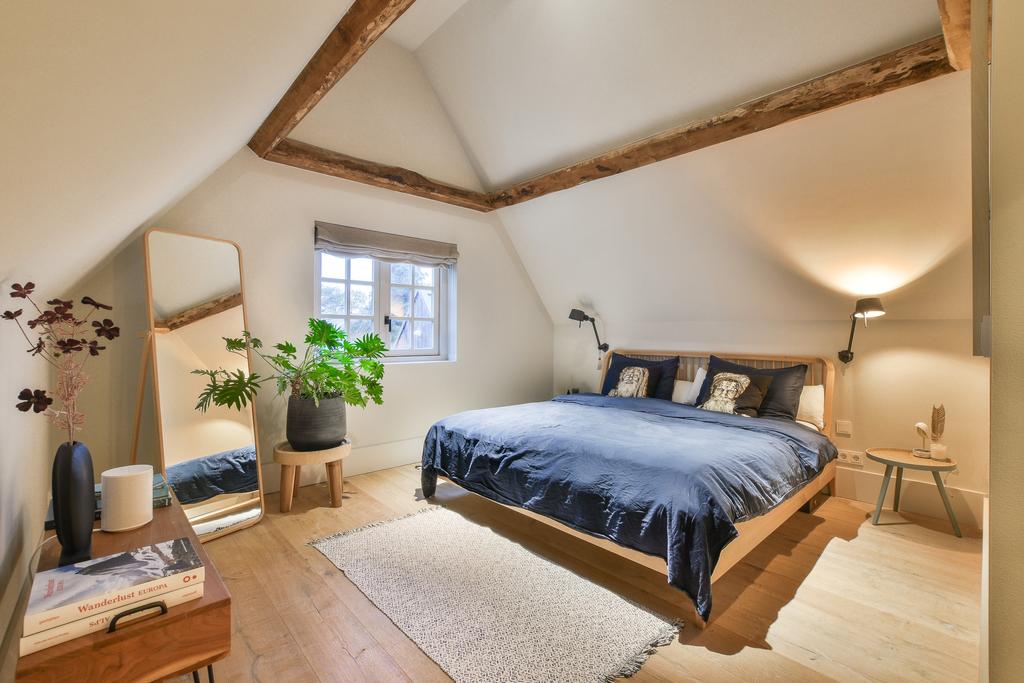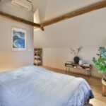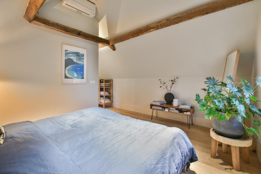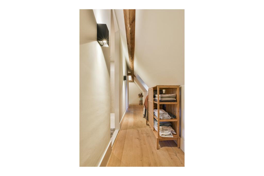 Overloop, kleedkamer, ruime ouderslaapkamer voorzien van airconditioning en van een hoog plafond tot in de nok met fraaie balken in het zicht. De badkamer met inbouwkasten is voorzien van een inloopdouche, dubbel wastafelmeubel en toilet. De gehele eerste verdieping is op de badkamer na voorzien van een verouderde eikenhouten vloer.