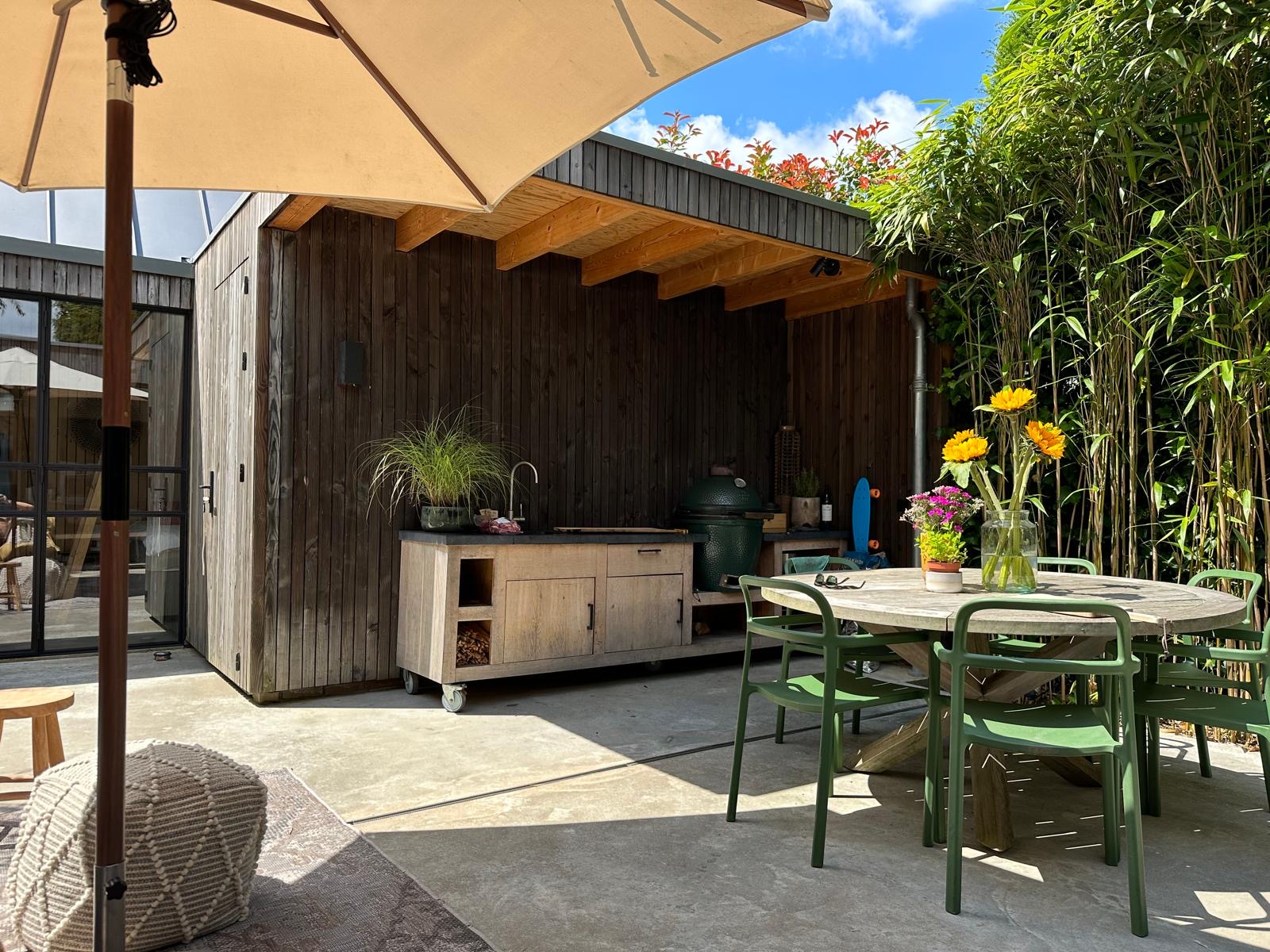 De ruime voortuin heeft een trampoline, zodat de kinderen heerlijk kunnen spelen, de oprit biedt plaats voor meerdere auto's en de achtertuin is zeer sfeervol aangelegd en voorzien van een betonvloer met een regendrain en buitenkeuken. Het ruime vrijstaande guesthouse is voorzien van een ruime slaapkamer met eigen badkamer en wasruimte met wasmachine en droger.
