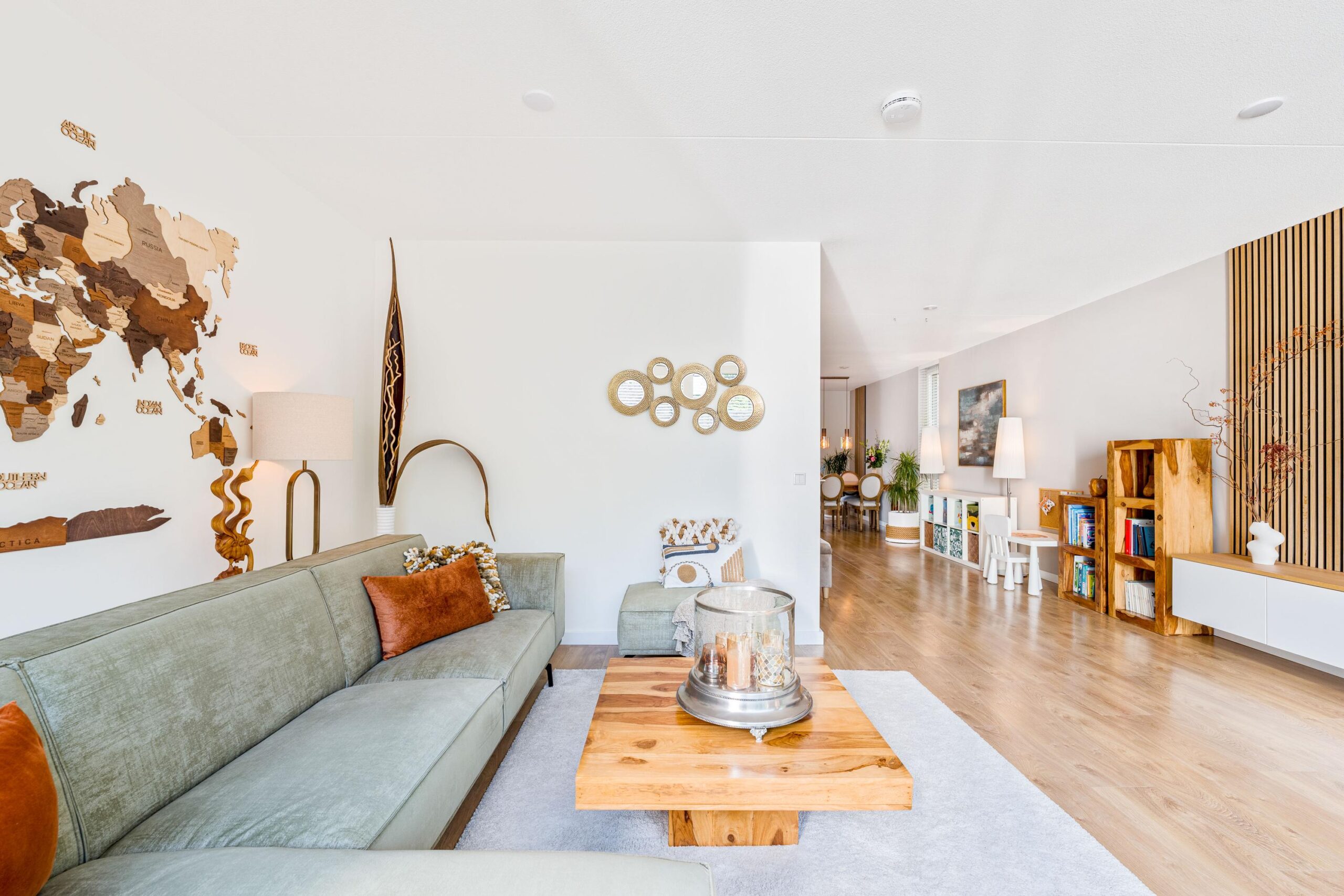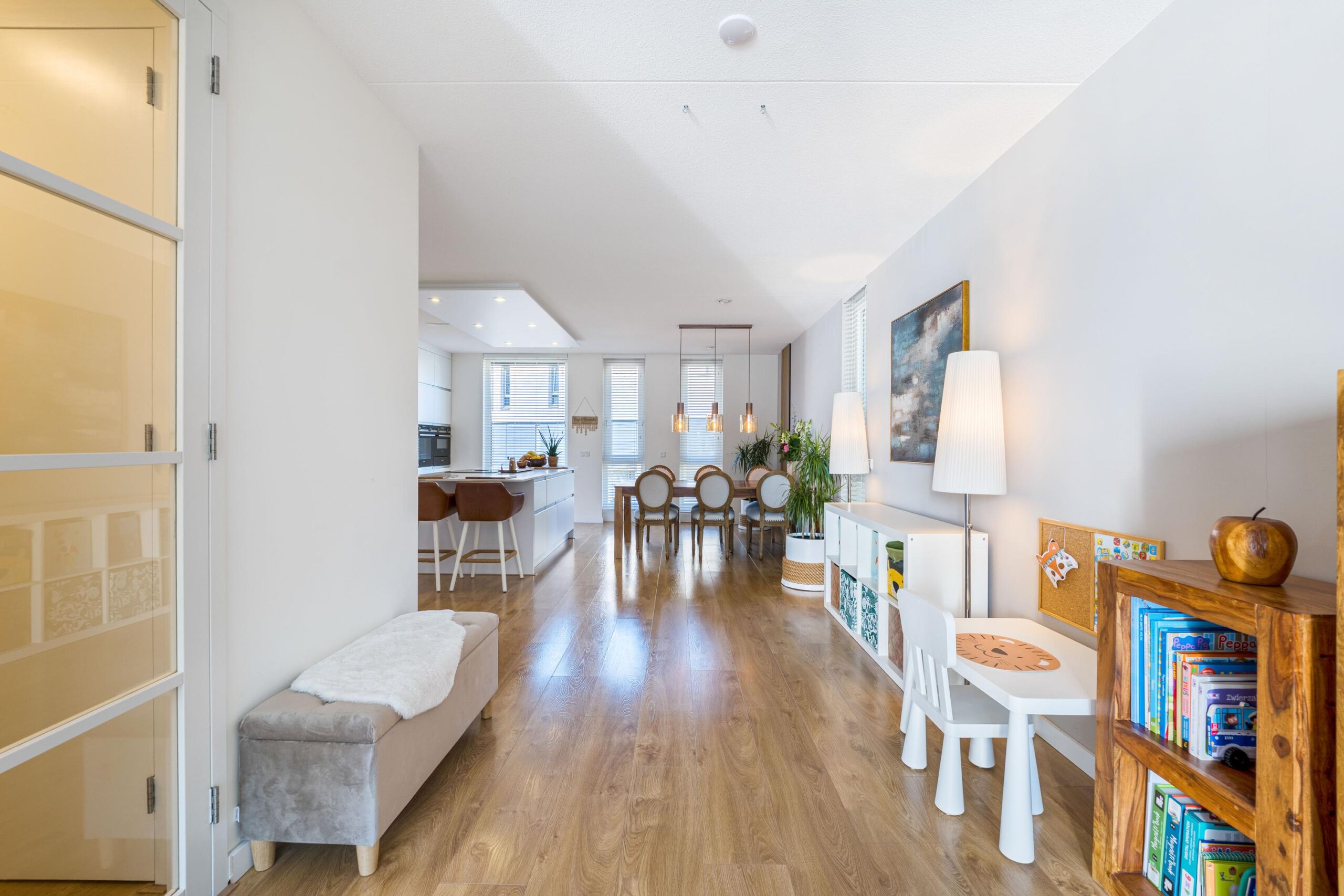 A mahogany staircase leads to the generous open-plan living area of nearly 70 m². Floor-to-ceiling windows flood the space with natural light and create a sense of openness. The stylish open kitchen with a large island is fully equipped with high-end appliances including an oven, combi-oven, warming drawer, Quooker, Bora cooktop with integrated extraction, dishwasher, fridge, and freezer. The entire floor features underfloor heating and cooling. A modern guest toilet (Villeroy & Boch) is also located on this level.