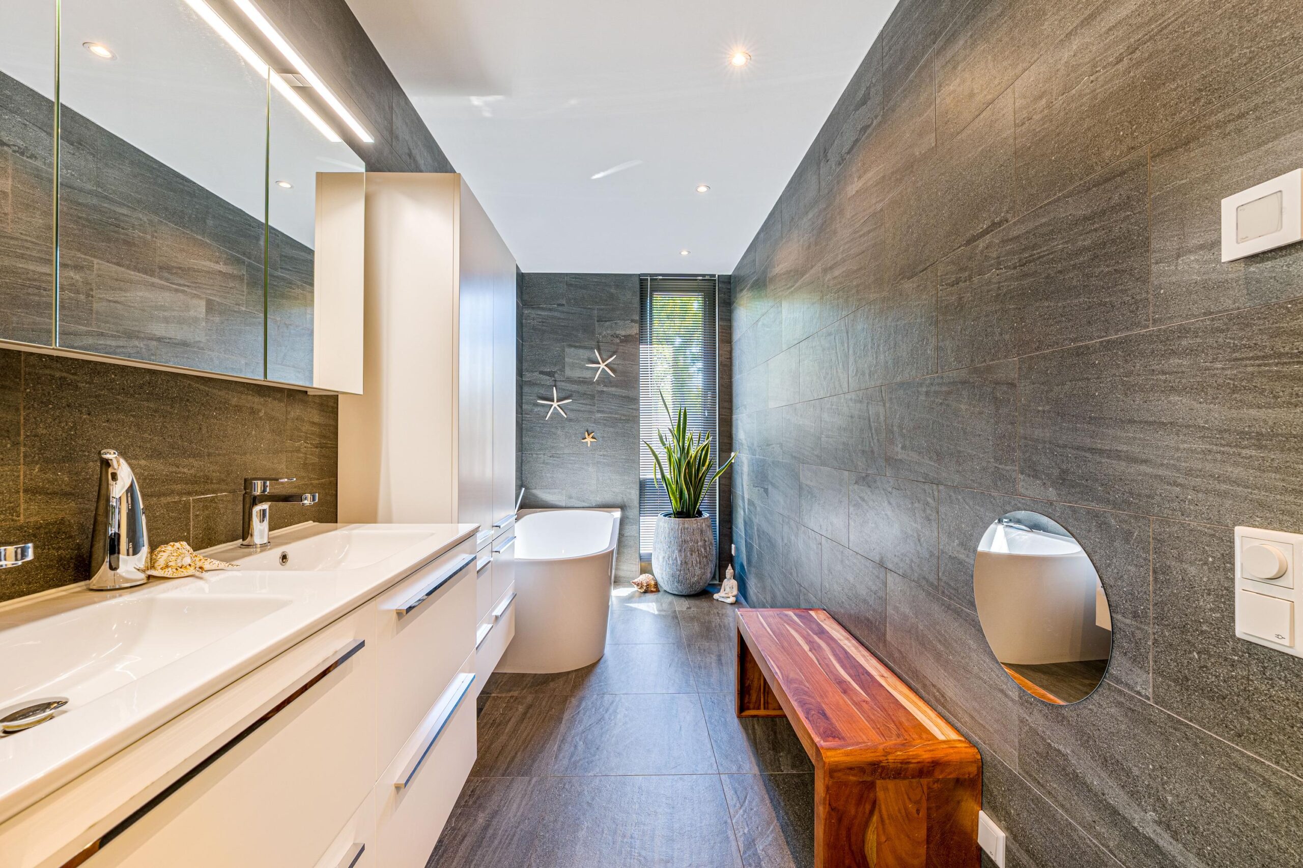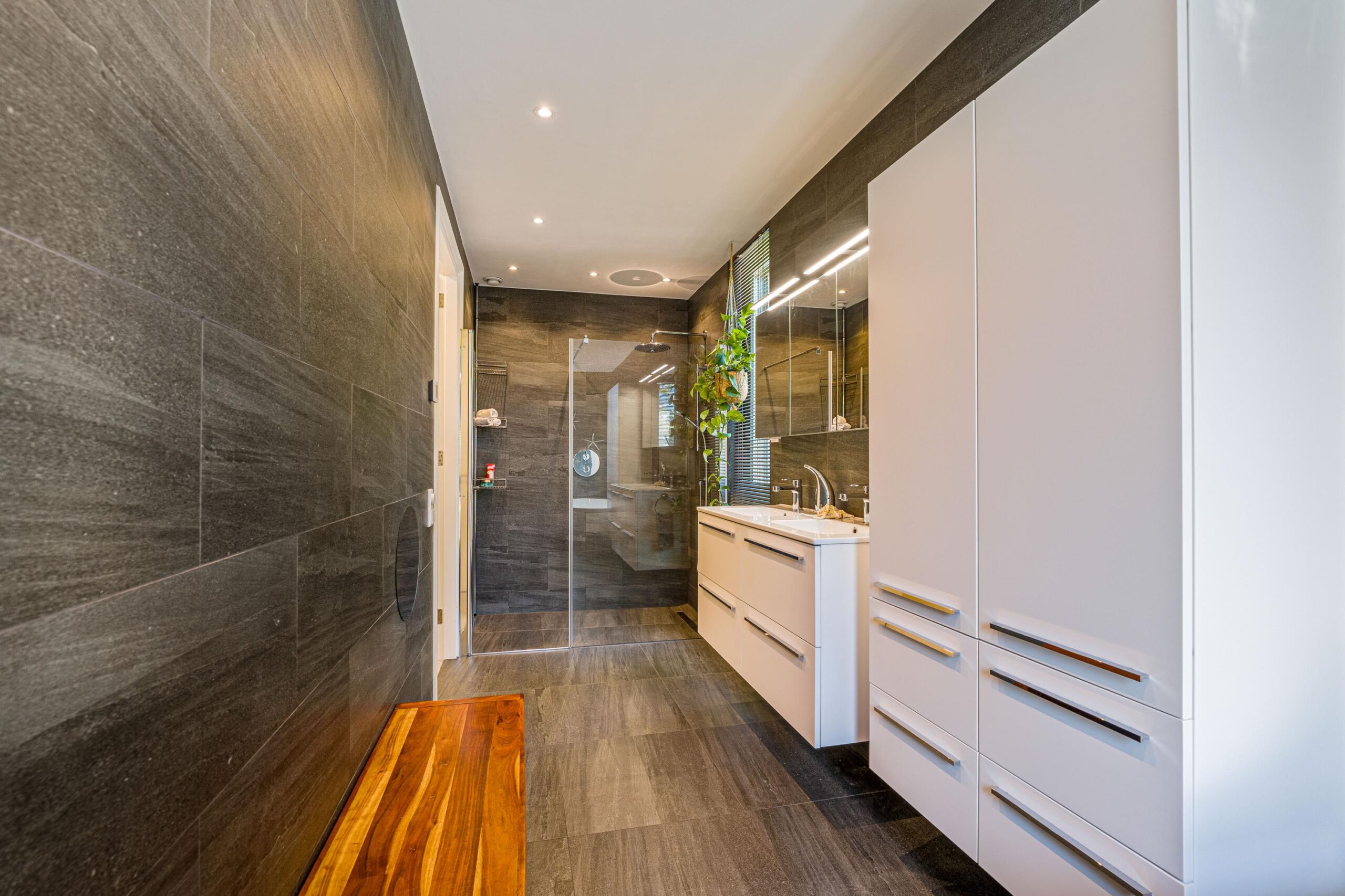 The top floor offers two spacious, light-filled bedrooms. The luxurious bathroom is finished to a high standard with a walk-in shower, freestanding bathtub, double vanity, underfloor heating, and premium fittings. A separate toilet, a utility closet with technical installations, and a laundry cupboard with connections for washer and dryer are all accessible from the hallway.
