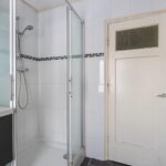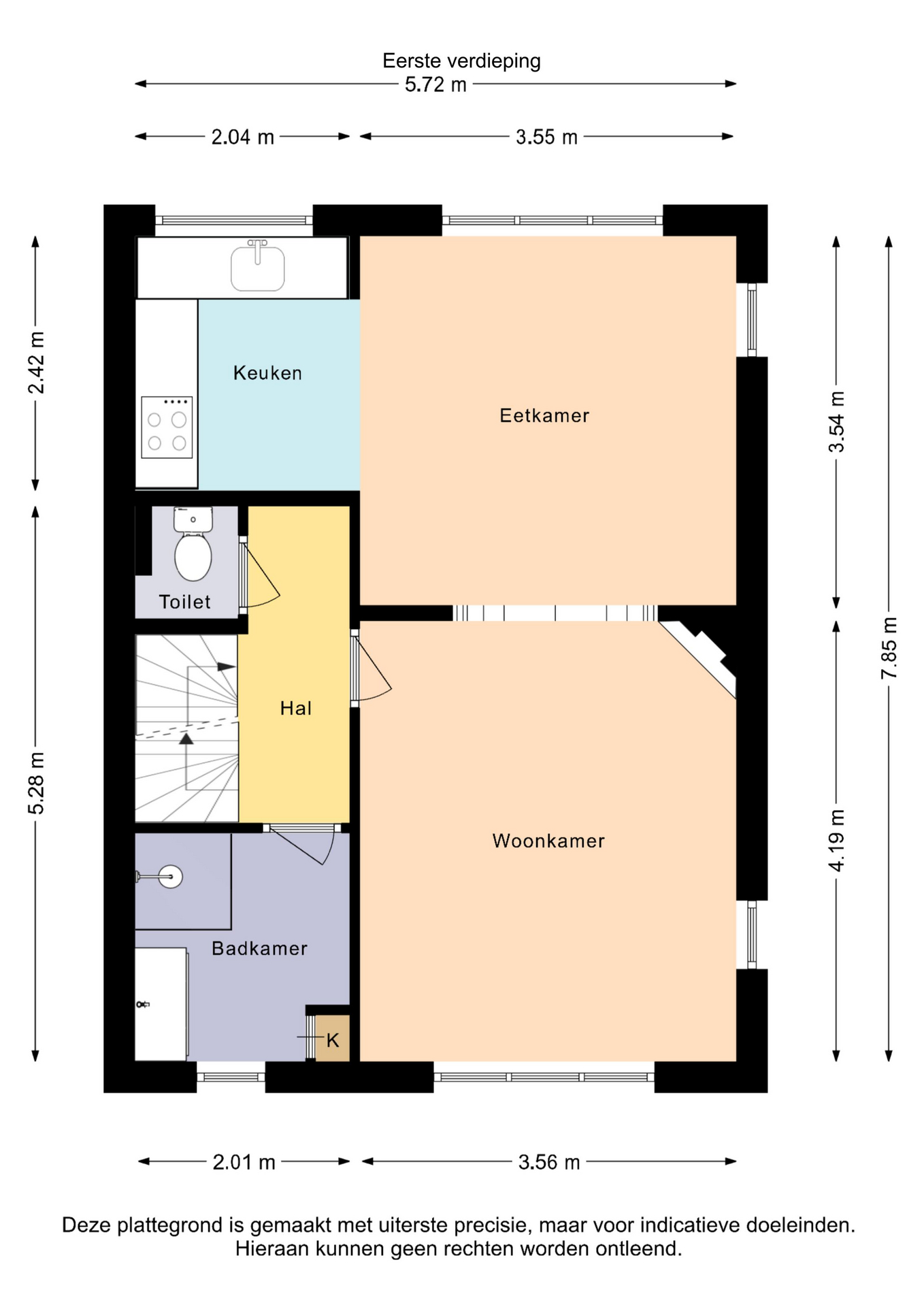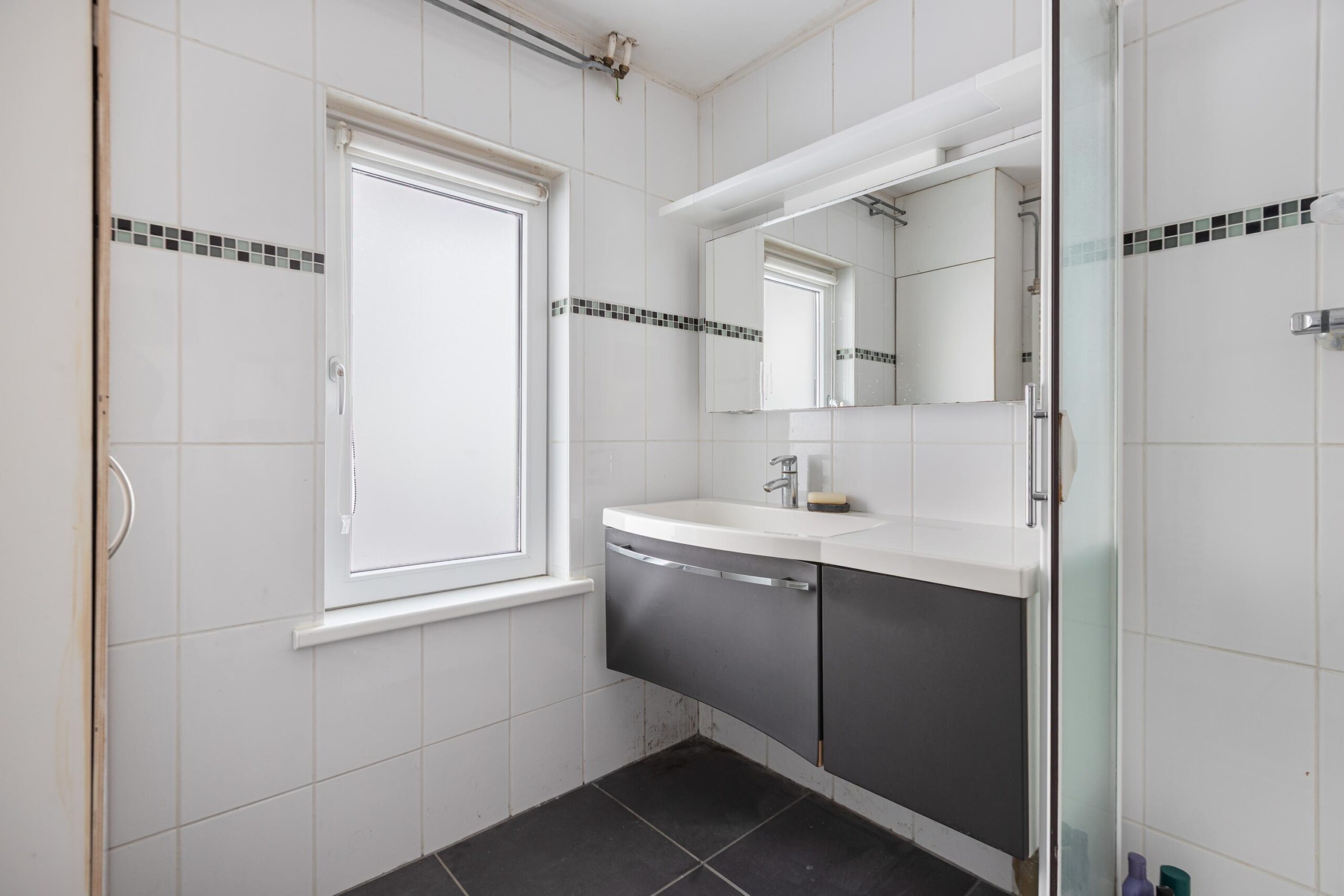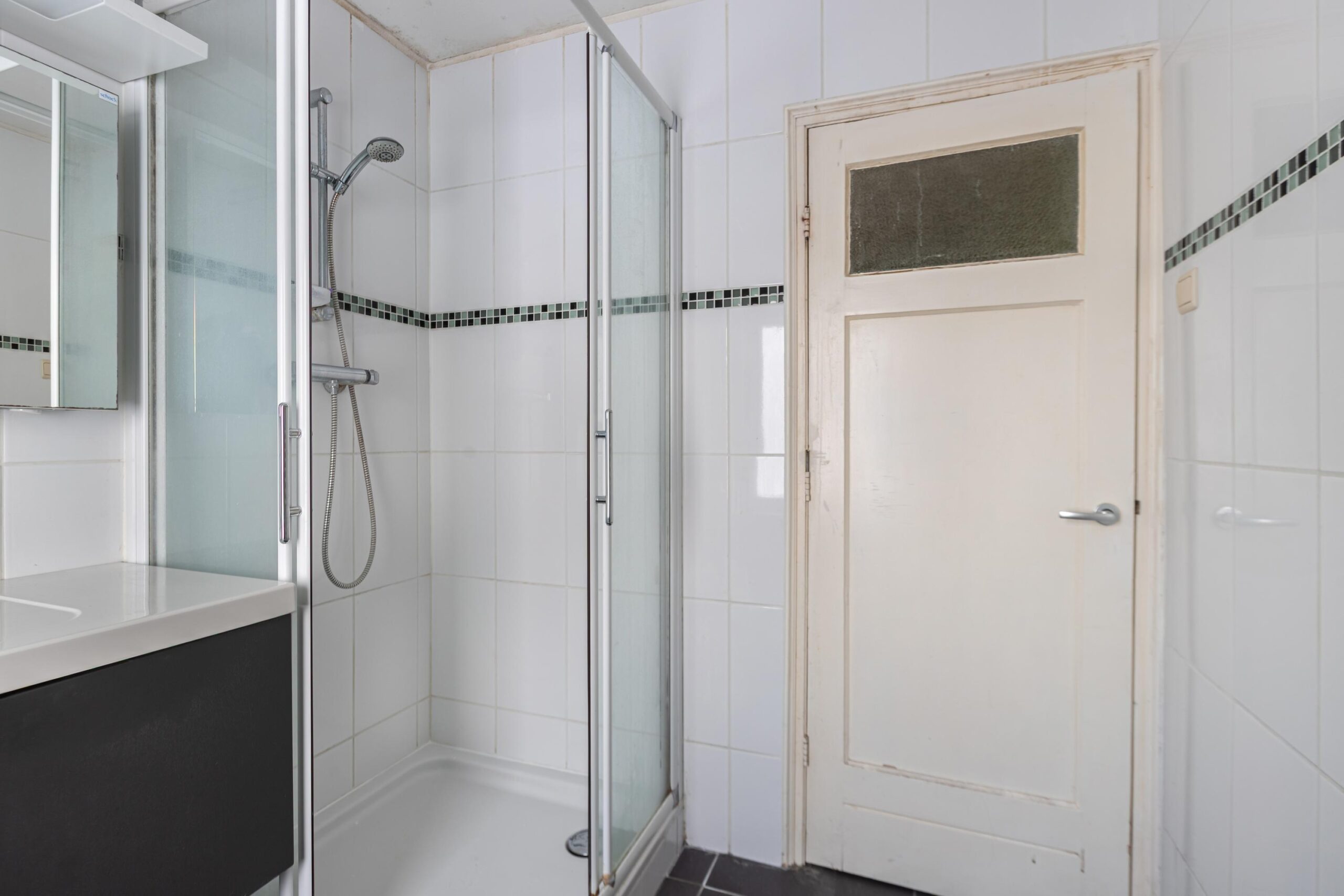 Via de gezamenlijke entree met de benedenwoning bereik je de trapopgang naar de eerste verdieping. Op de overloop bevinden zich het separate toilet, de badkamer met douche en wastafel, en de toegang tot de lichte woonkamer.