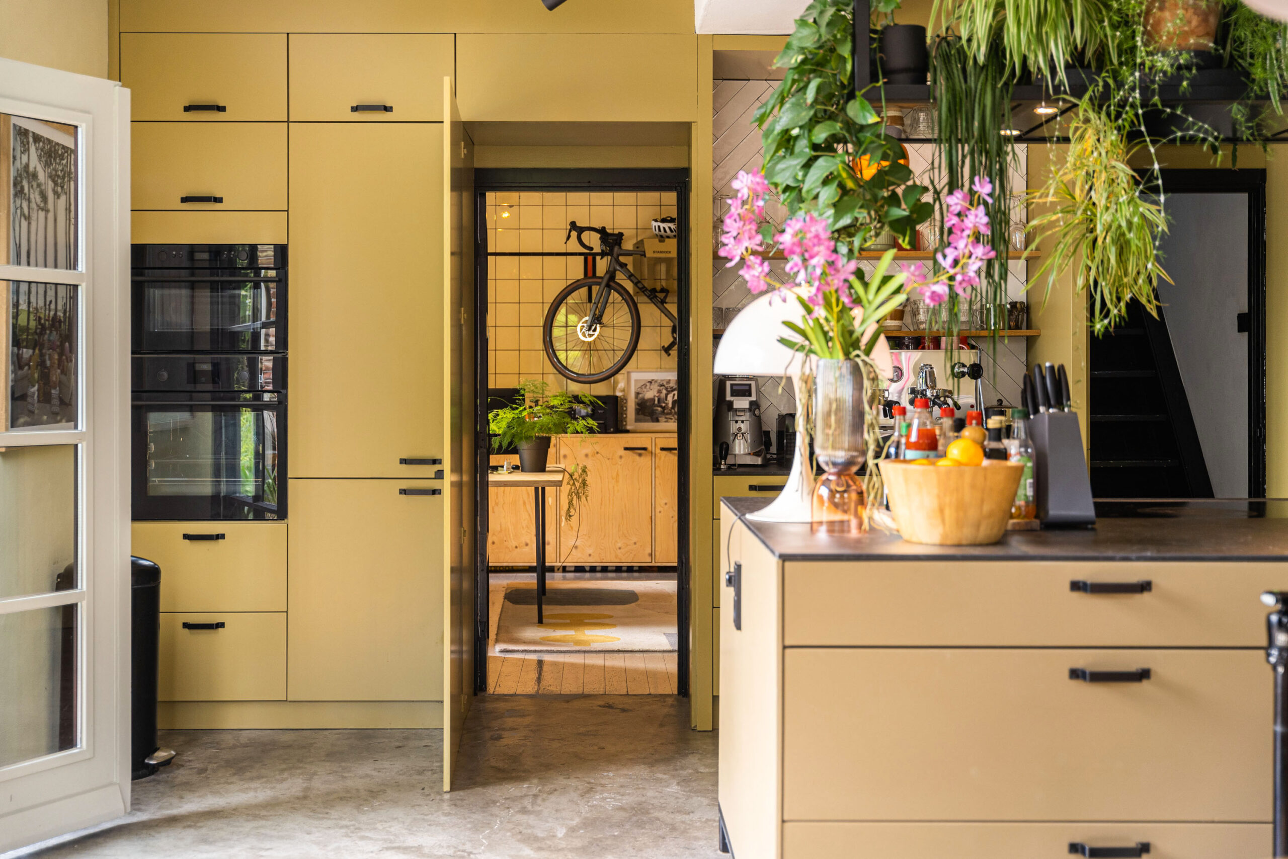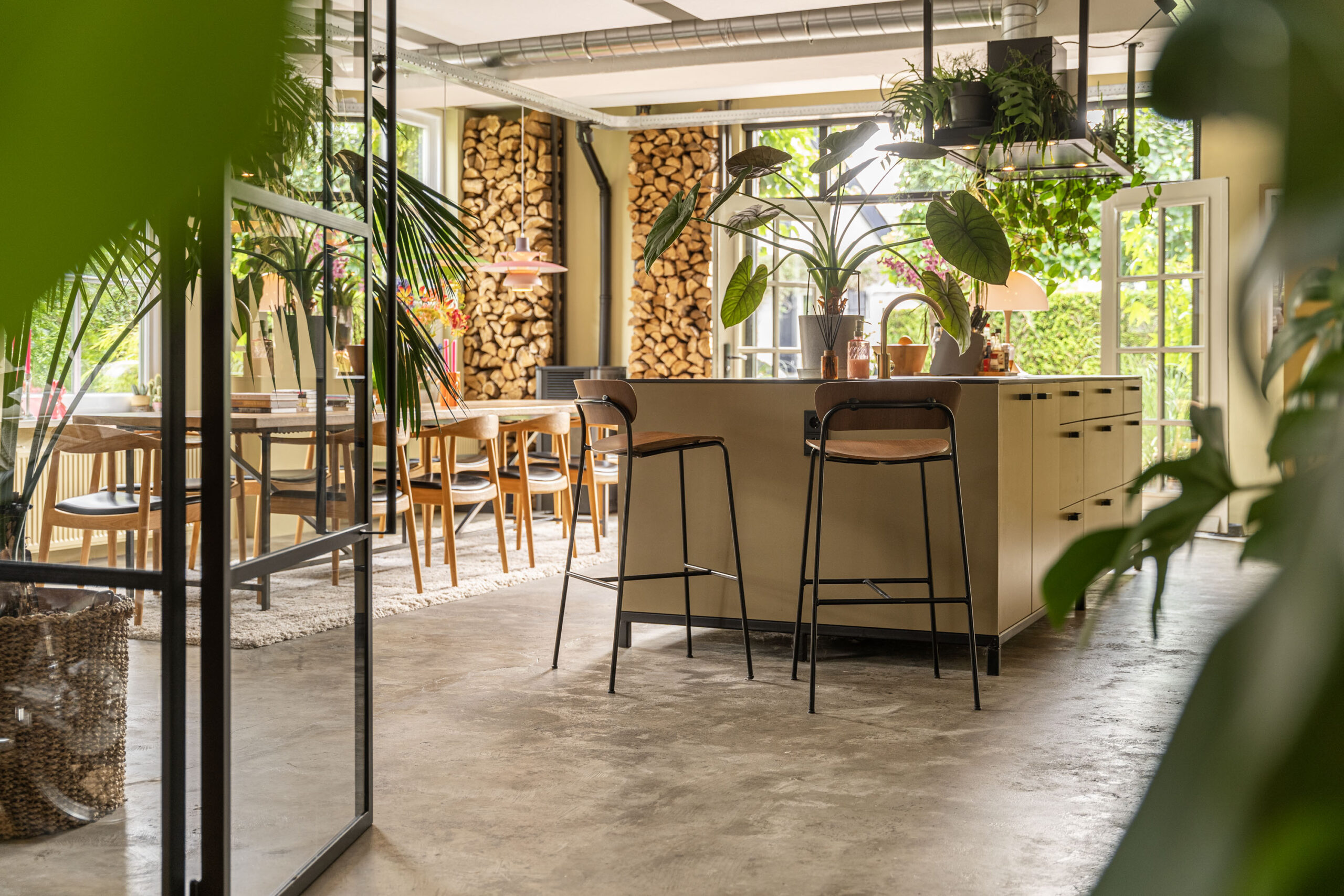 U komt binnen in een schitterende woonkeuken van 60 m². Deze royale woonkeuken, met zijn grote kookeiland en oude fabrieksvloer, waar een lange eettafel bij de haard uitnodigt tot lange, gezellige avonden, is een lust voor het oog. En is tevens de verbinding naar alle ruimtes in het gebouw.