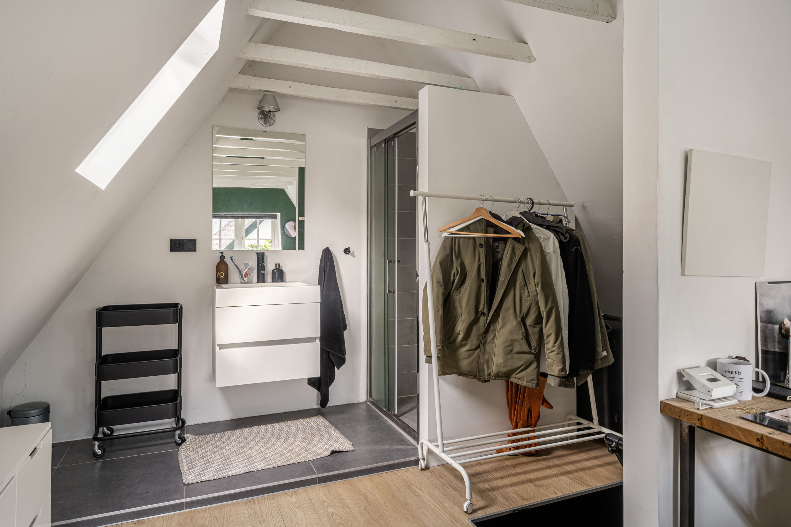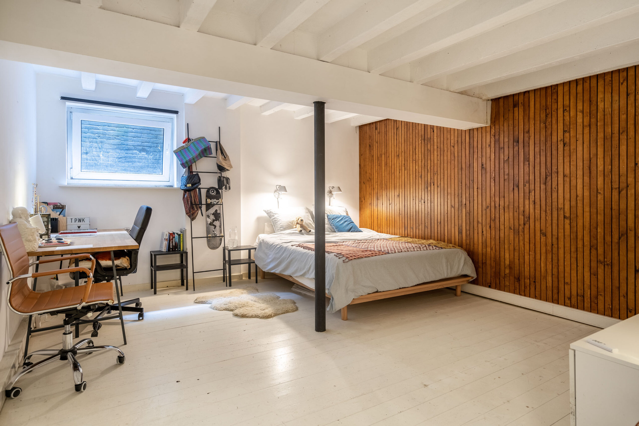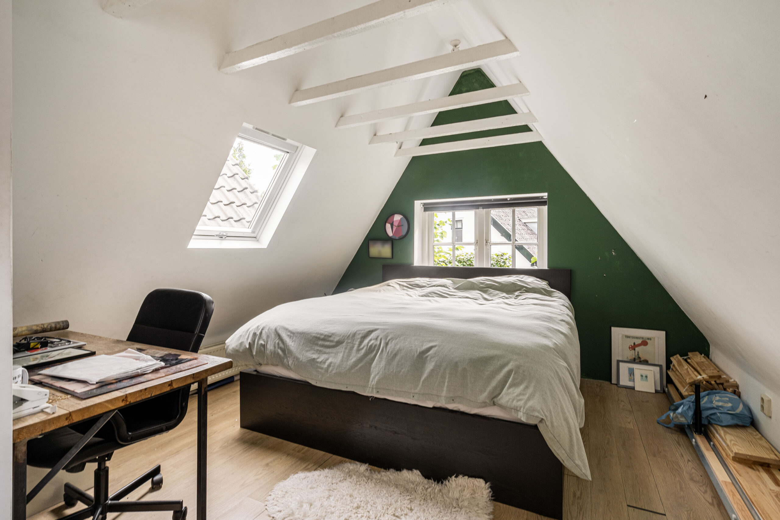 Een verborgen deur in de keuken leidt u verder naar een sfeervolle kamer in het tussengebouw (nu in gebruik als werkkamer. De bestemming is ‘gemengd’) met authentieke details. Een andere verborgen deur brengt u naar de ruimte boven de werkkamer waar zich een slaap- en badkamer bevindt. Zowel werkkamer als slaapkamer hebben een gezellig uitzicht op de dorpsstraat voor de deur.