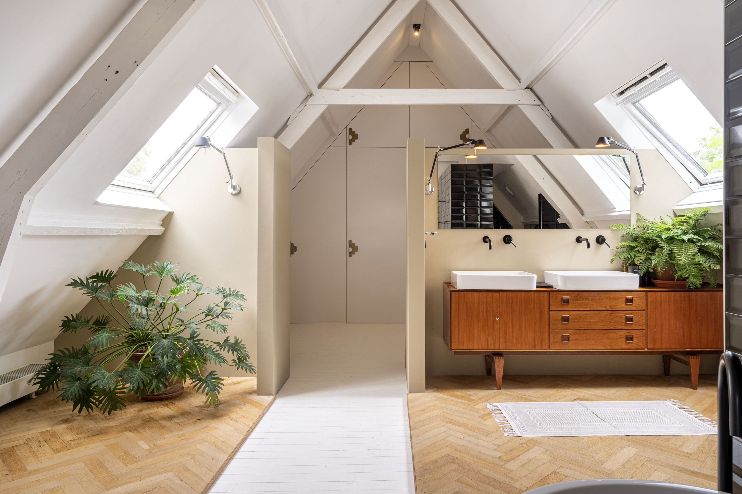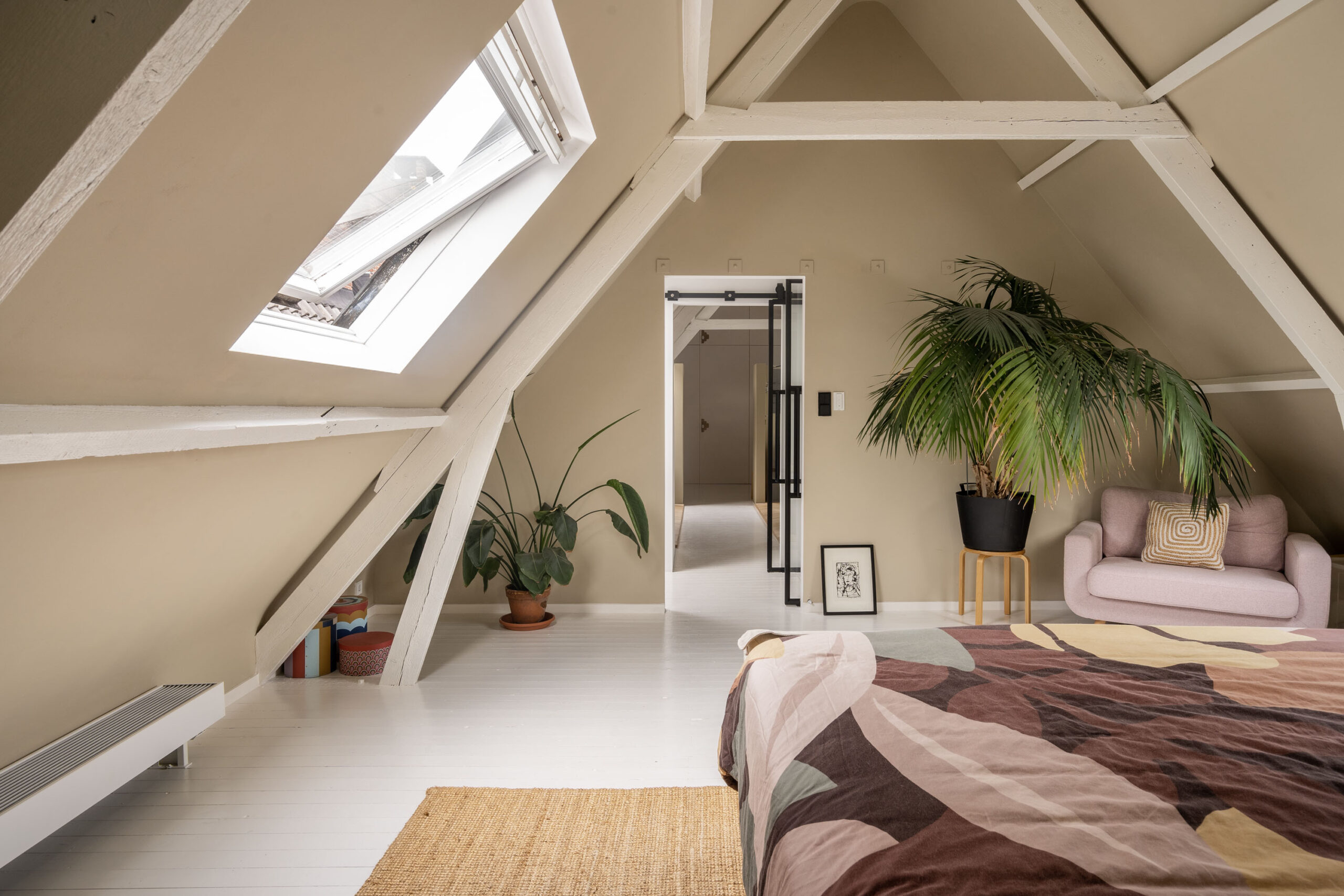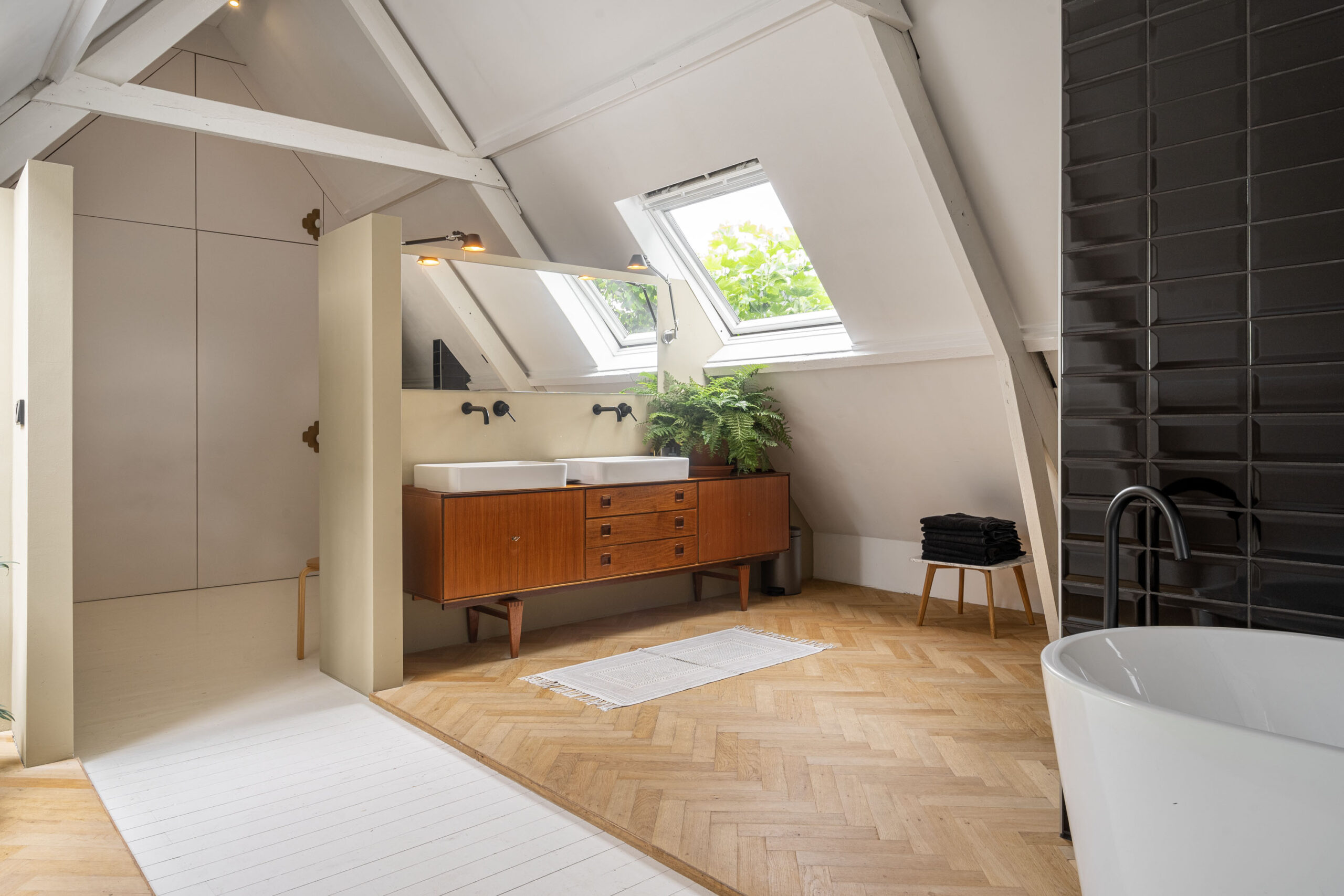 Op de bovenverdieping vindt u een zeer ruime verdieping met balkenplafonds van 4 meter hoog. De verdieping heeft een luxe slaapkamer, compleet met een grote badkamer en een ruime walk-in closet.