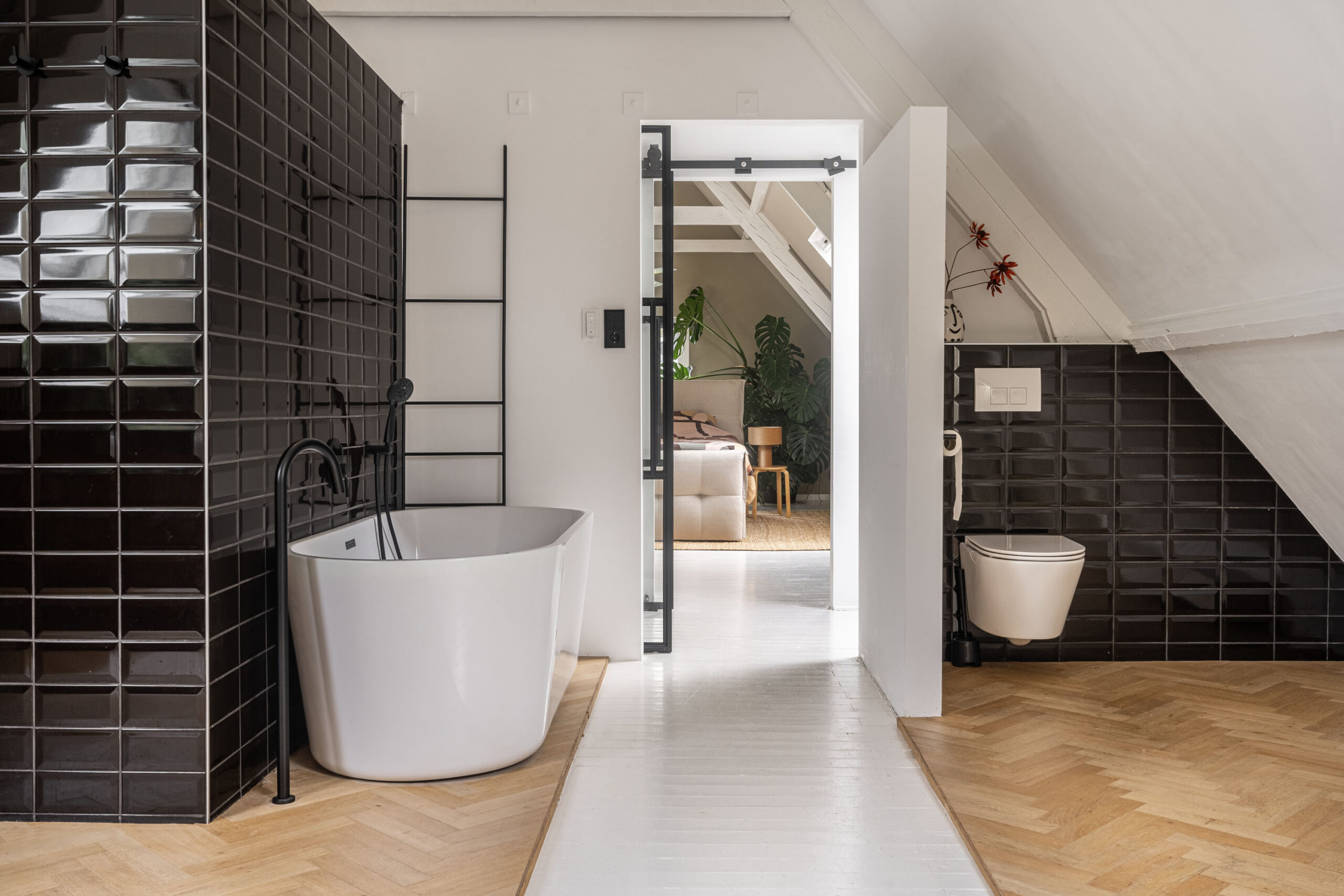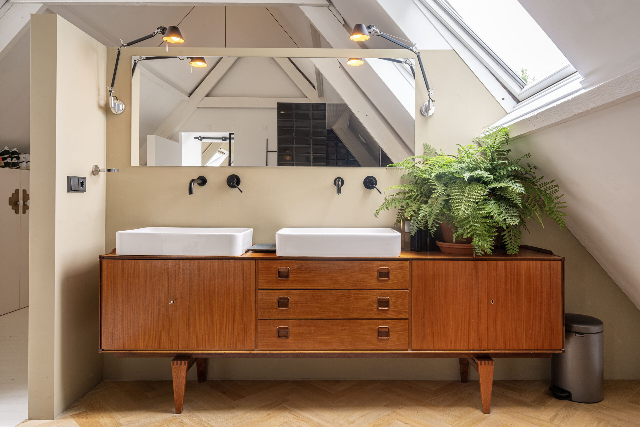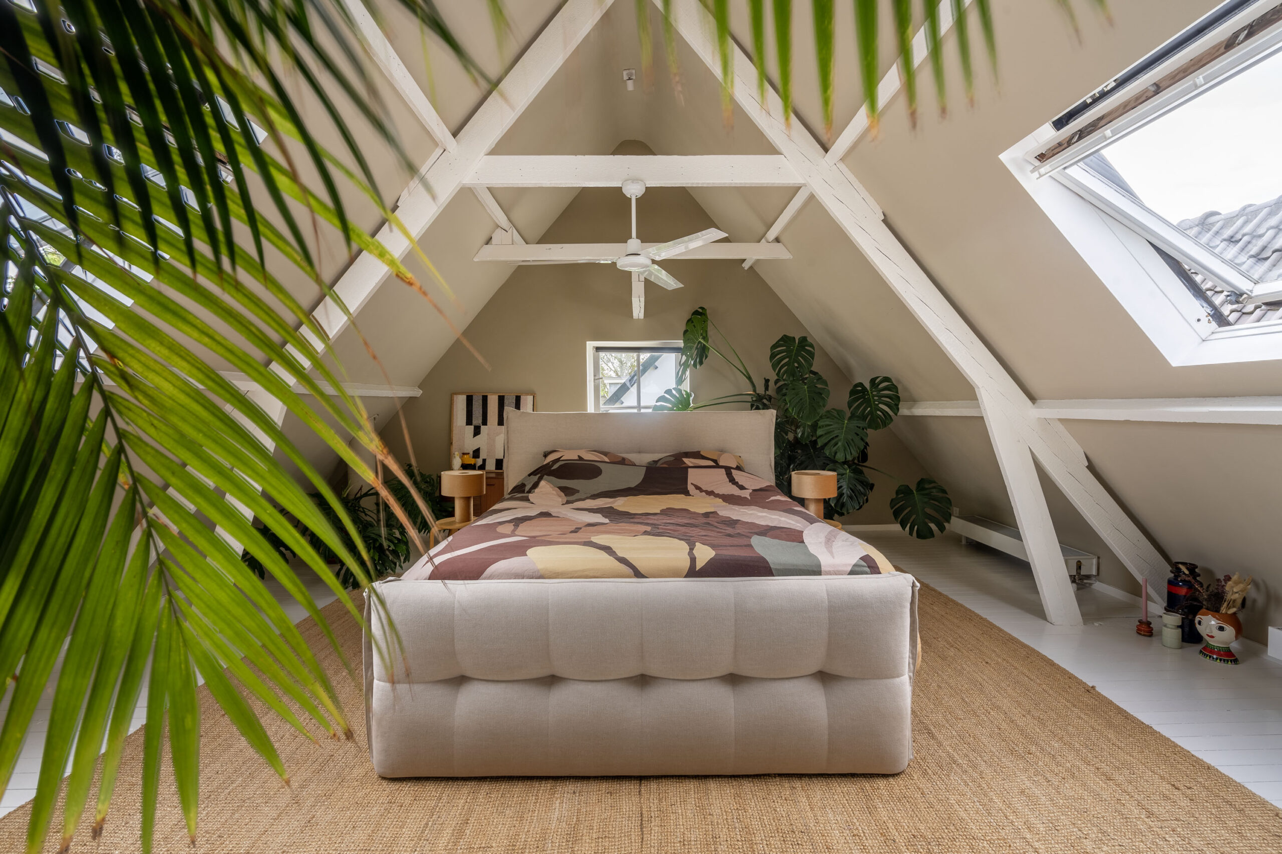 Op de bovenverdieping vindt u een zeer ruime verdieping met balkenplafonds van 4 meter hoog. De verdieping heeft een luxe slaapkamer, compleet met een grote badkamer en een ruime walk-in closet.