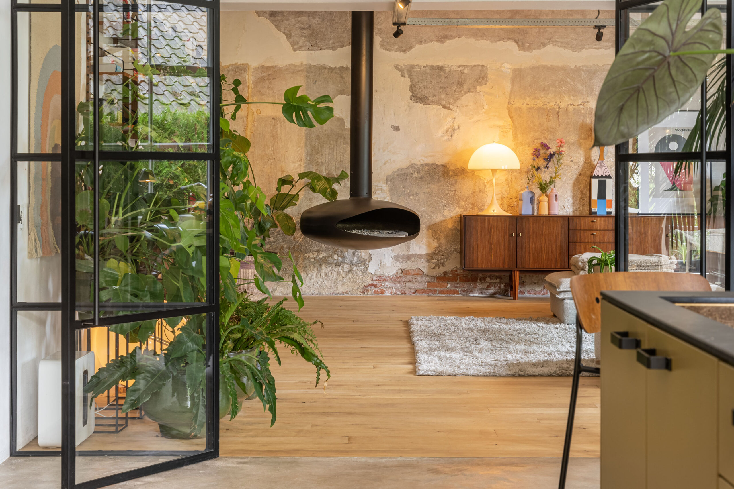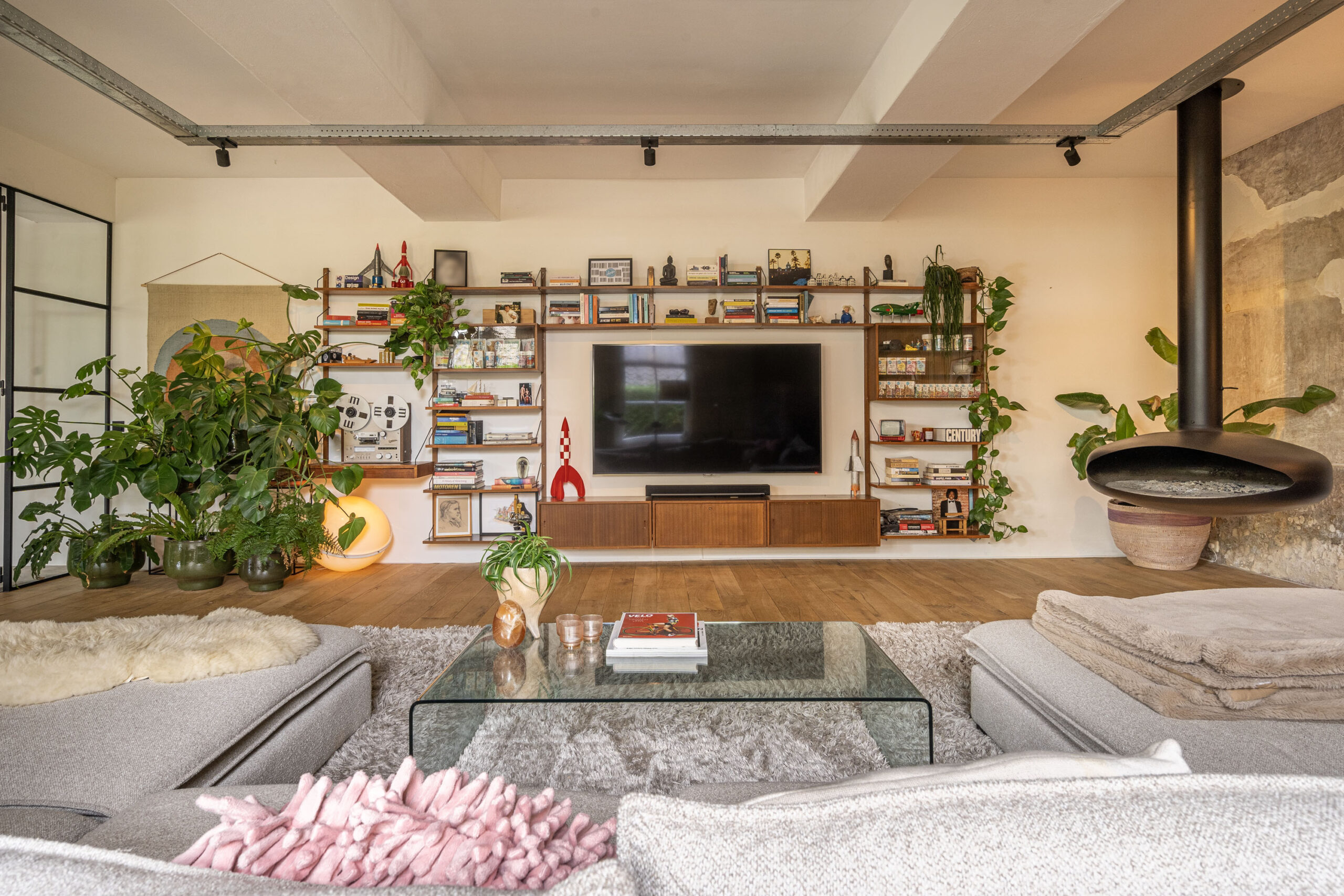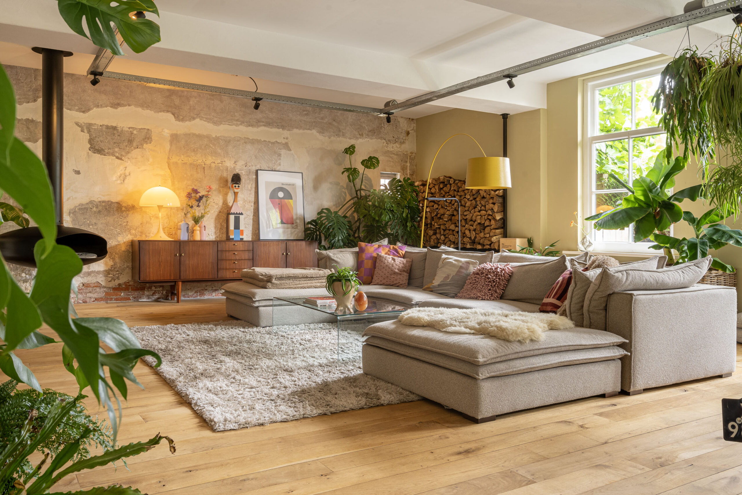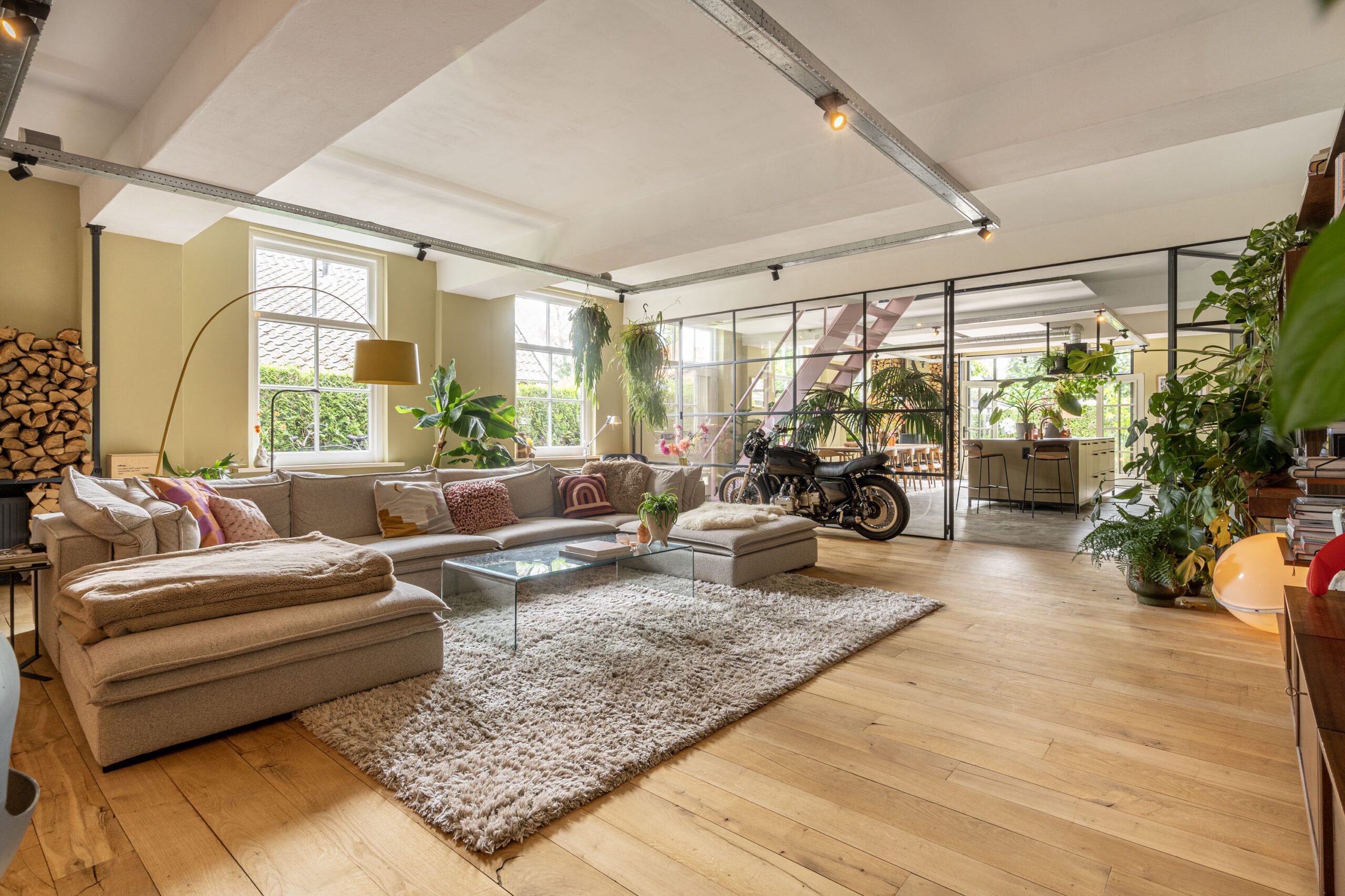 Via een kamerbrede glaswand, met stalen kozijnen en openslaande deuren komt u in de grote woonkamer van 55m2. Deze biedt een industriële uitstraling, compleet met een ruwe fabrieksmuur en een hangende designhaard. In de wintermaanden zorgt deze haard voor sfeer en gezelligheid, die de heerlijke grote ruimte verwarmt. De grote raampartijen zorgen voor natuurlijk licht en vormen een harmonieuze verbinding met de tuin.