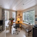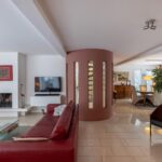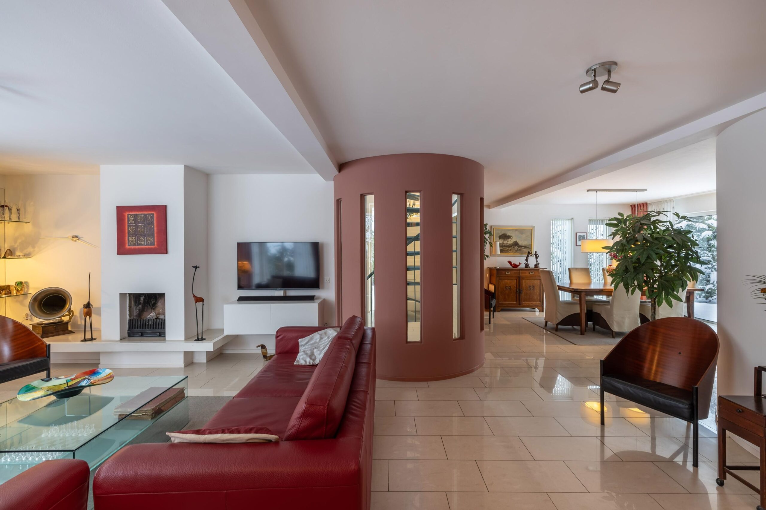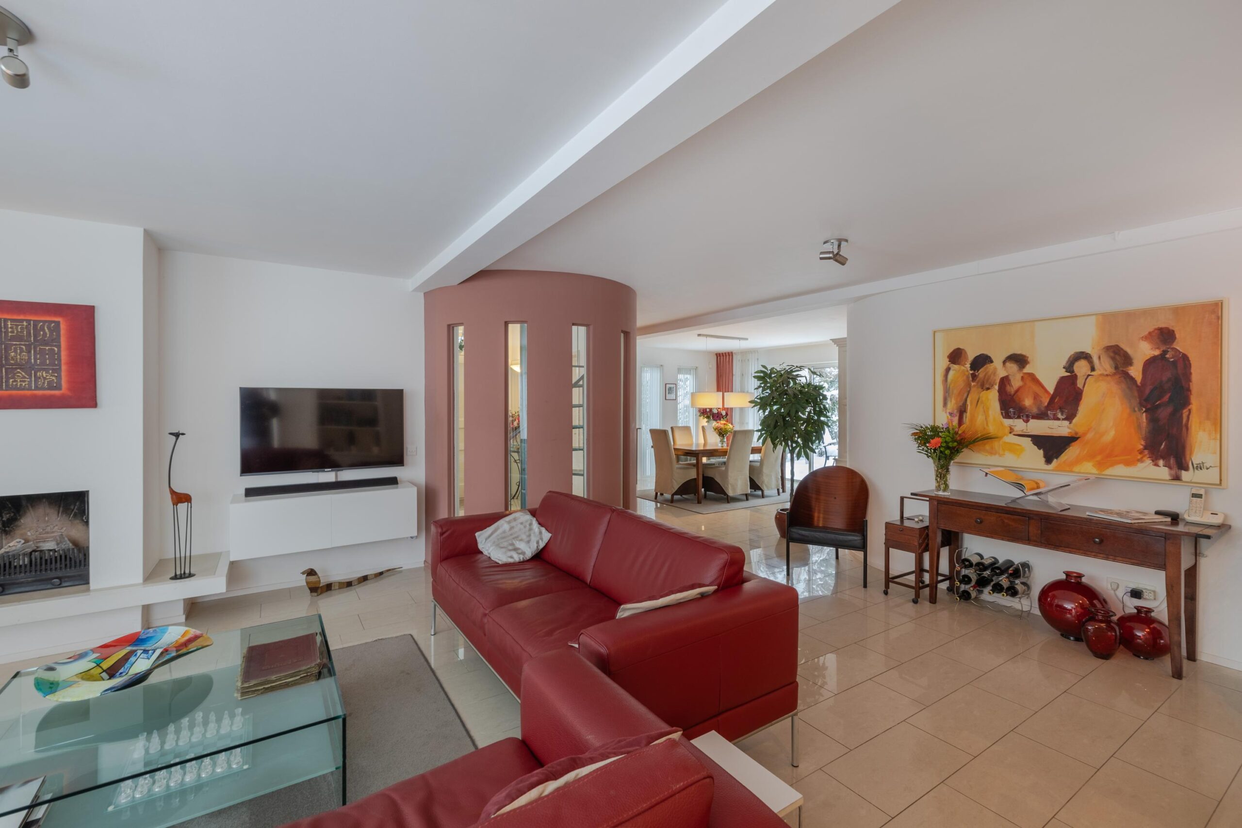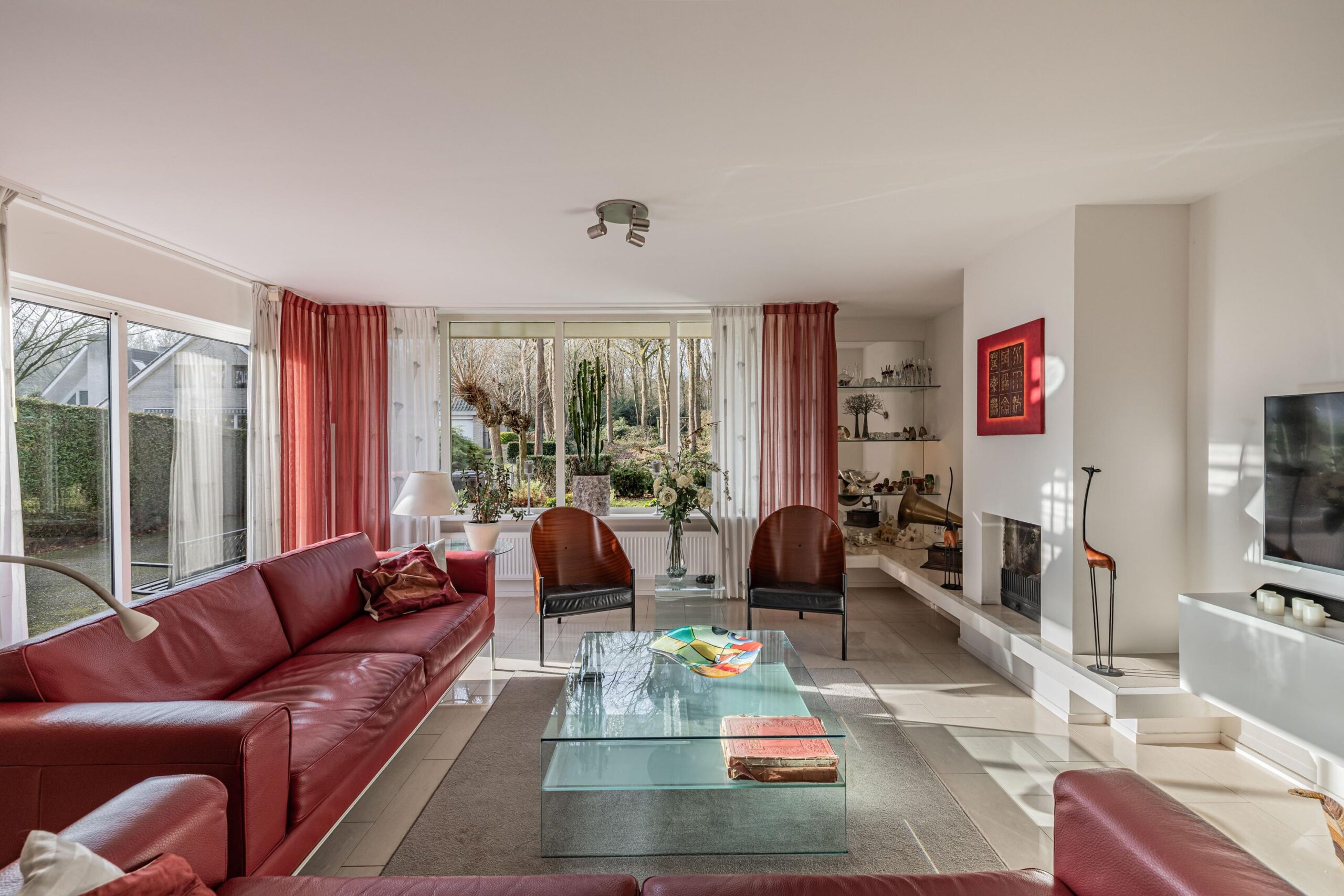 De royale woonkamer is voorzien van een open gashaard en heeft een mooie lichtinval door de grote raampartijen met aan de voorzijde vrij uitzicht op het bos. De begane grond is voorzien van een plavuizenvloer met vloerverwarming.