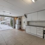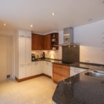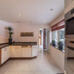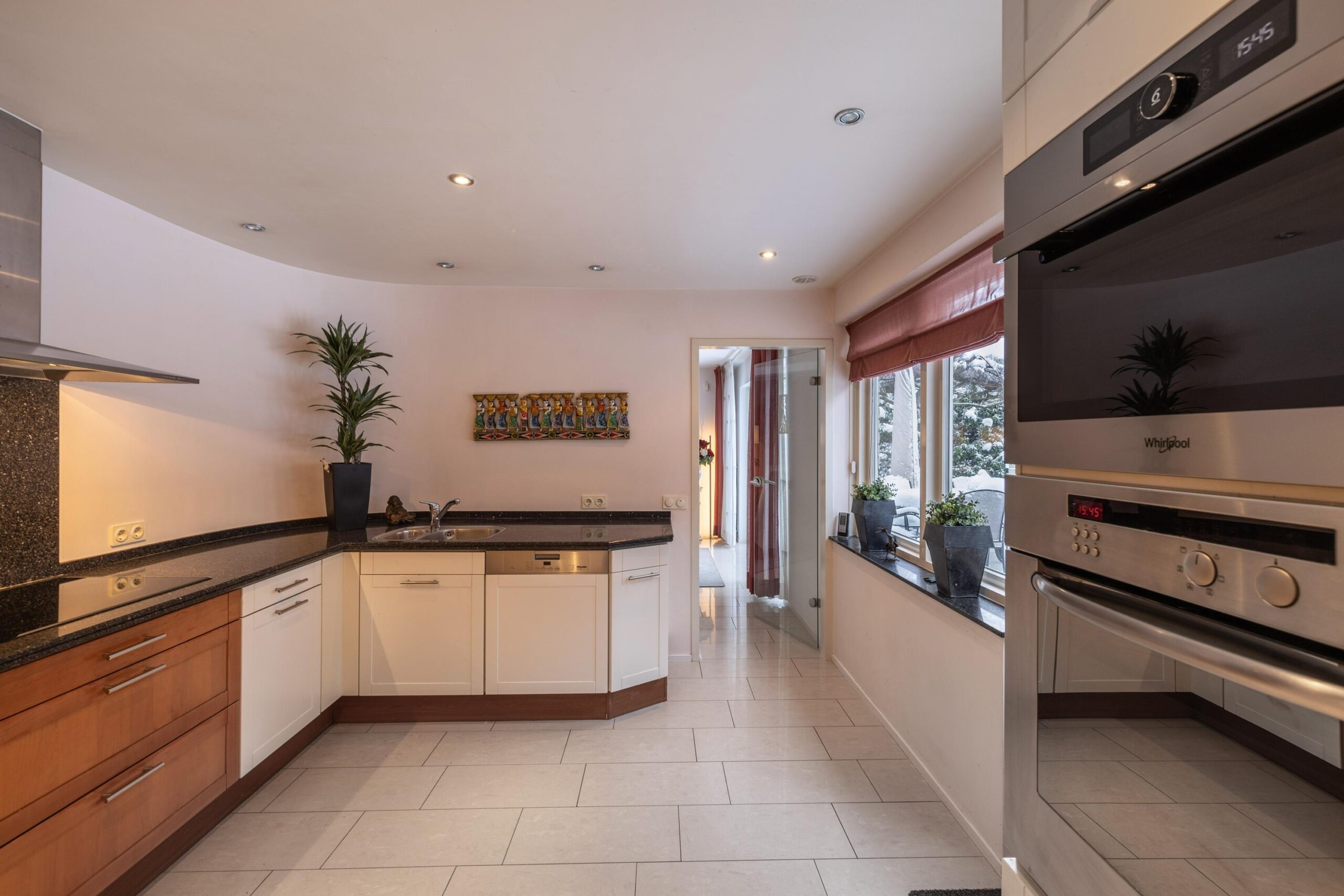 De keuken is onder andere voorzien van een granieten aanrechtblad, vaatwasser, oven, magnetron, elektrische kookplaat, afzuigkap, koelkast en vriezer. Vanuit de keuken is er directe toegang tot de inpandige dubbele garage, voorzien van elektrische schuifdeur (met afstandsbediening), een keukenblok, aanrecht met waterkraan, radiator, veel bergruimte en een deur naar de achtertuin.