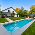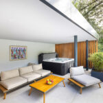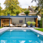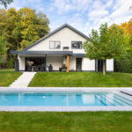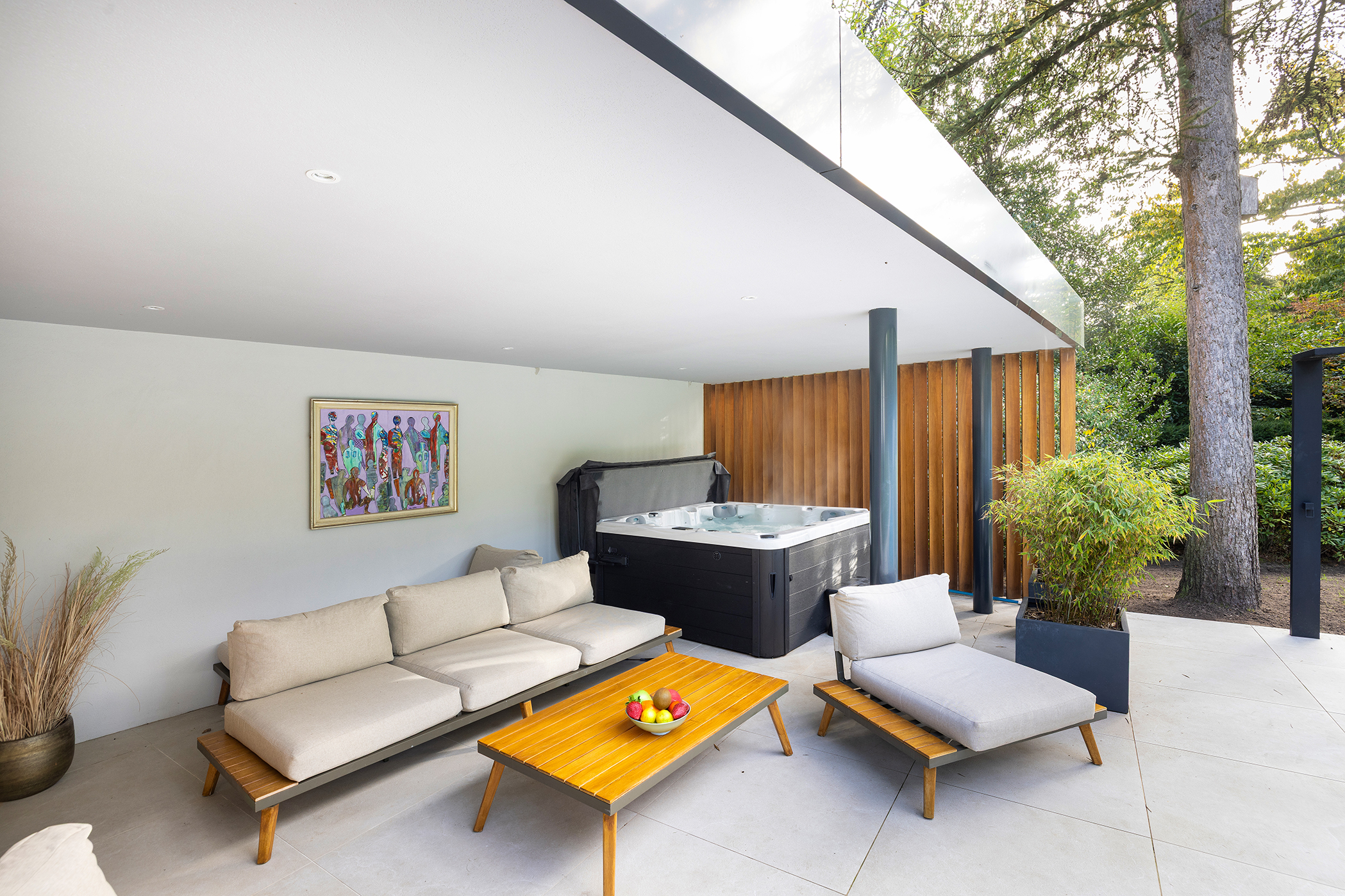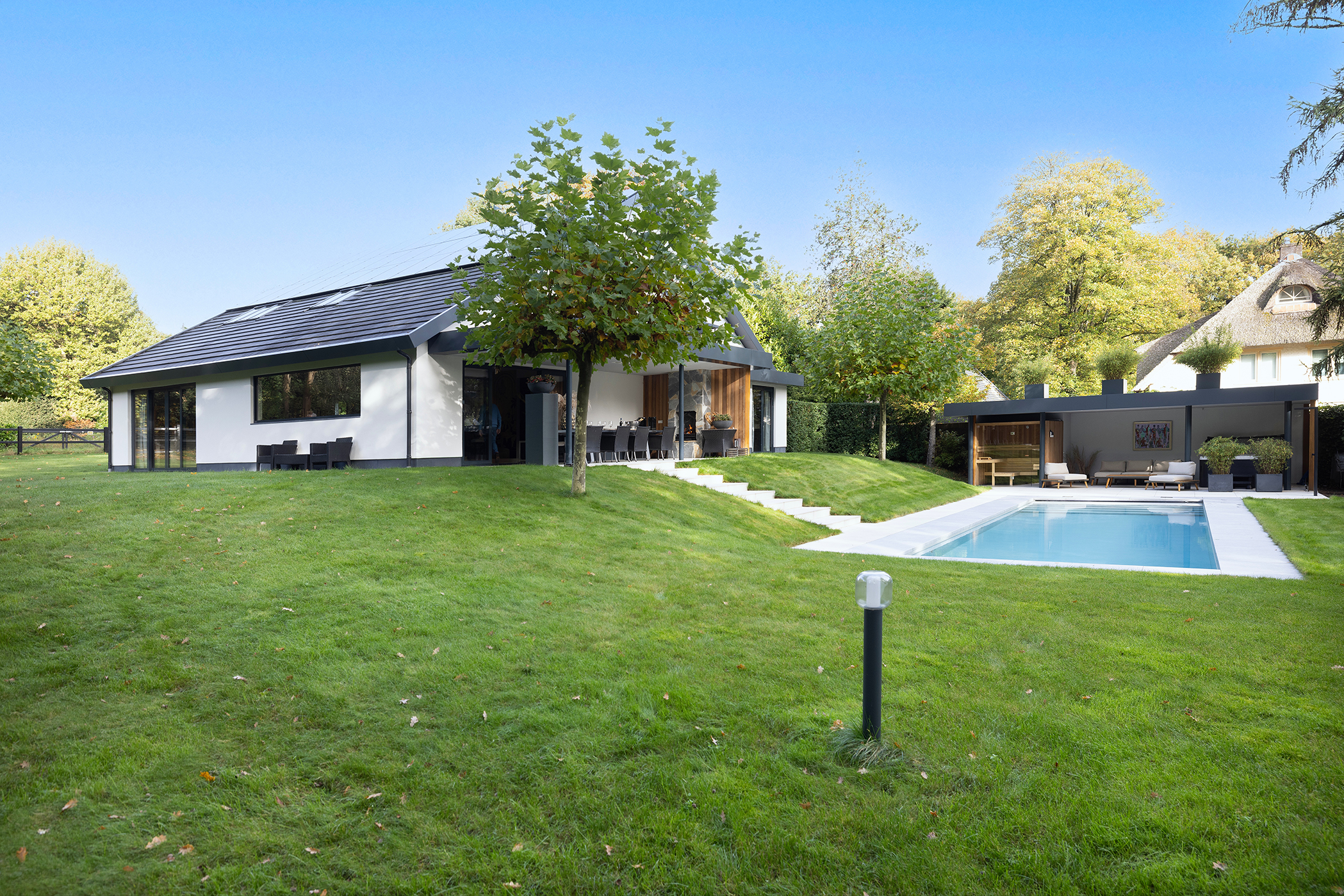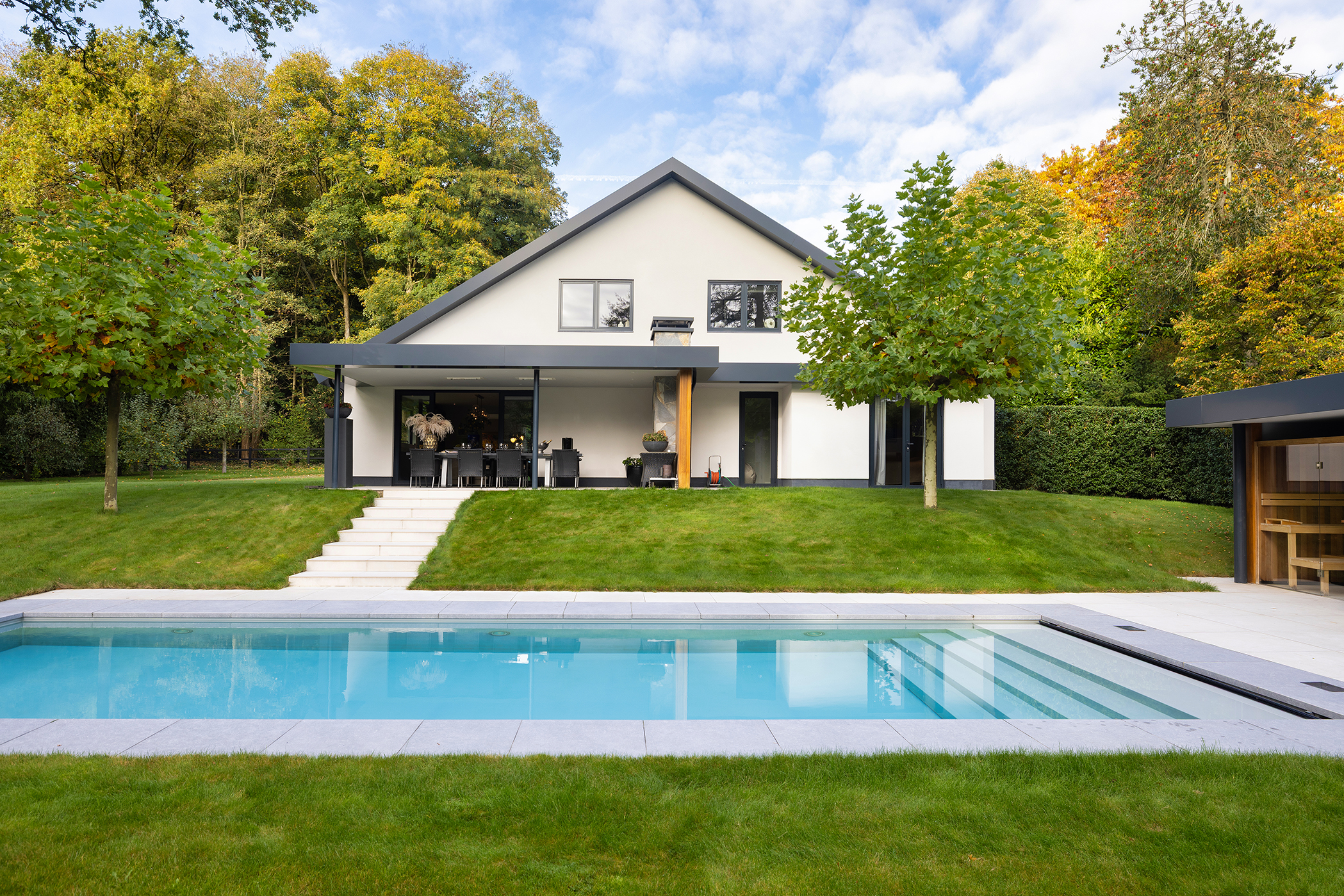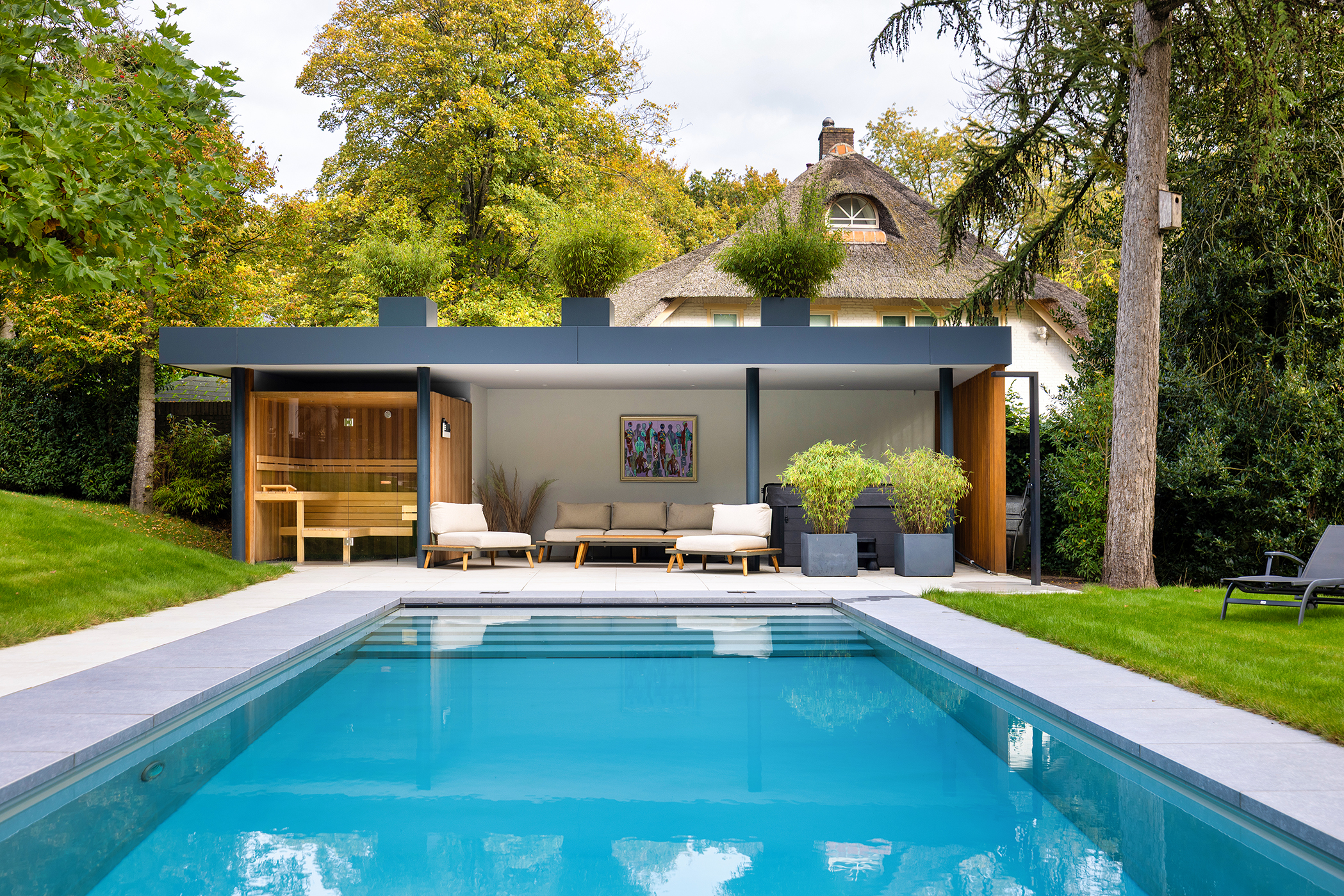Het poolhouse is ontworpen in dezelfde moderne stijl en beschikt over een sauna, kleedruimte en comfortabele lounge — een ideale plek voor ontspanning.