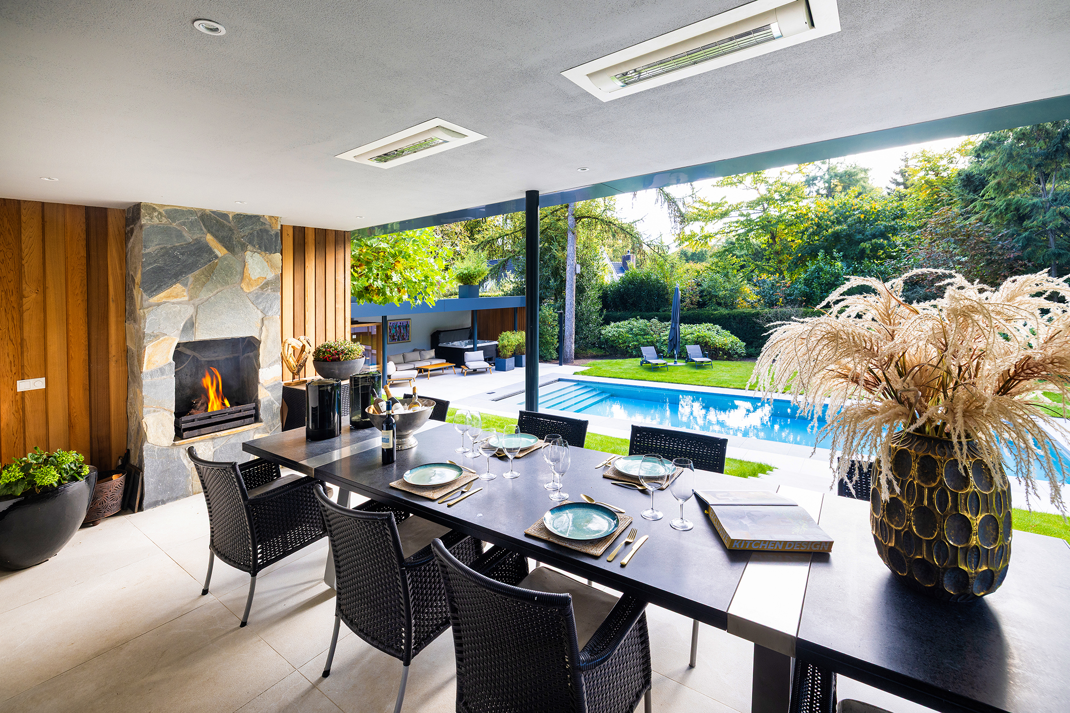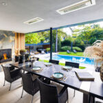 Grenzend aan de keuken ligt het royale terras met ingebouwde heaters — perfect voor sfeervolle avonden onder de sterren. Een open haard zorgt voor warmte en ambiance, waardoor u hier het hele jaar door met comfort kunt verblijven.