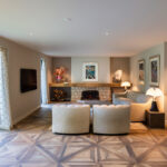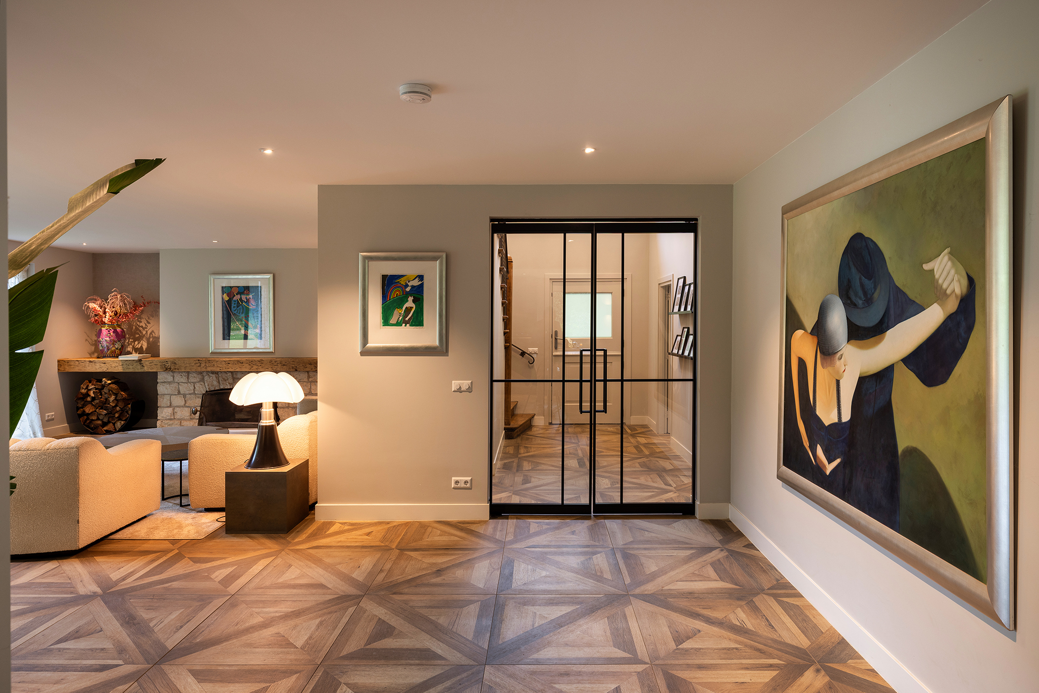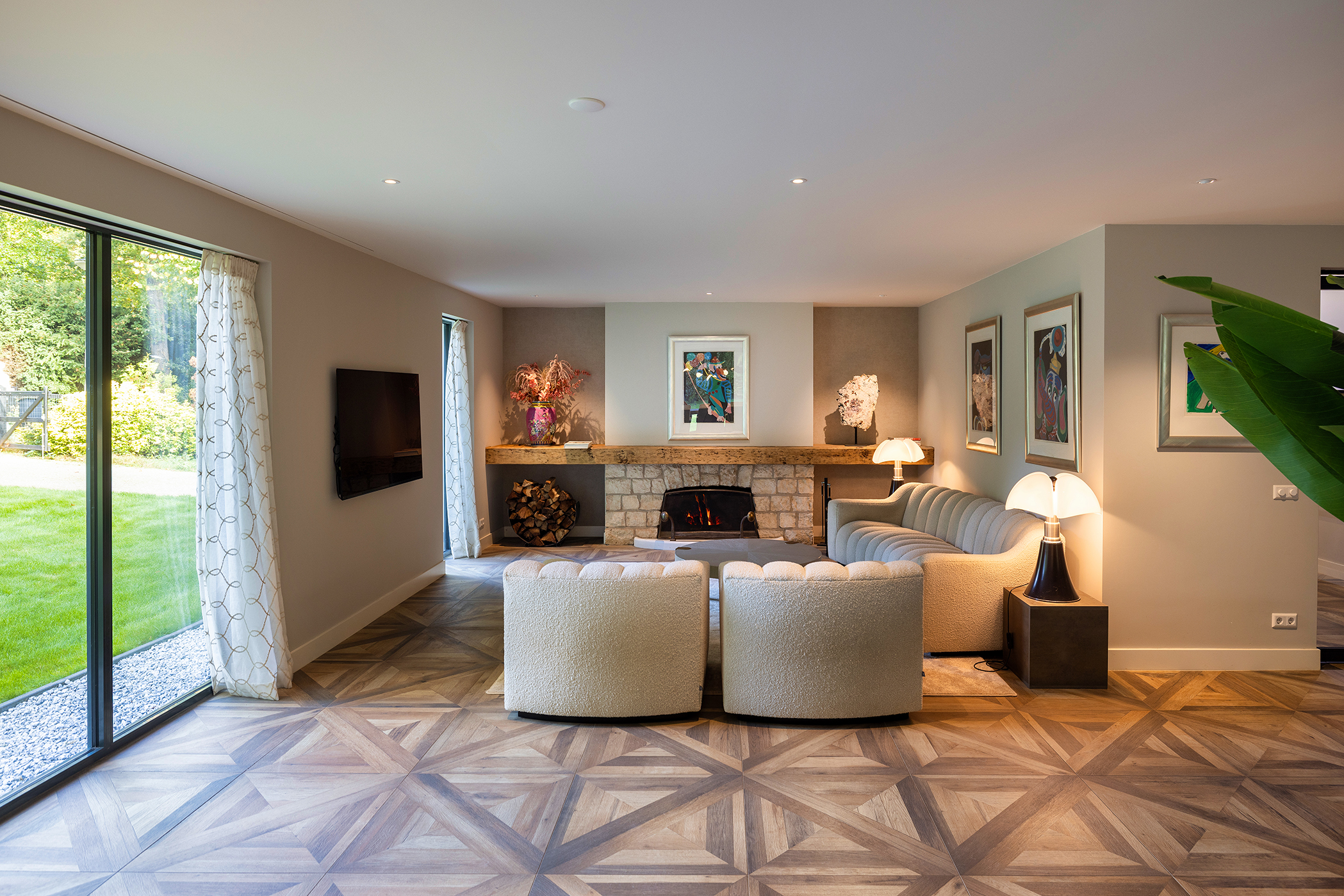 De woonkamer straalt rust en elegantie uit. De open haard vormt het warme middelpunt tijdens de wintermaanden, terwijl in de zomer de openslaande deuren naar het ruime terras zorgen dat het buitenleven een natuurlijk verlengstuk wordt van de woning.