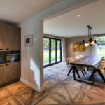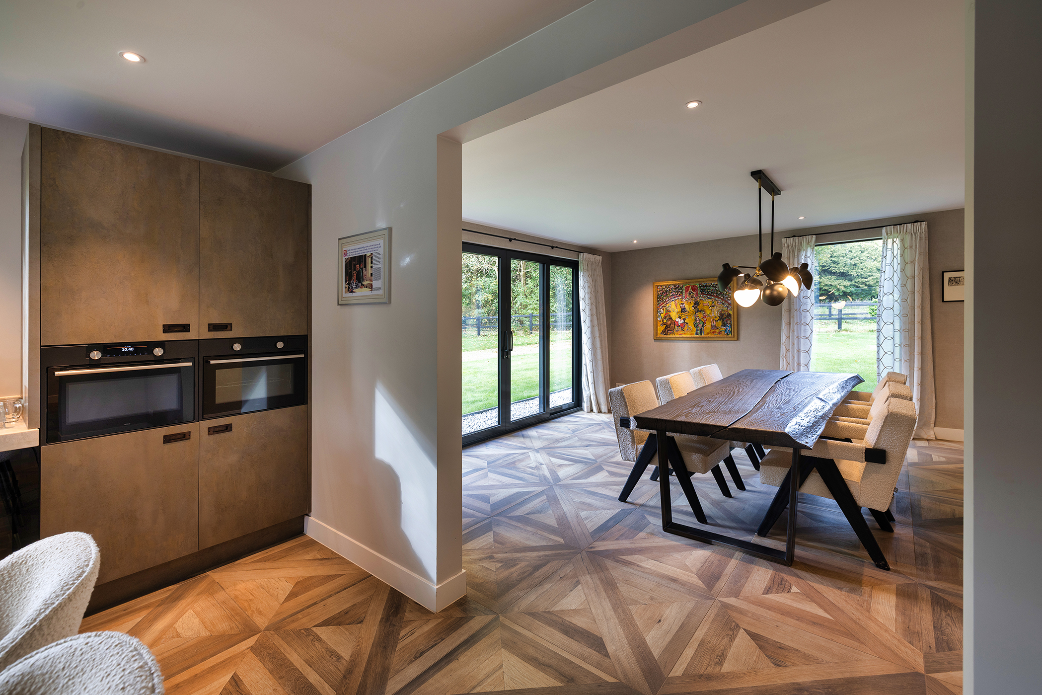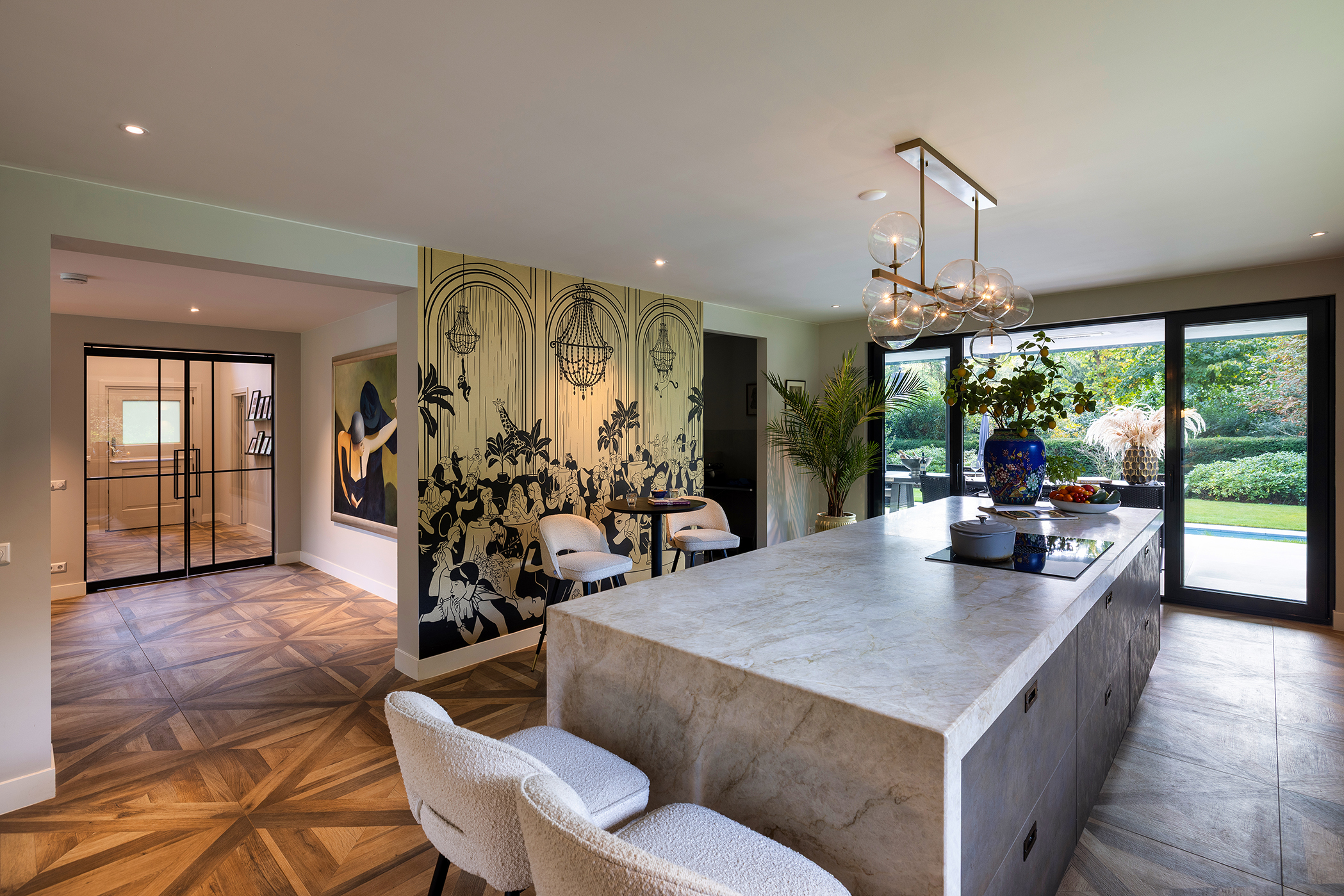Via openslaande deuren betreedt u de centrale leefruimte, waarin woonkamer, eetkamer en keuken in open verbinding met elkaar staan. Vanuit iedere hoek is er zicht op de zorgvuldig aangelegde tuin; binnen en buiten vloeien moeiteloos in elkaar over.