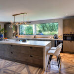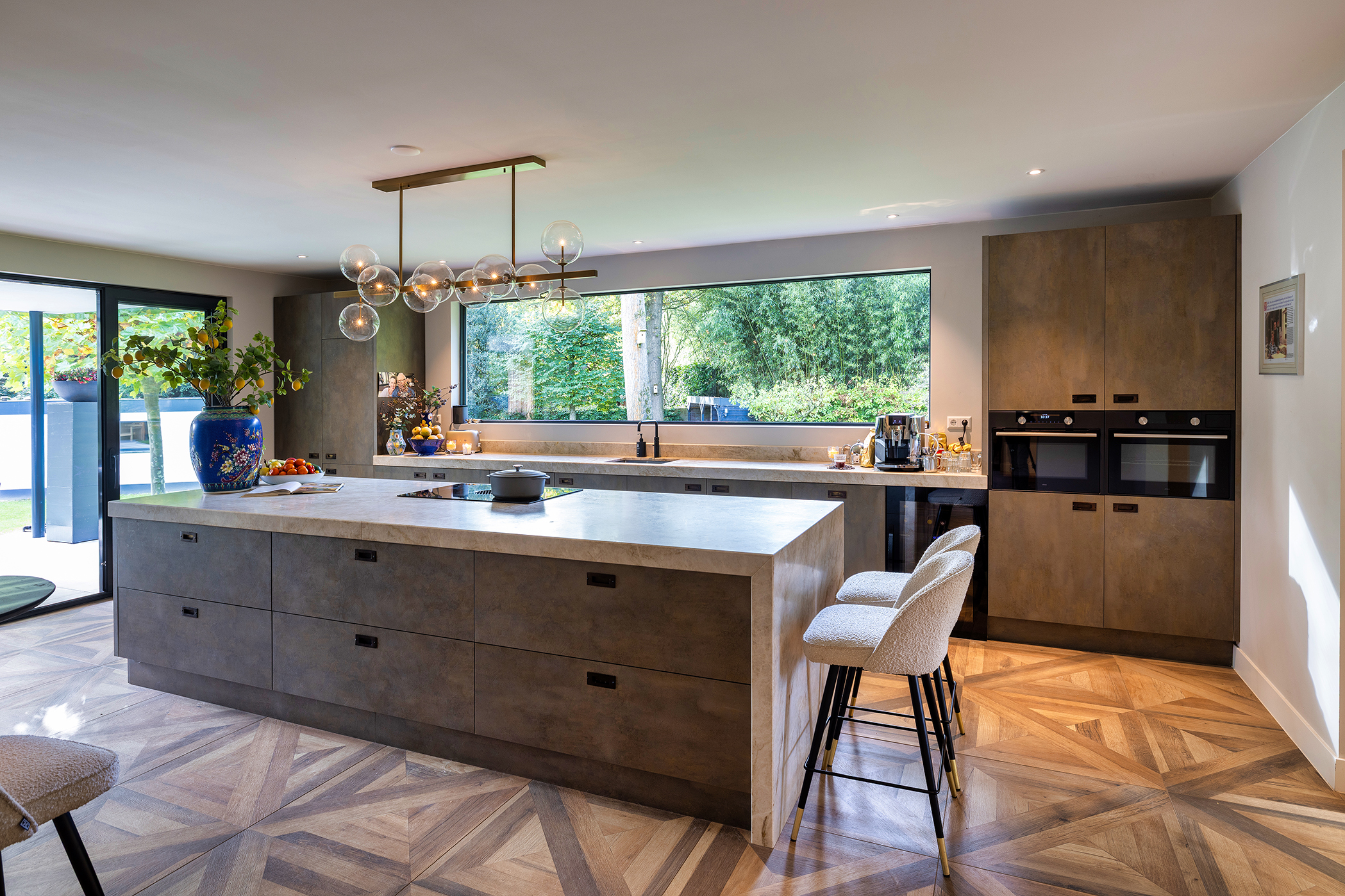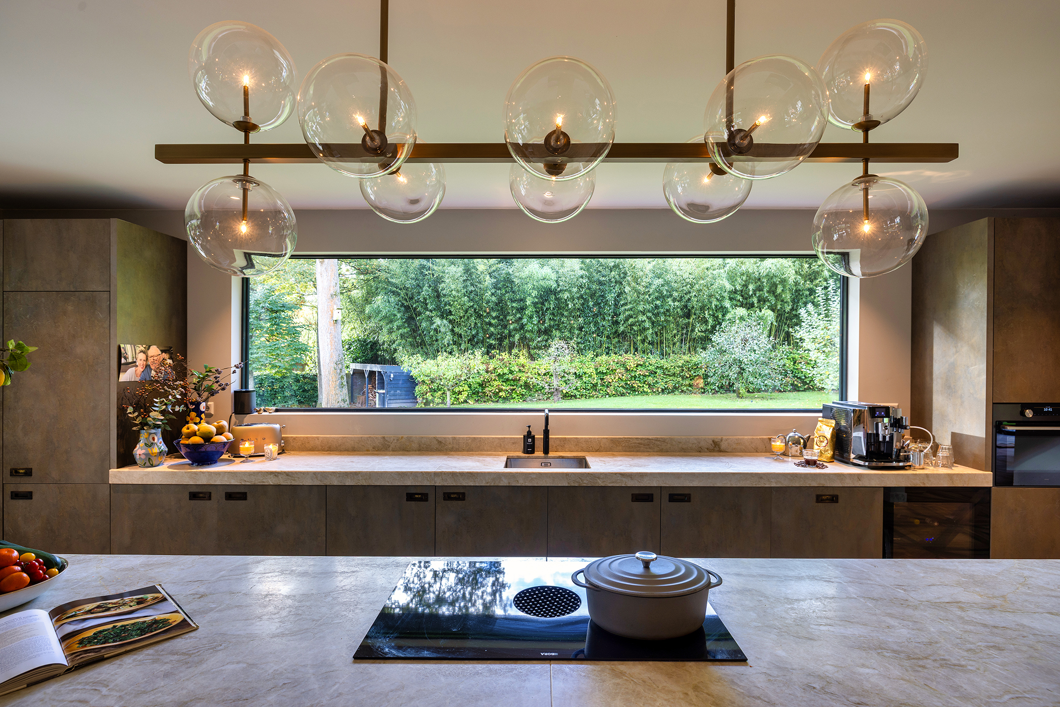 De grote woonkeuken is eigenlijk één van de aantrekkelijkste ruimtes in het pand. Door haar afmetingen en gezelligheid vervult de woonkeuken – uiteraard voorzien van alle denkbare apparatuur – een soort centrale functie, waarbij je dankzij het panoramaraam uitkijkt op het omliggende groen.