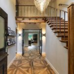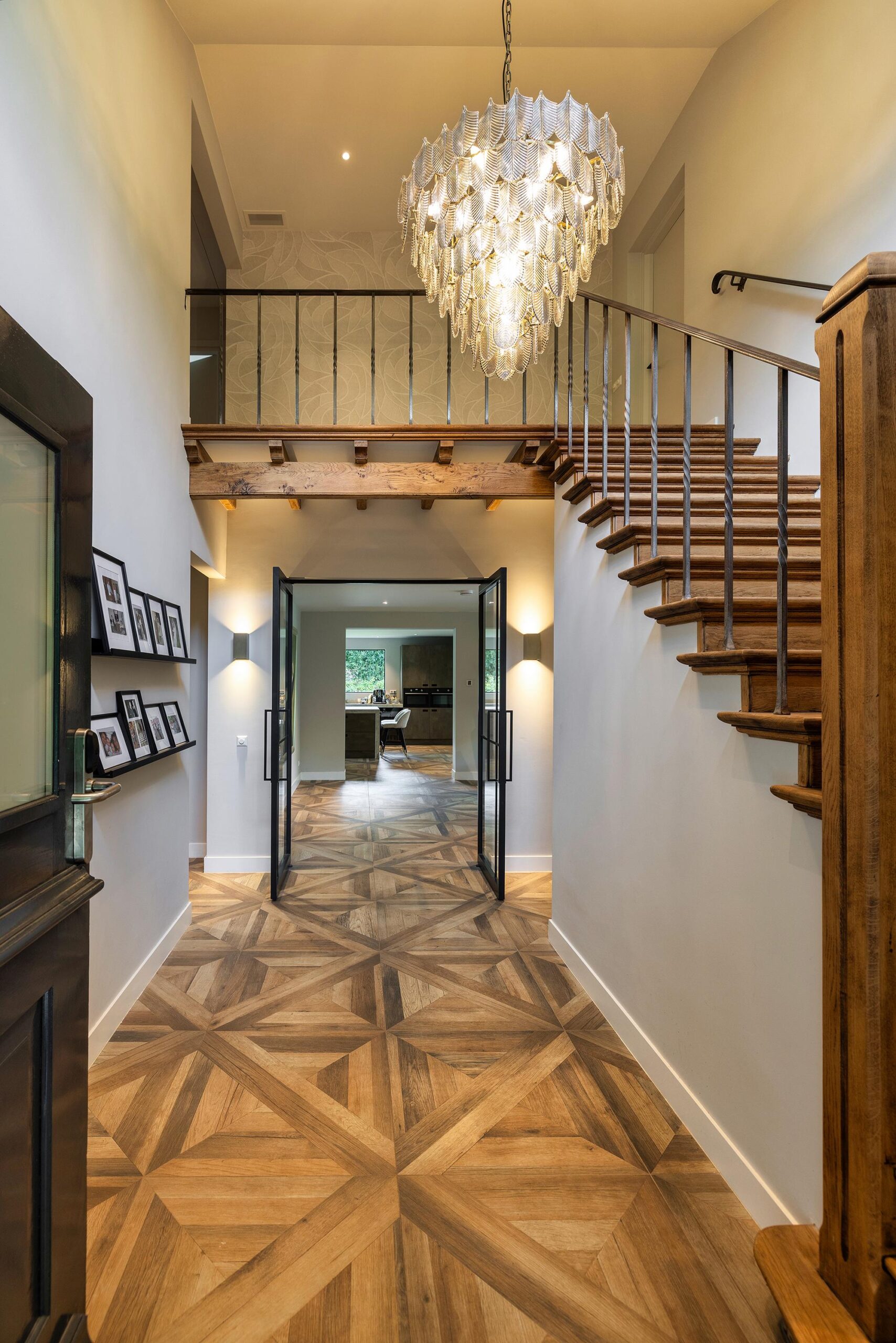 De imposante entreehal verwelkomt u met een gevoel van grandeur. Hier vallen direct de markante trap — een architectonisch statement — en de open haard op, samen de enige overblijfselen van de oorspronkelijke woning. De hal beschikt over een ruime garderobe en een elegant gastentoilet.