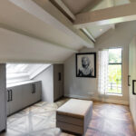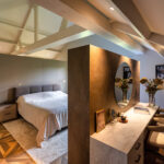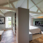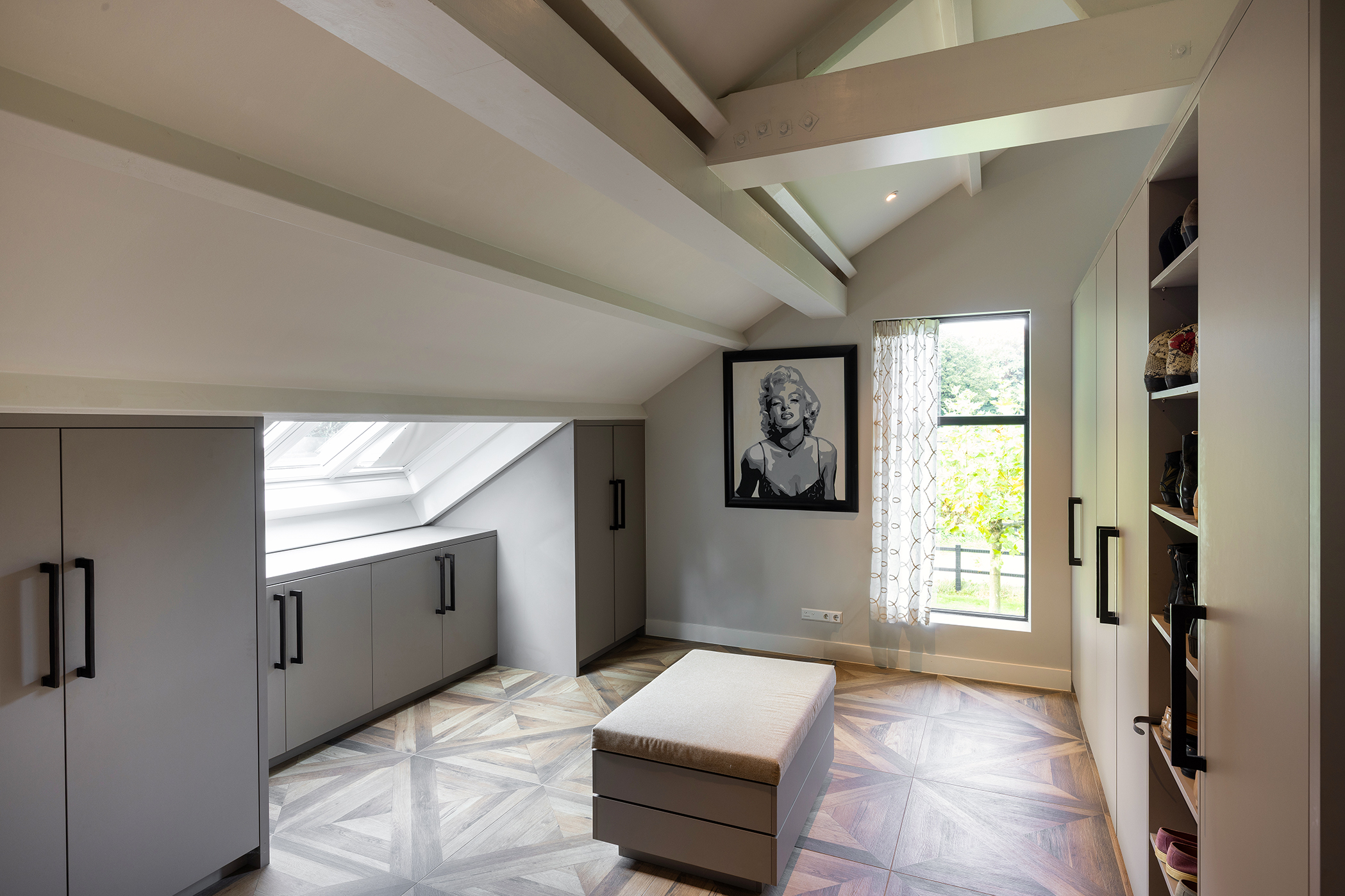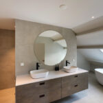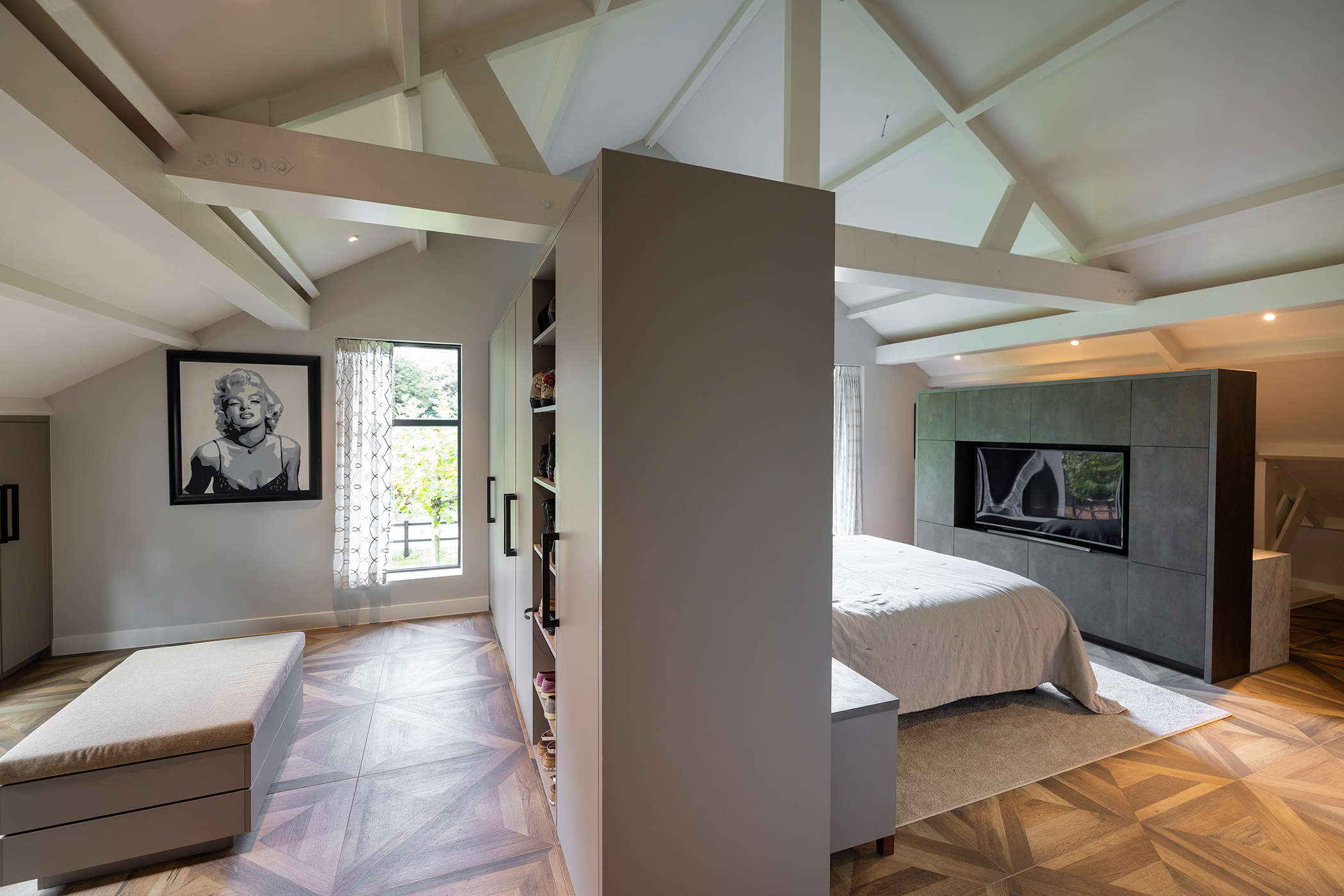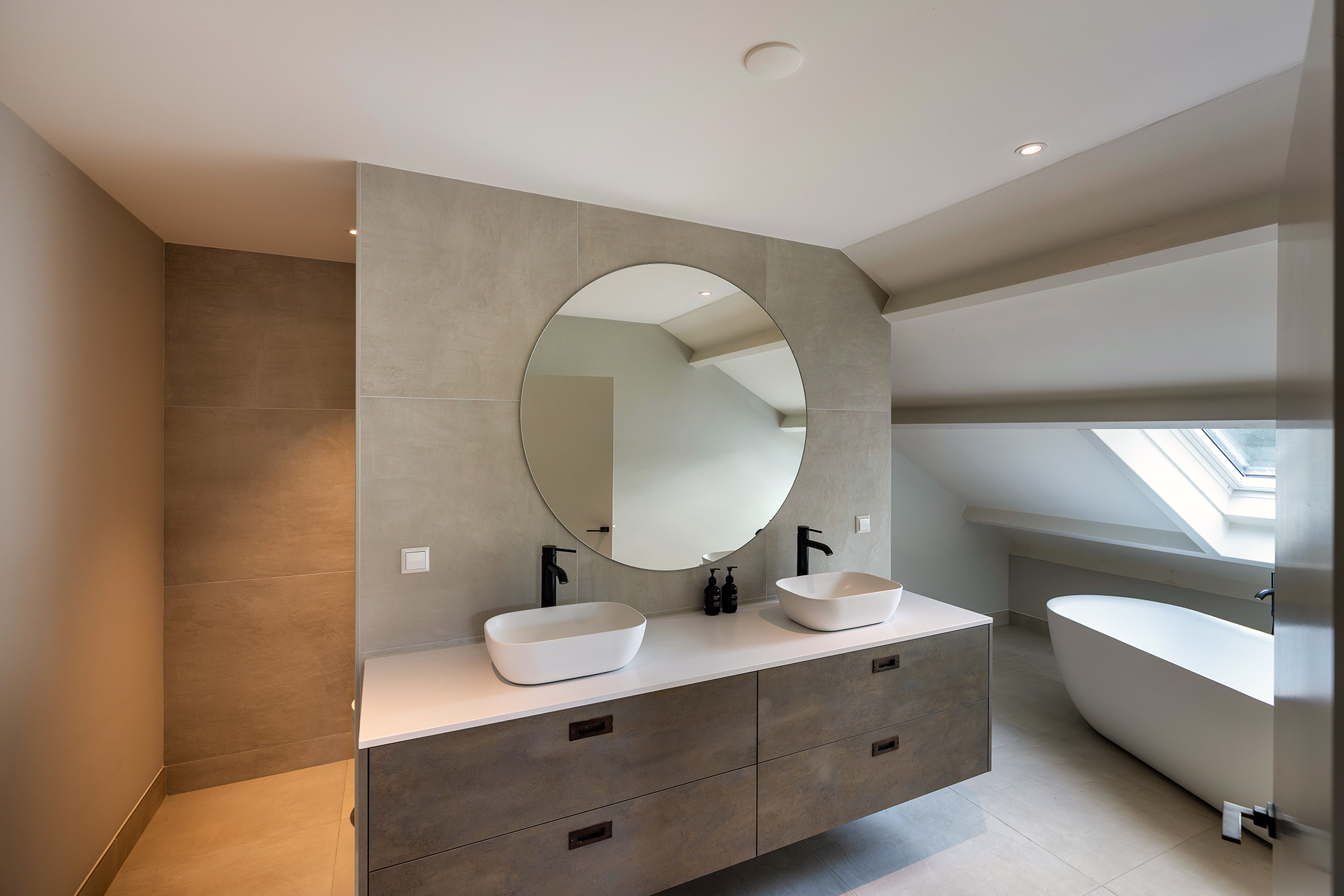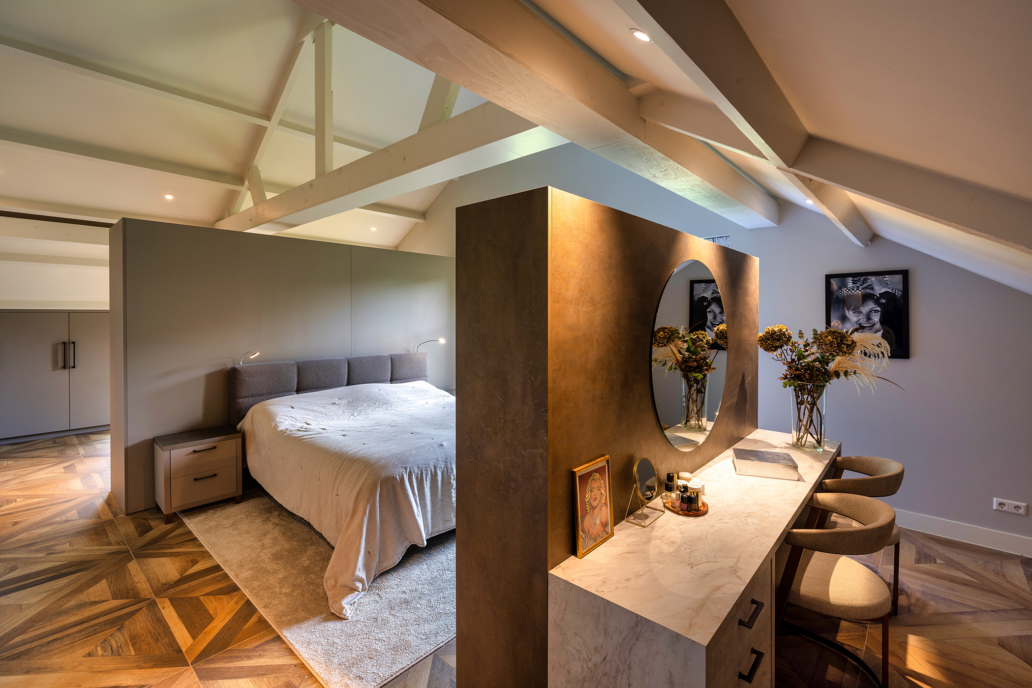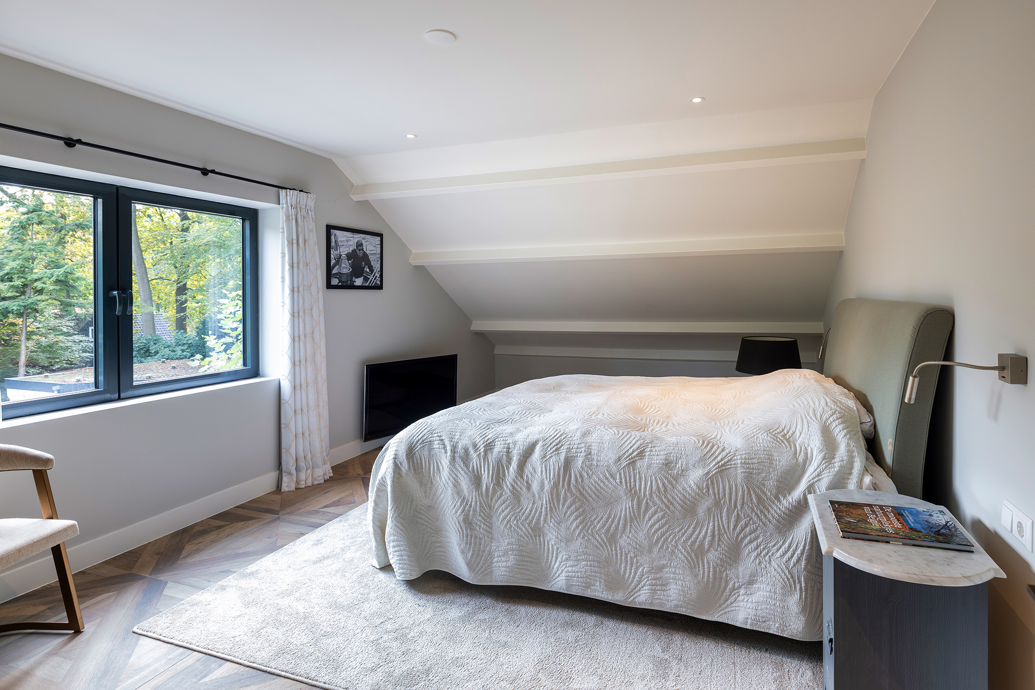 Op de eerste verdieping bevindt zich de masterbedroom (2): ruim, licht en harmonieus vormgegeven. De schuine lijnen benadrukken het karakter van de woning, terwijl de vele ramen zorgen voor een zachte lichtinval en uitzicht op het tegenovergelegen natuurgebied. De kamer beschikt over een slaapgedeelte, ruime inloopkast, aparte dressing en een luxueuze badkamer (2) met ligbad, inloopdouche en dubbele wastafel.