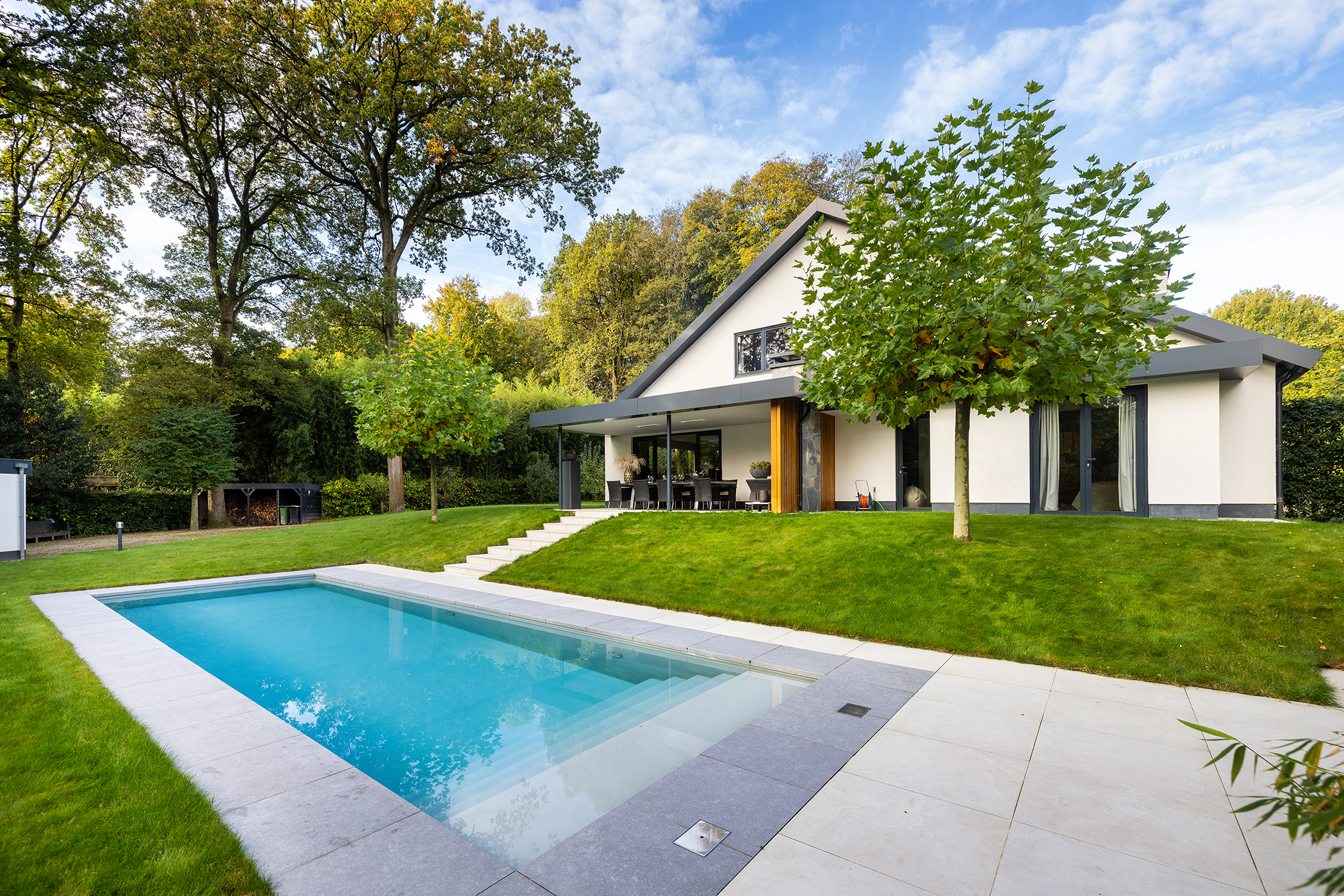 Het verwarmde buitenzwembad vormt een prachtig contrast met het groen van de tuin. De zorgvuldig aangelegde tuin met volwassen bomen en volgroeide beplanting straalt rust en evenwicht uit. Dankzij de automatische sproei-installatie en bronput is het onderhoud minimaal, terwijl de subtiele buitenverlichting de tuin ’s avonds verandert in een oase van sfeer.