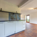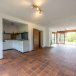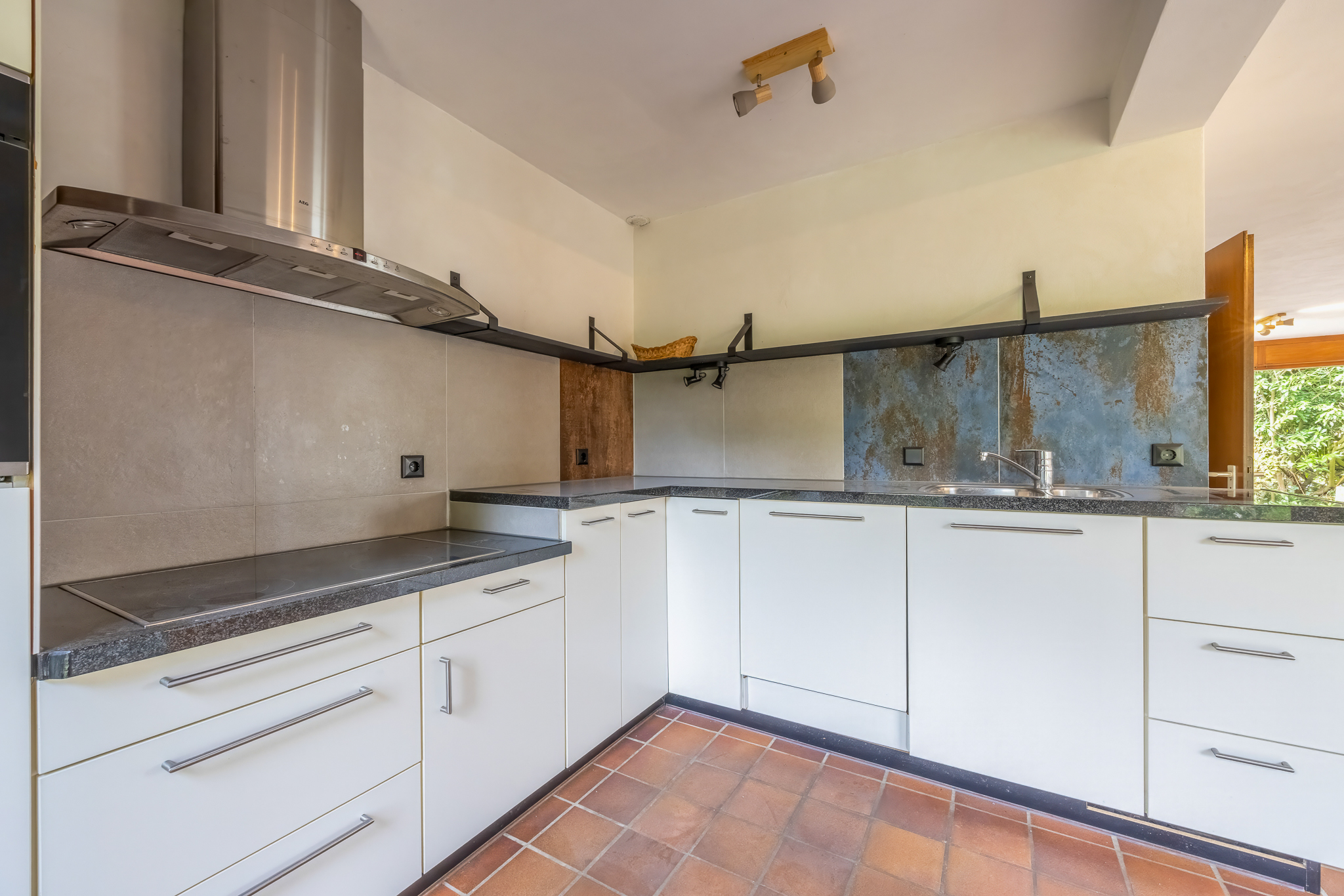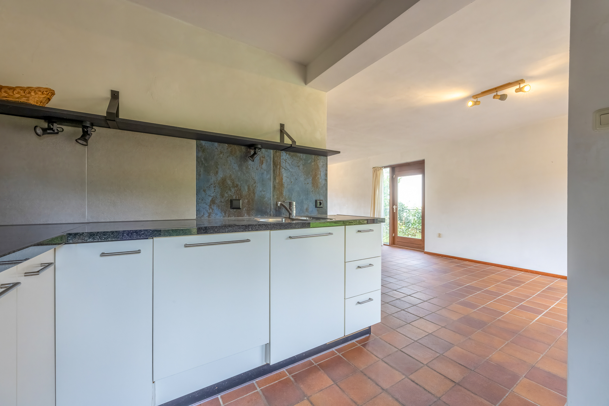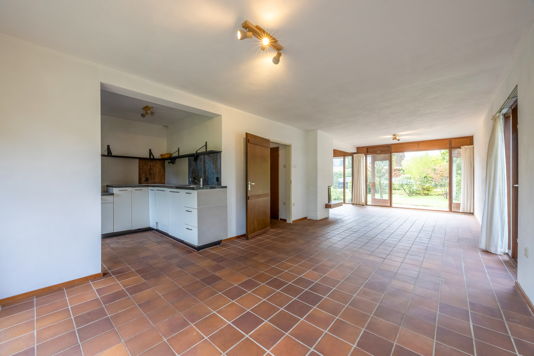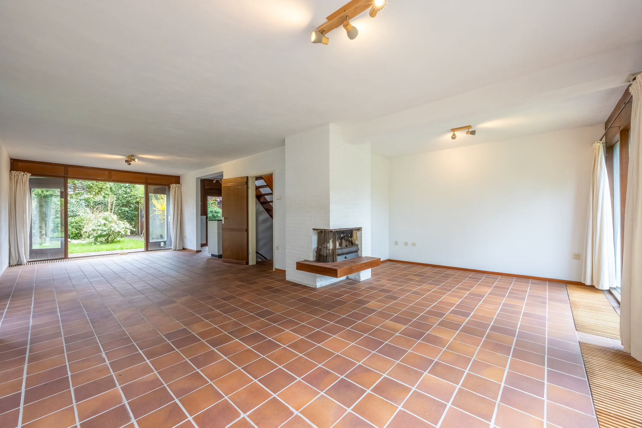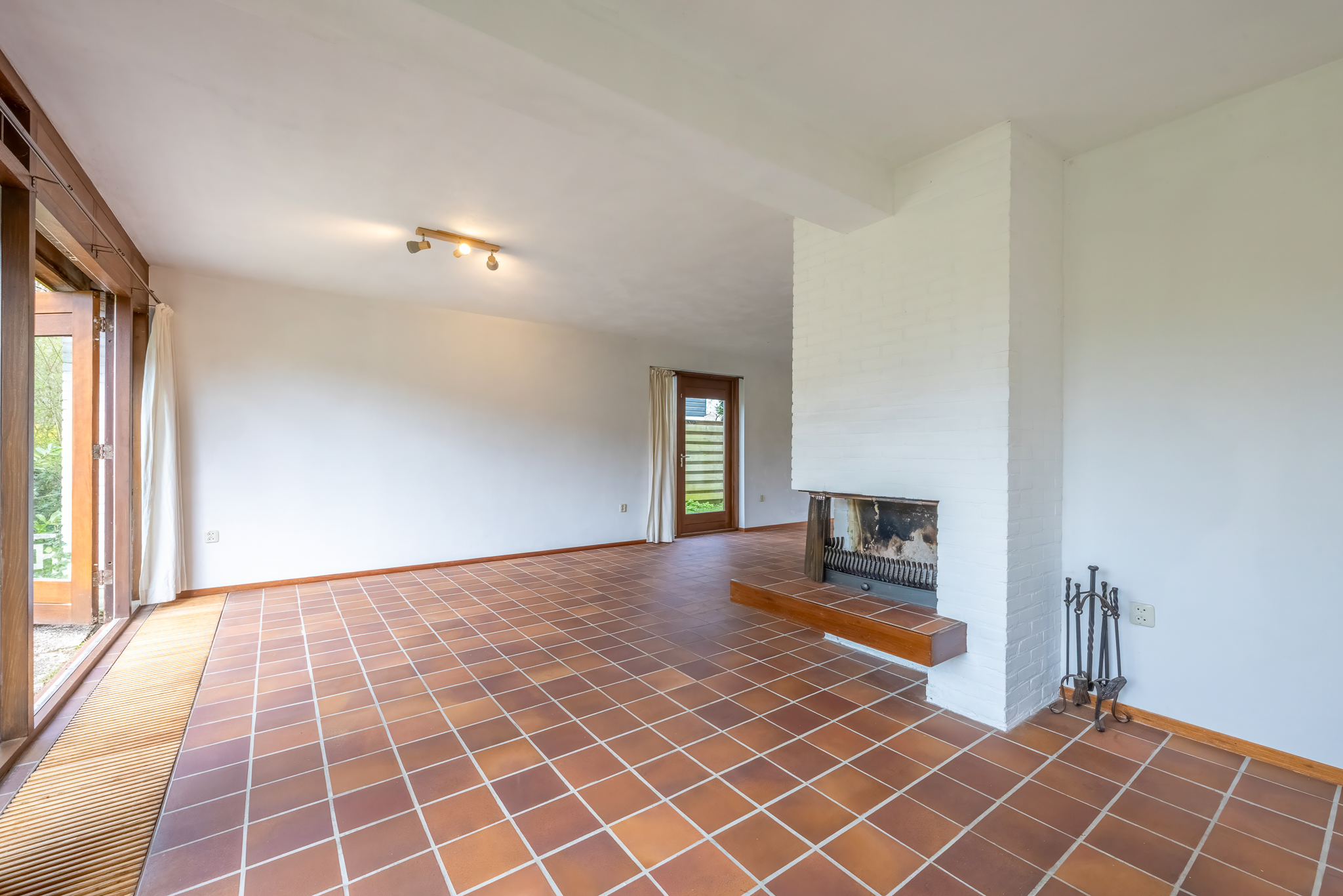 Indeling: entree, hal, moderne meterkast, toilet, L-vormige living met openhaard en aan 2 zijden openslaande deuren naar de tuin. Moderne keuken voorzien van diverse inbouwapparatuur, bestaande uit een oven, koelkast, inductie kookplaat en een vaatwasser.
