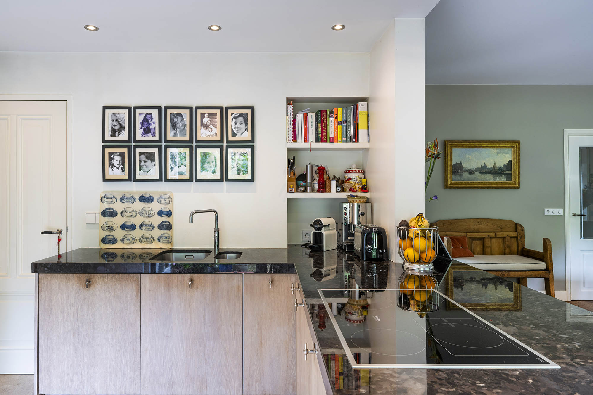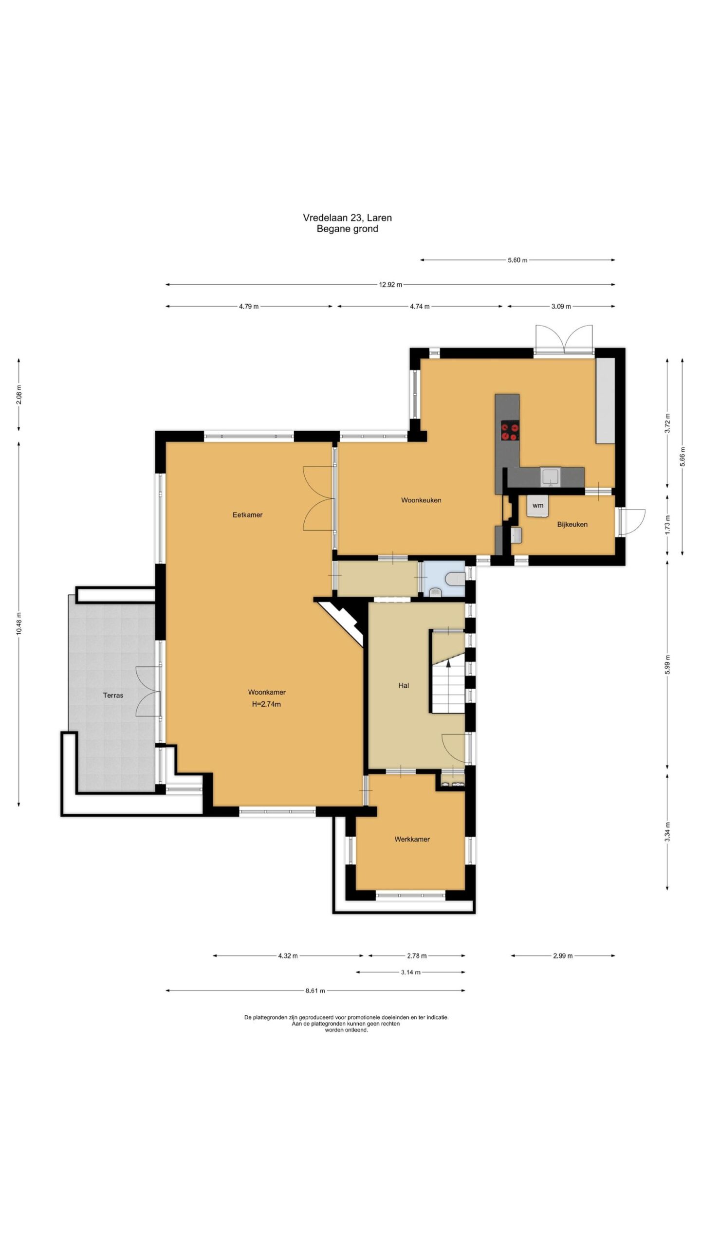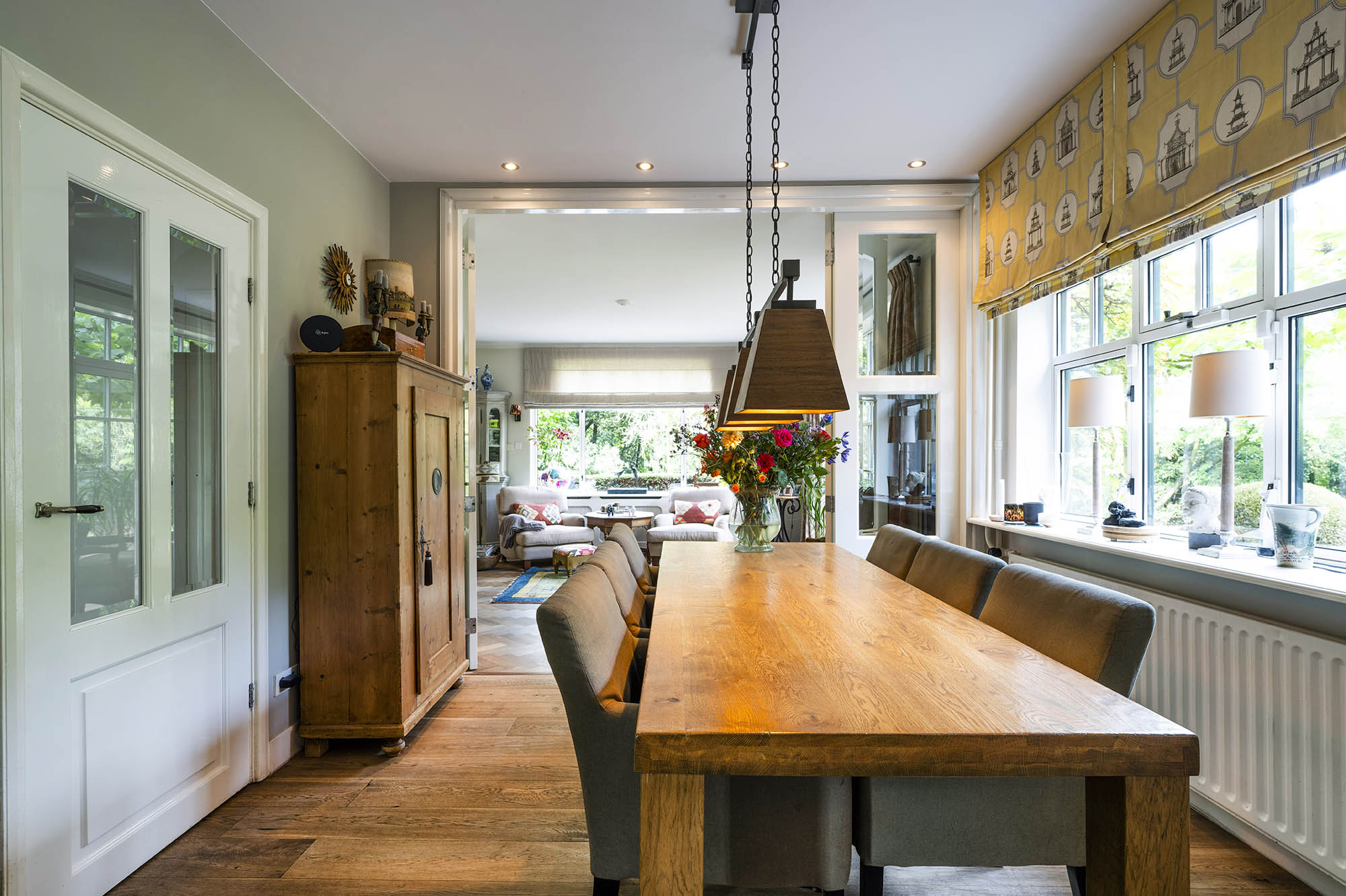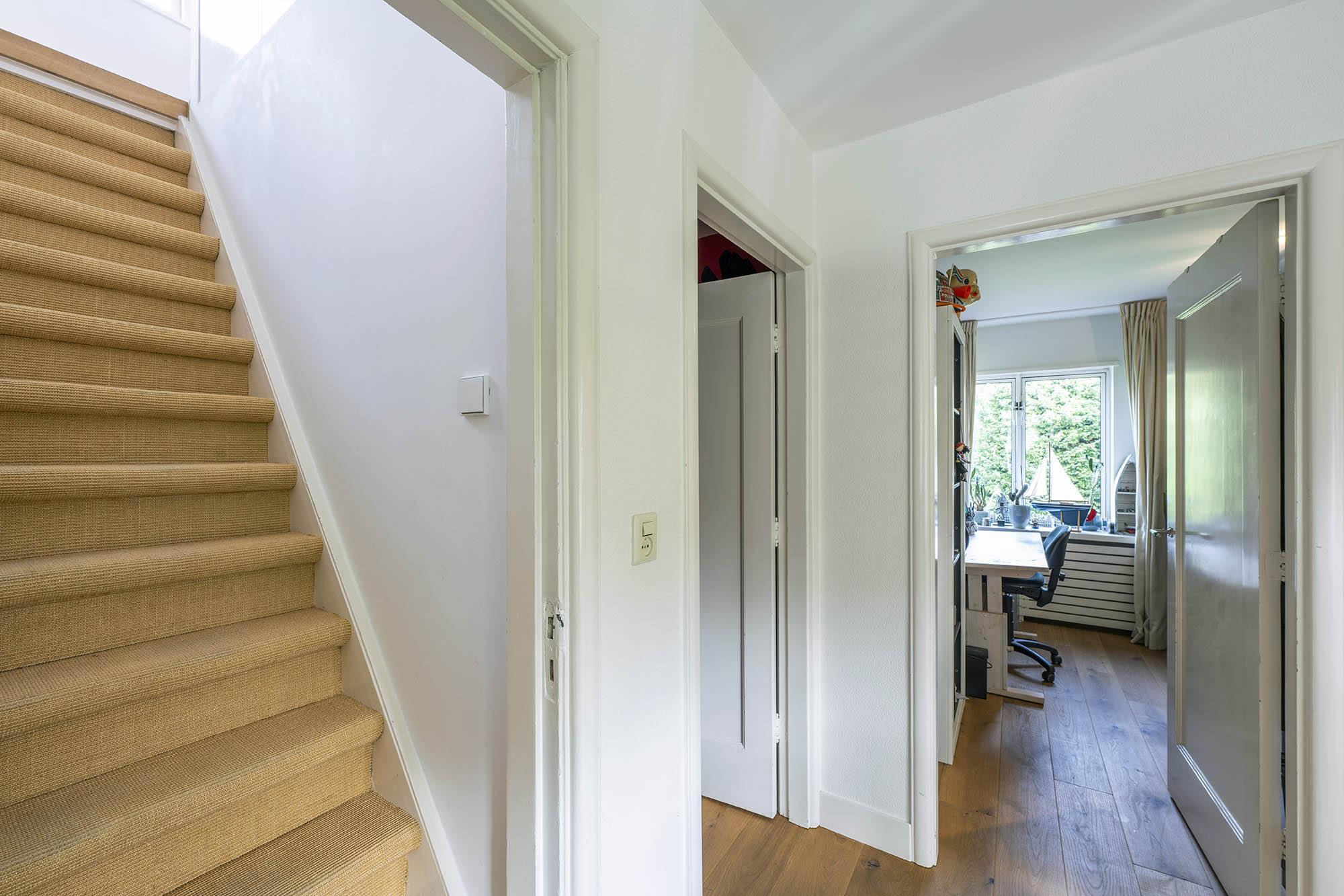 Via de entree komt u in de ruime hal met trapopgang, garderobe en gastentoilet. Vanuit hier heeft u toegang tot de verschillende leefruimtes. De royale woonkamer met een hoogte van 2,74 meter is licht en sfeervol en biedt een prachtig uitzicht op de tuin. De kamer is voorzien van een prachtige houten visgraten vloer en heeft met openslaande deuren direct toegang geeft tot het zonnige terras – ideaal voor lange zomeravonden. Aansluitend bevindt zich de eetkamer die in verbinding staat de woonkeuken. De woonkeuken is ruim opgezet en vormt het hart van het huis. Hier is alle ruimte voor een grote eettafel, waardoor koken en tafelen moeiteloos samenkomen. Vanuit de keuken bereikt u de praktische bijkeuken met extra kastruimte en een eigen buitendeur. Aan de voorzijde van de woning bevindt zich een separate werk- of speelkamer, die zich uitstekend leent als thuiswerkplek, bibliotheek of tv-kamer. De begane grond kenmerkt zich door de ruime, logische indeling, de prettige lichtinval en het directe contact met de tuin rondom.