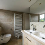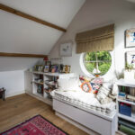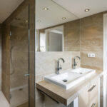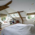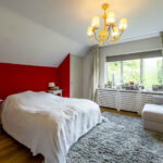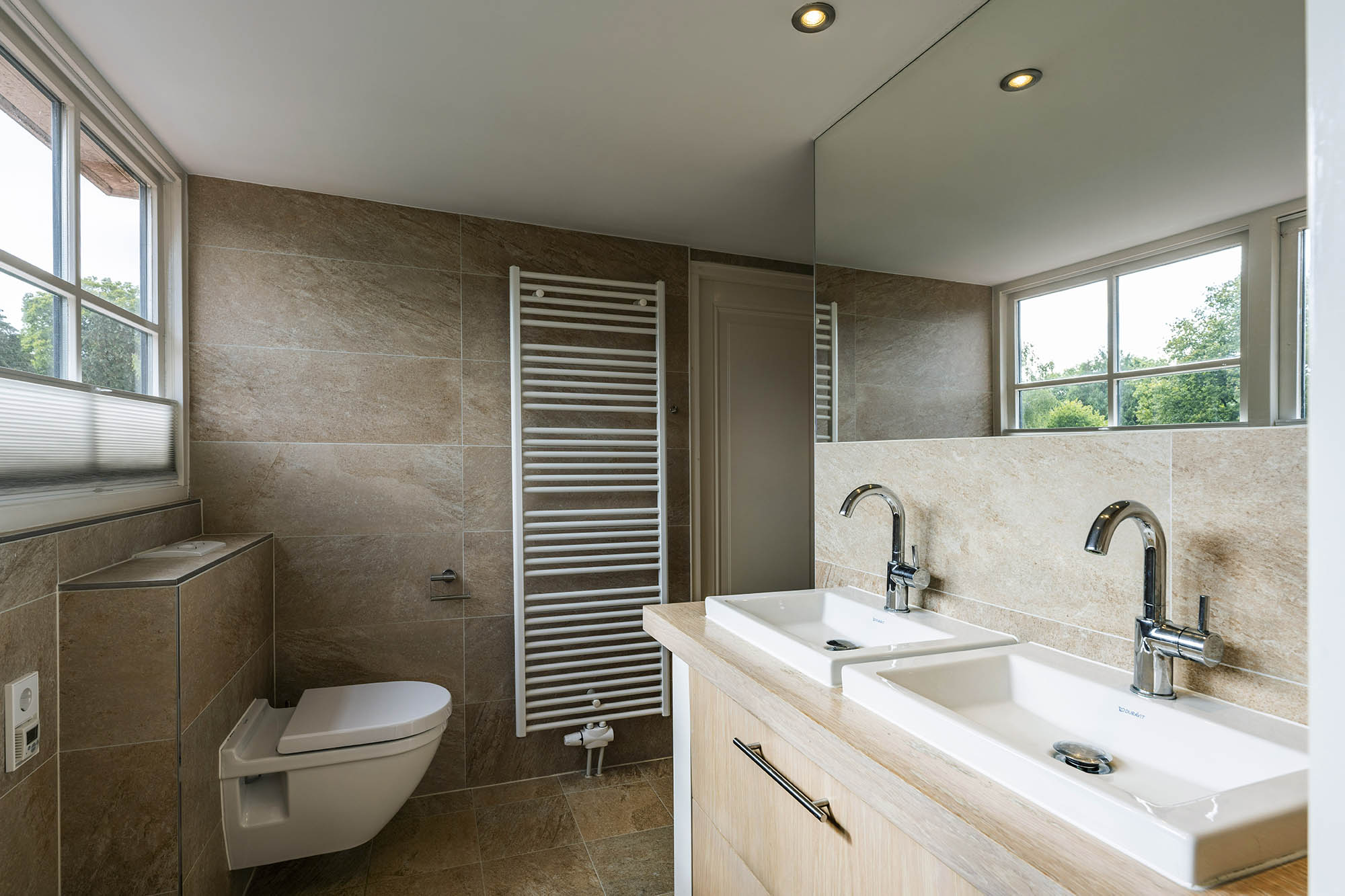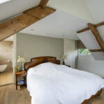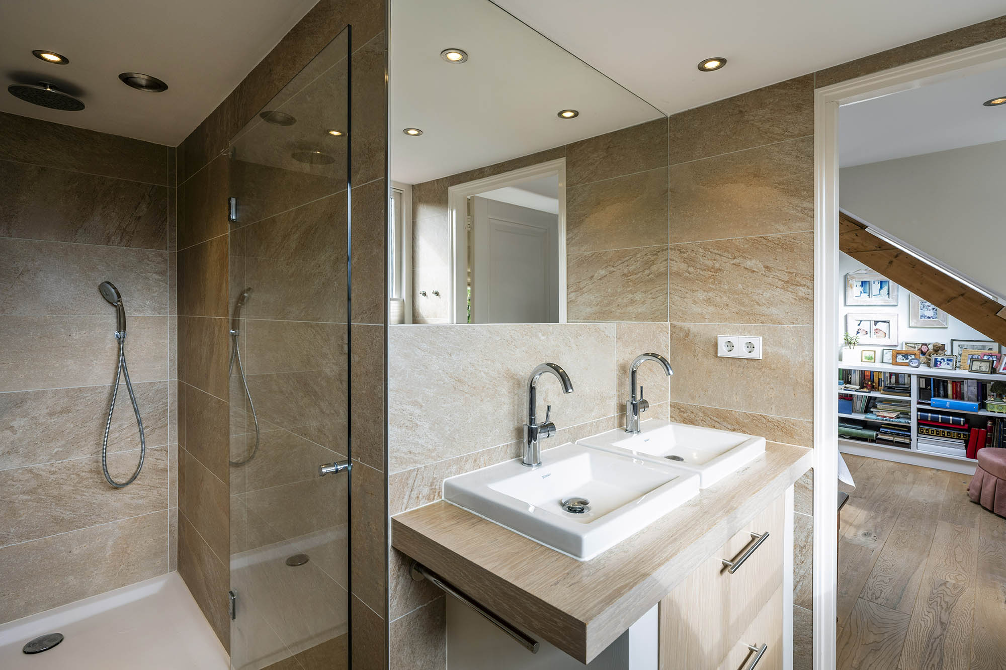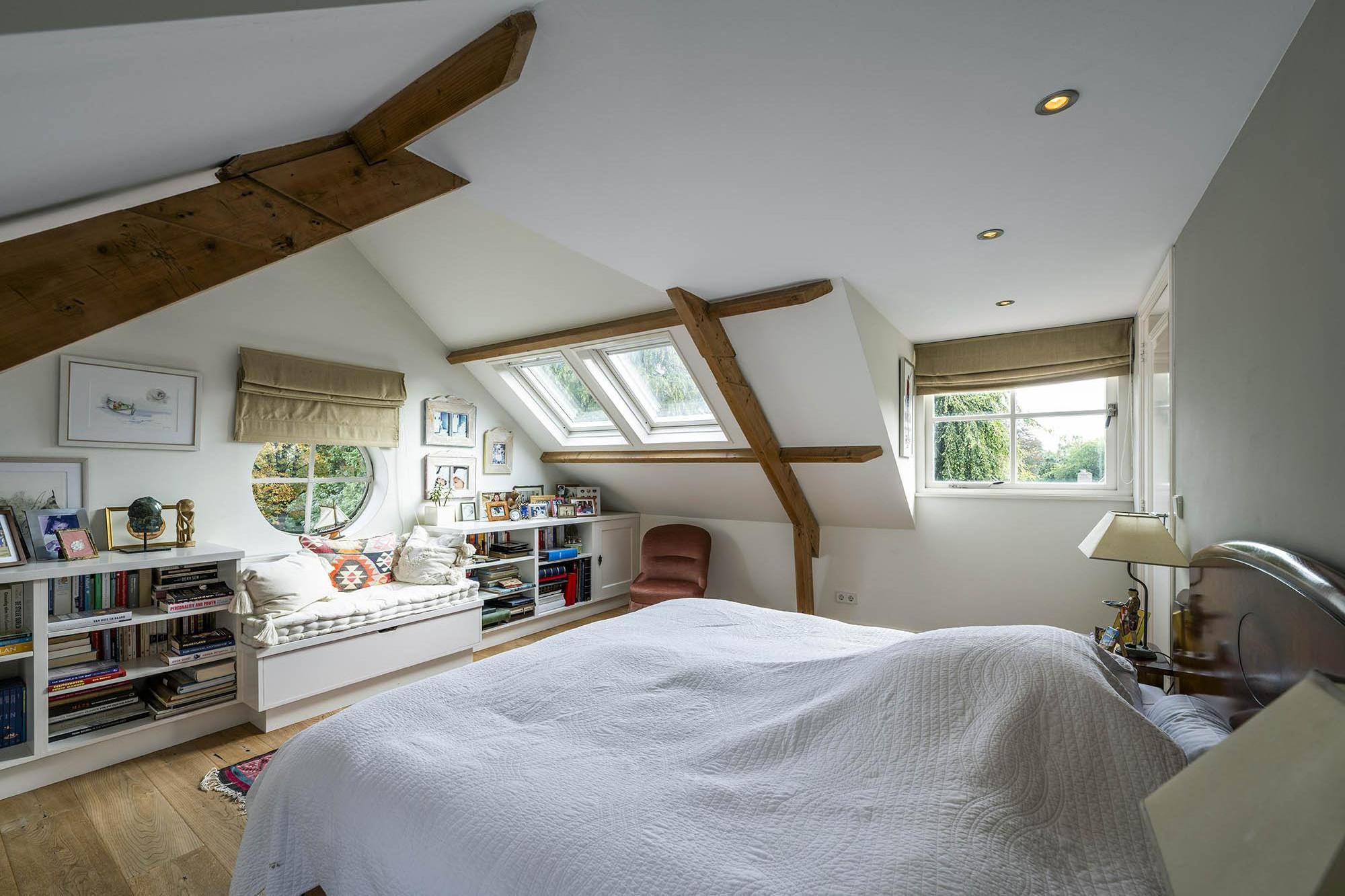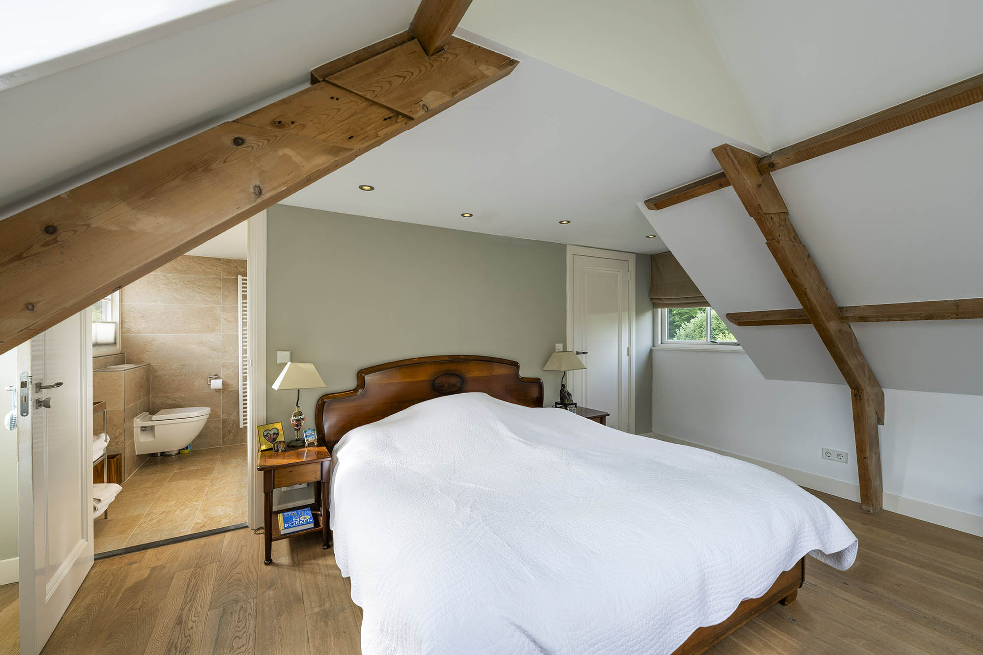 Via de overloop zijn twee ruime slaapkamers bereikbaar, waarvan één aan de voorzijde en de ander aan de achterzijde gelegen. Beide kamers ontvangen veel natuurlijk licht dankzij de vele ramen rondom en hebben een nokhoogte van maar liefst 2,74 meter. De tweede badkamer is uitgerust met een dubbele wastafel, douche, wc en vloerverwarming.