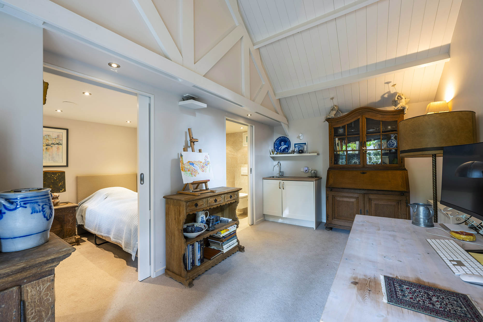 - Multifunctioneel bijgebouw van ca. 23 m², voorzien van een aparte slaapkamer en nog een extra badkamer