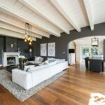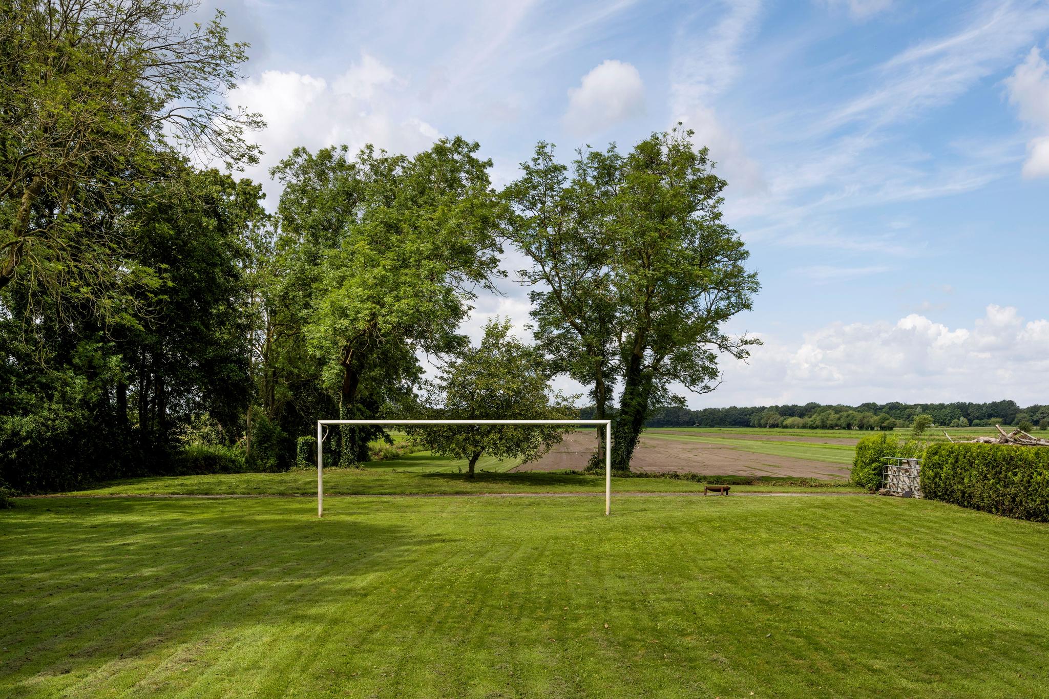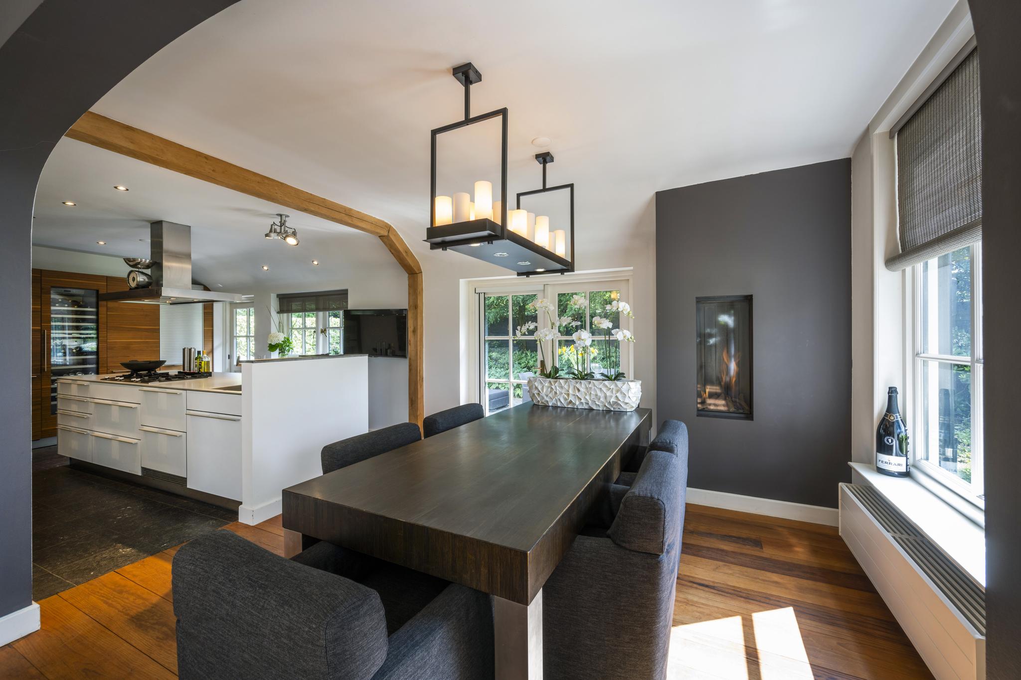 De zeer royale woonkamer is het middelpunt van deze fraaie woning. Hier ervaart u het buitenleven in optima forma. De riante raampartij biedt een magnifiek uitzicht over de prachtige tuin en de daarachter gelegen weilanden. De woonkamer is voorzien van een houten vloer, originele balkenplafond, open haard - het originele tegeltableau bij de open haard is nog geheel aanwezig achter de voorzetwand - en de opkamer, die thans in gebruik is als logeerkamer, maar uiteraard voor meer functies geschikt is. Aangrenzend aan de woonkamer vindt u de woonkeuken voorzien van Bulthaup-keuken met diverse inbouwapparatuur en vloerverwarming, wijnklimaatkast en een gashaard. Ook hier zijn openslaande deuren te vinden naar het op het Zuiden gelegen zijterras.