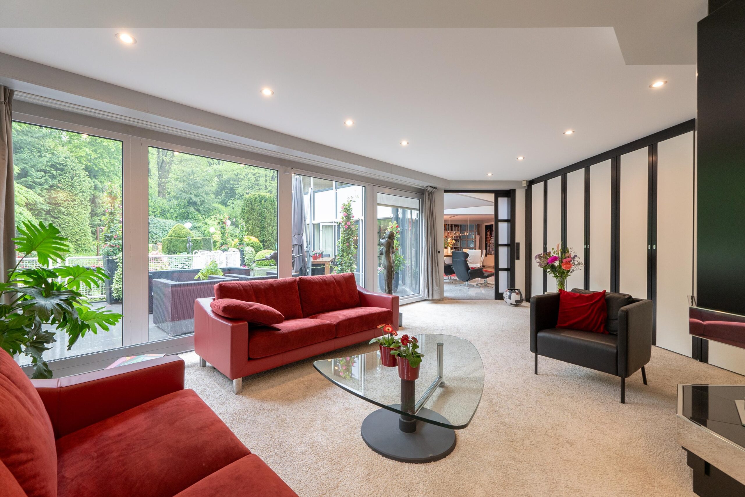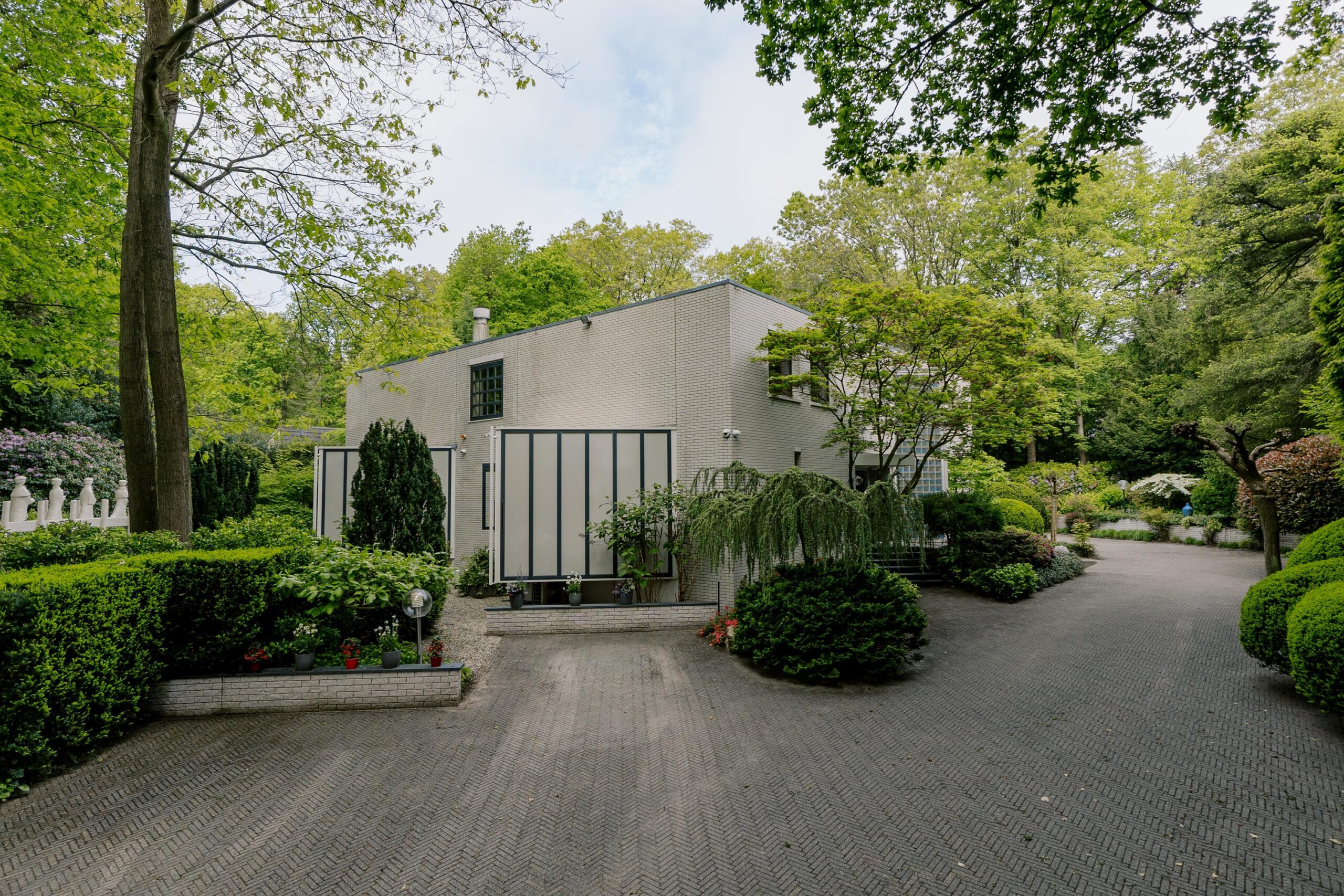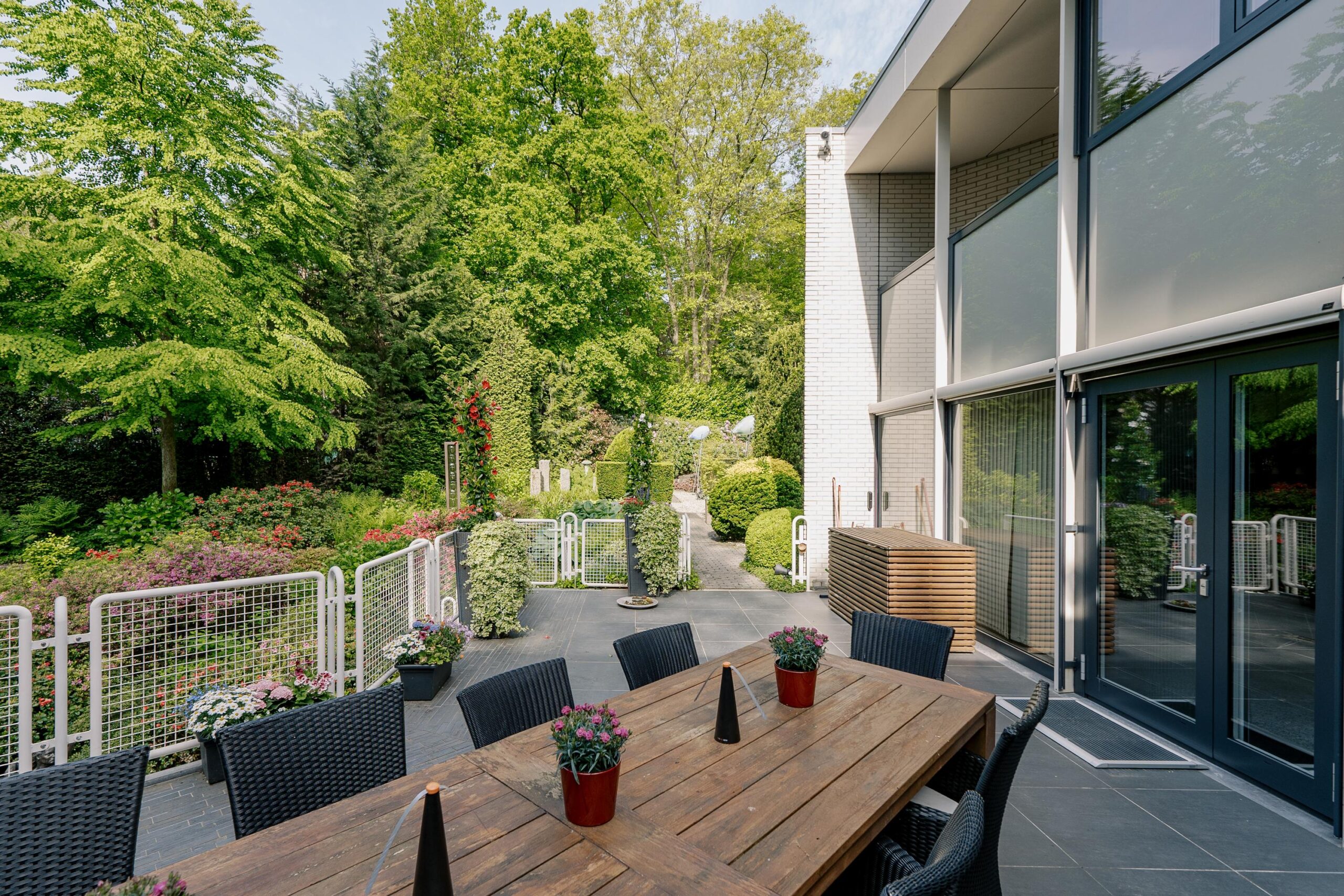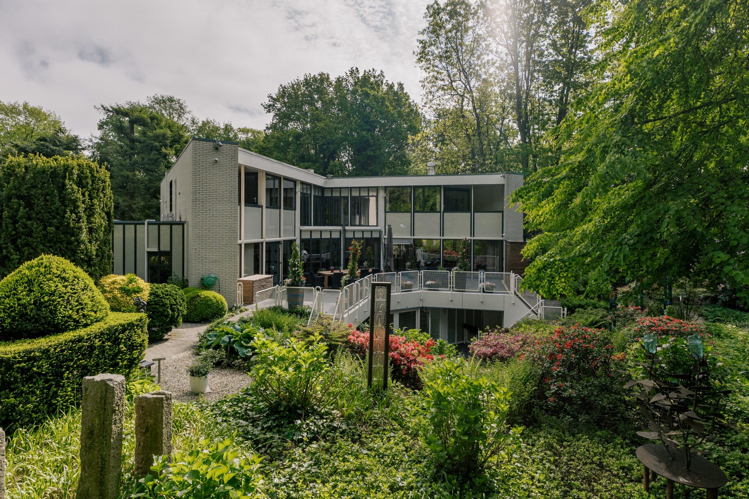 De tuin heeft een volwassen structuur van bomen en heesters, doorsneden met grindpaden die zich hier en daar openen tot beschutte zitjes. Vanuit de villa heeft u overal zicht op het weelderige groen van de tuin. En u heeft nogal wat kans om naar buiten te kijken want glas, licht en openheid zijn de kenmerken van dit staaltje moderne architectuur.