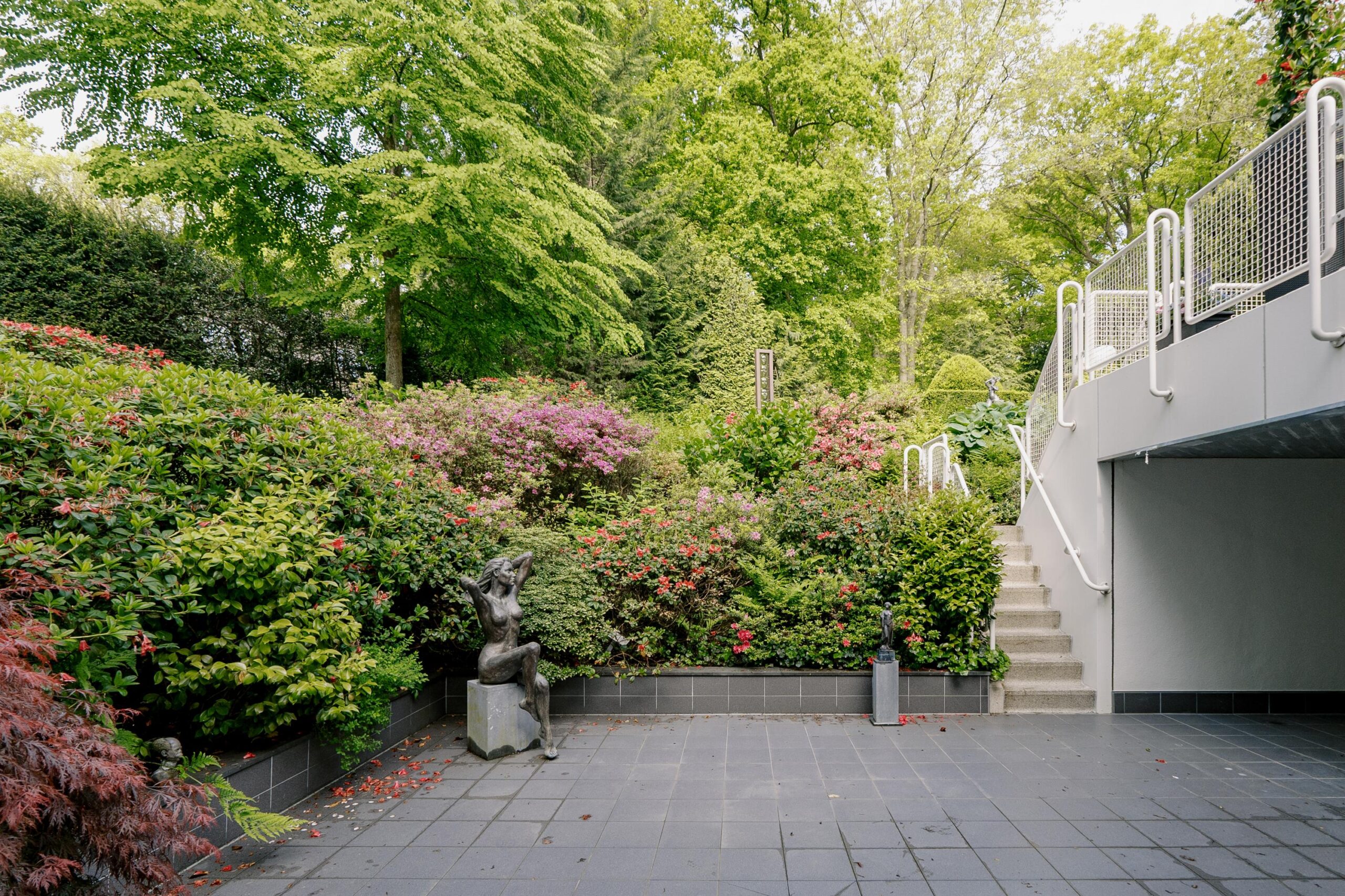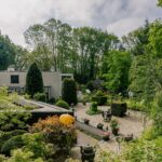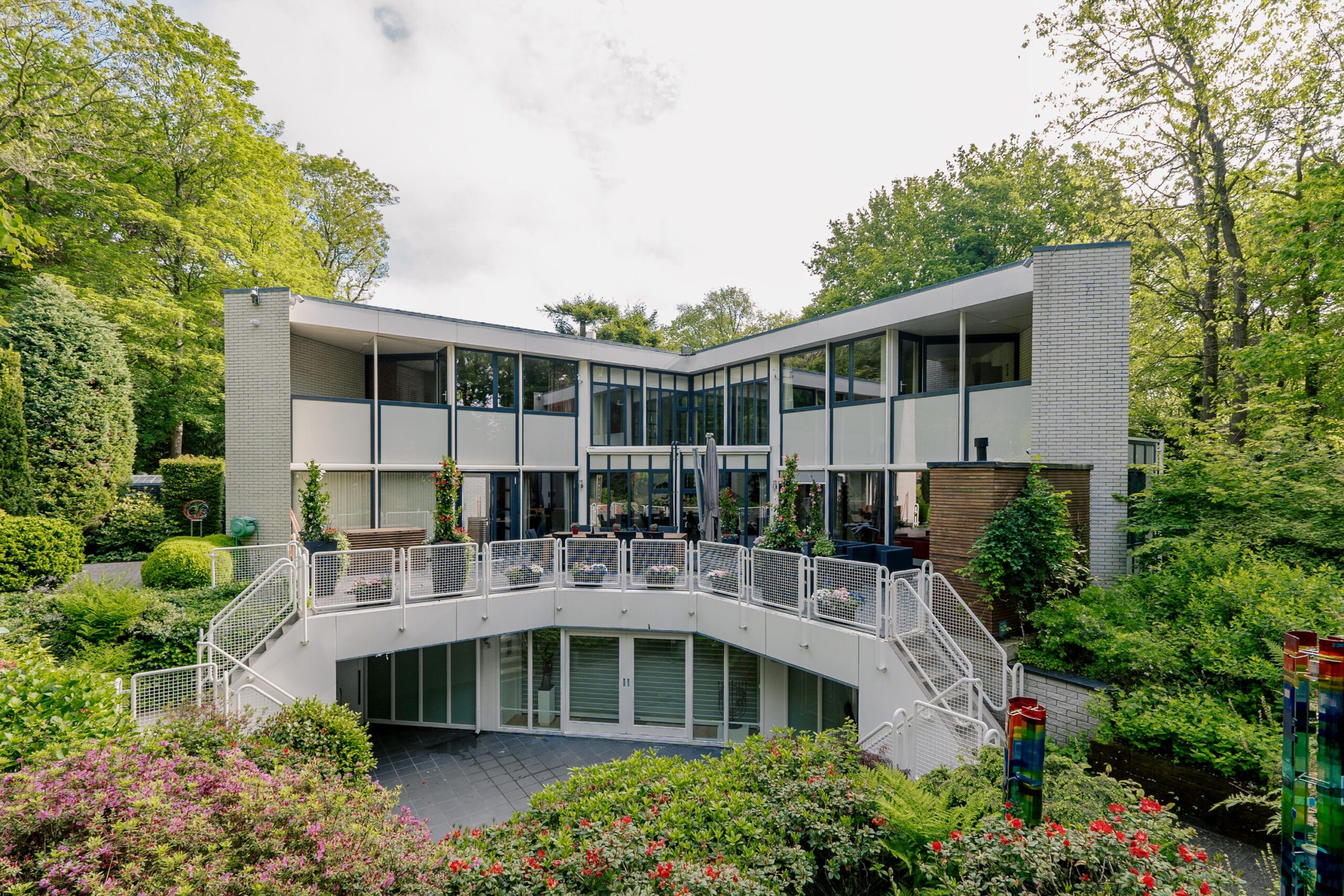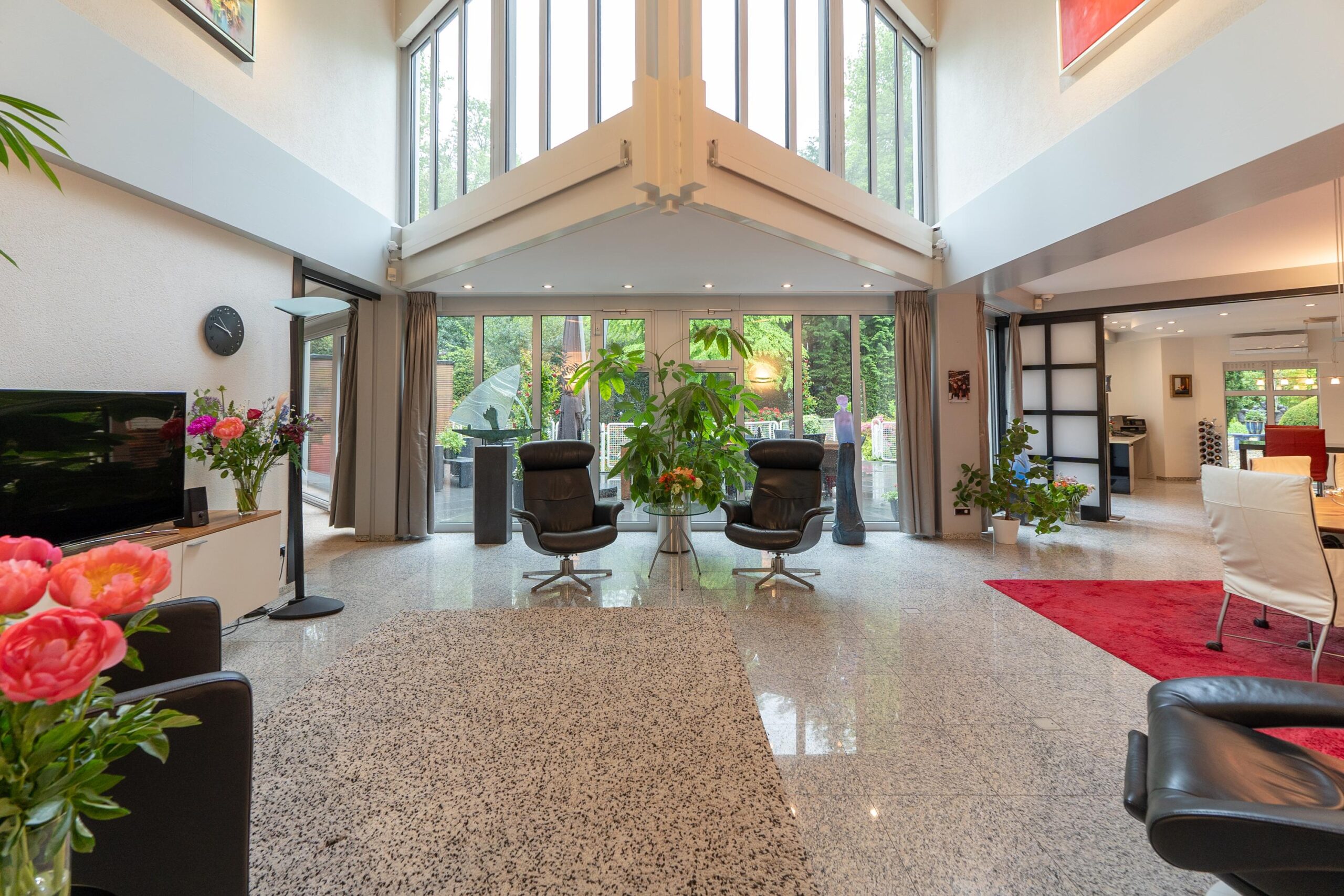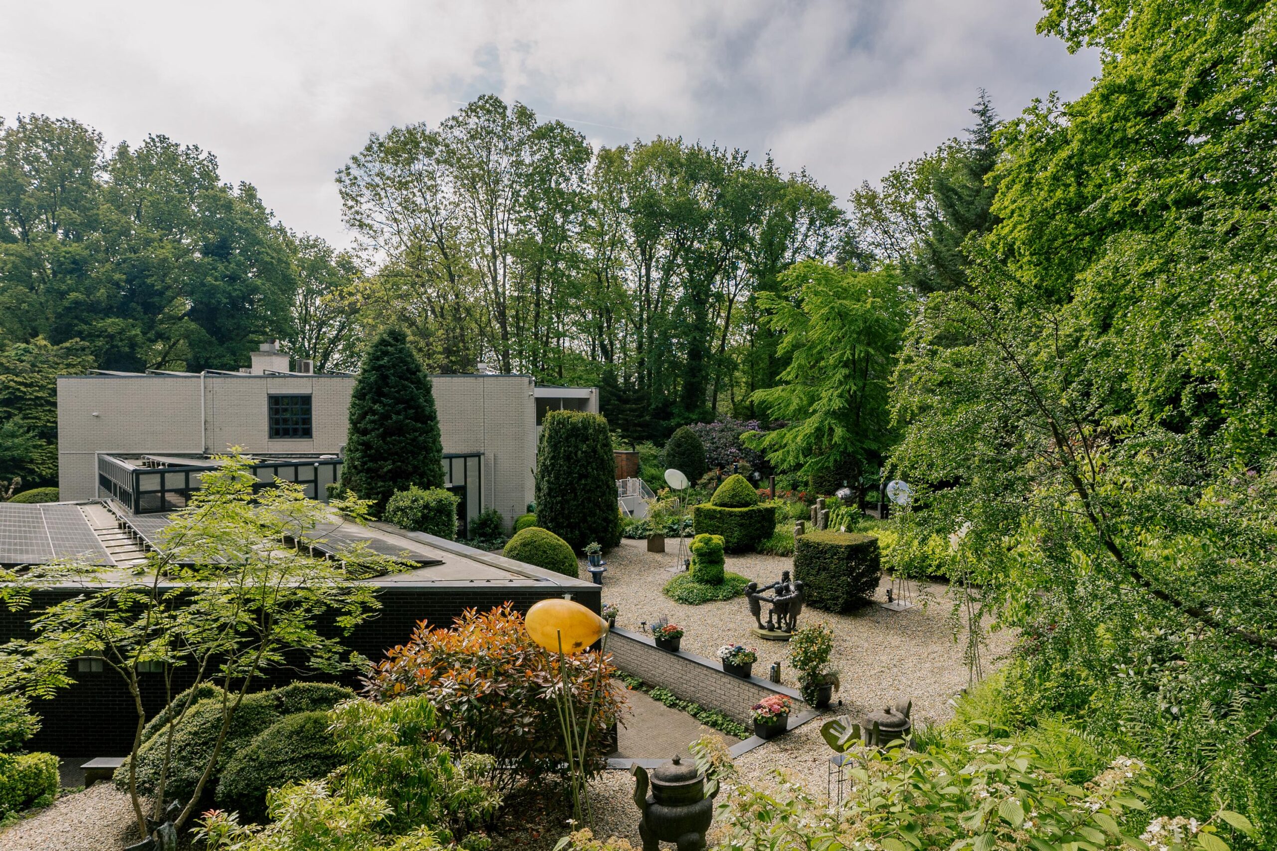 De tuin heeft een volwassen structuur van bomen en heesters, doorsneden met grindpaden die zich hier en daar openen tot beschutte zitjes. Vanuit de villa heeft u overal zicht op het weelderige groen van de tuin. En u heeft nogal wat kans om naar buiten te kijken want glas, licht en openheid zijn de kenmerken van dit staaltje moderne architectuur.