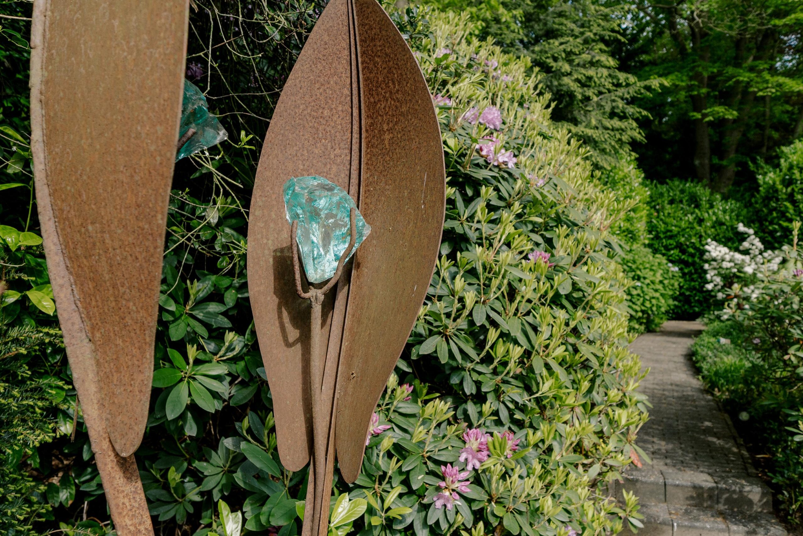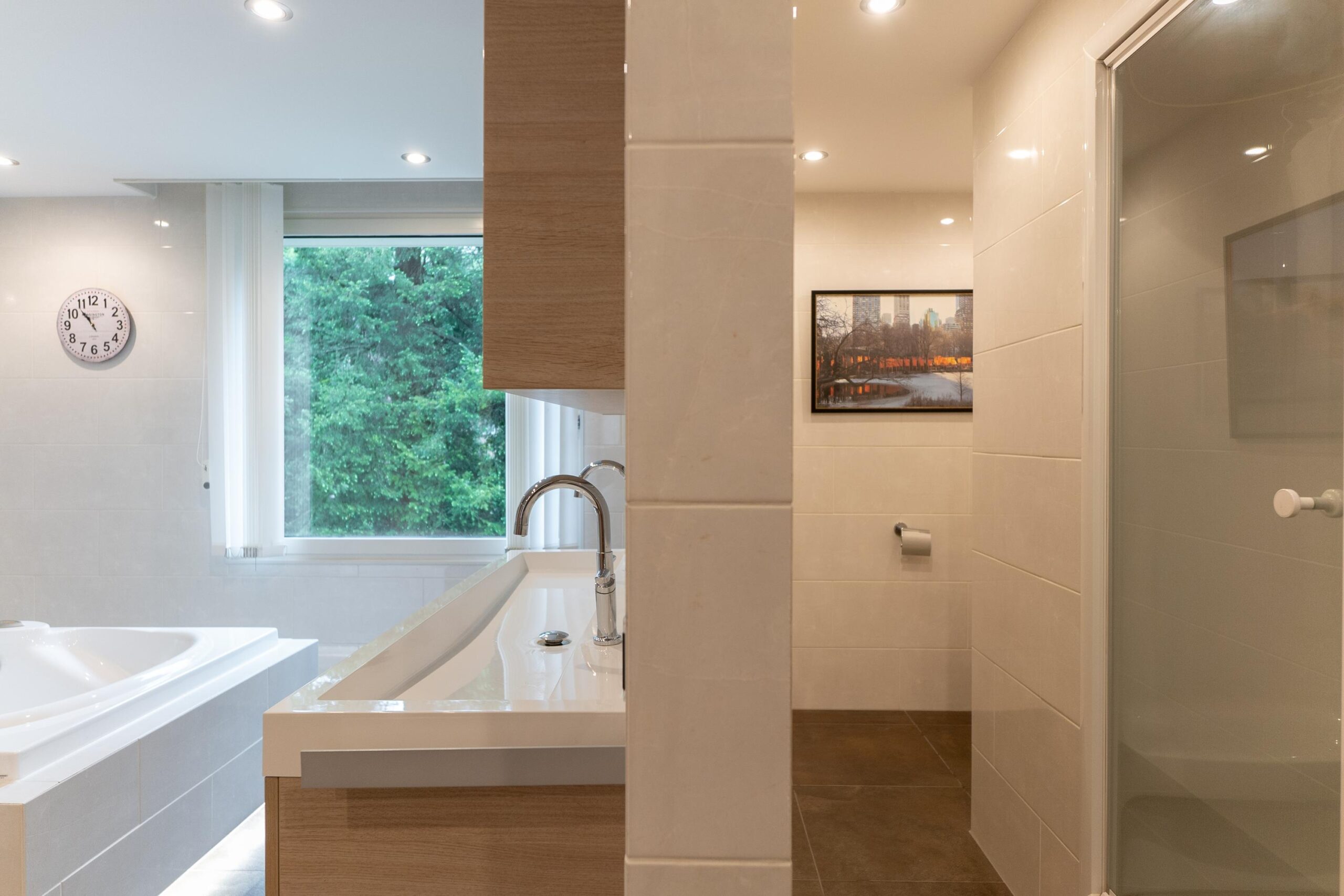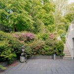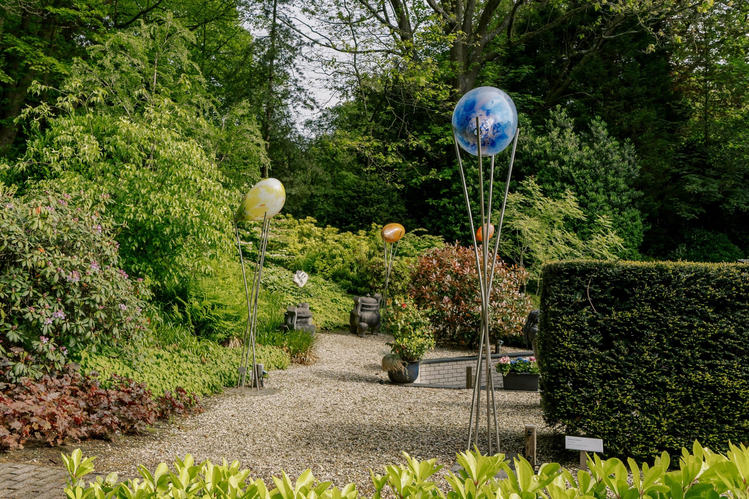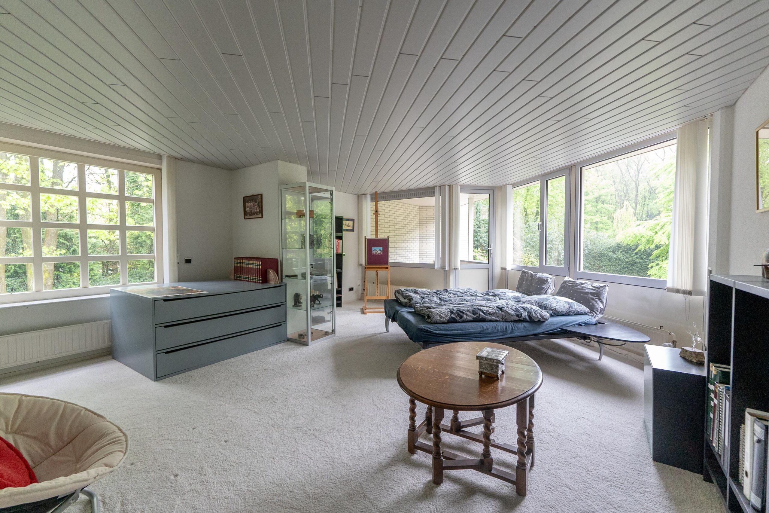 De tuin heeft een volwassen structuur van bomen en heesters, doorsneden met grindpaden die zich hier en daar openen tot beschutte zitjes. Vanuit de villa heeft u overal zicht op het weelderige groen van de tuin. En u heeft nogal wat kans om naar buiten te kijken want glas, licht en openheid zijn de kenmerken van dit staaltje moderne architectuur.