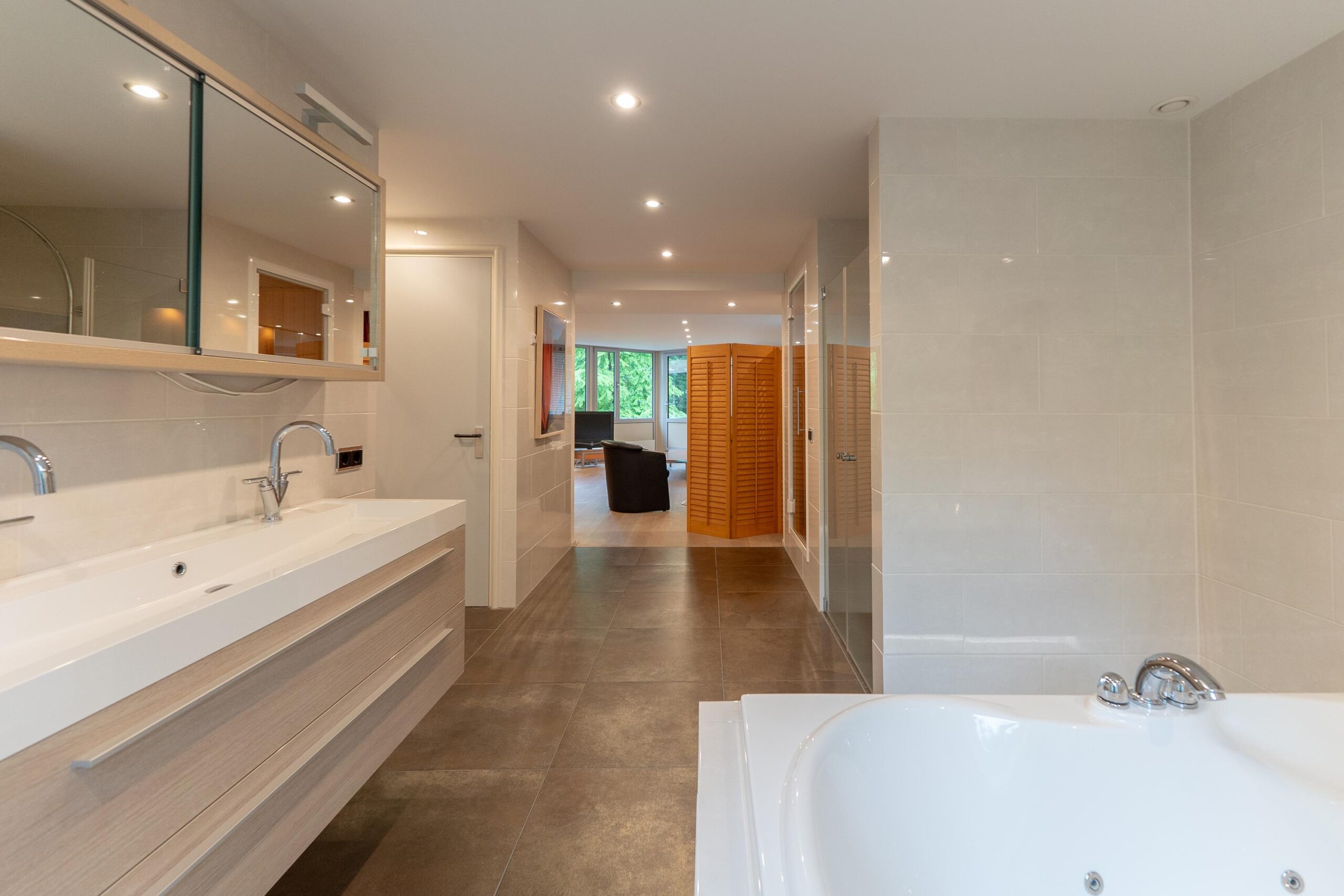 Souterrain is trouwens niet het juiste woord: door de niveauverschillen op het perceel hebben we het hier over een volwaardige woonverdieping die zich aan de achterzijde opent naar een spectaculair terras.