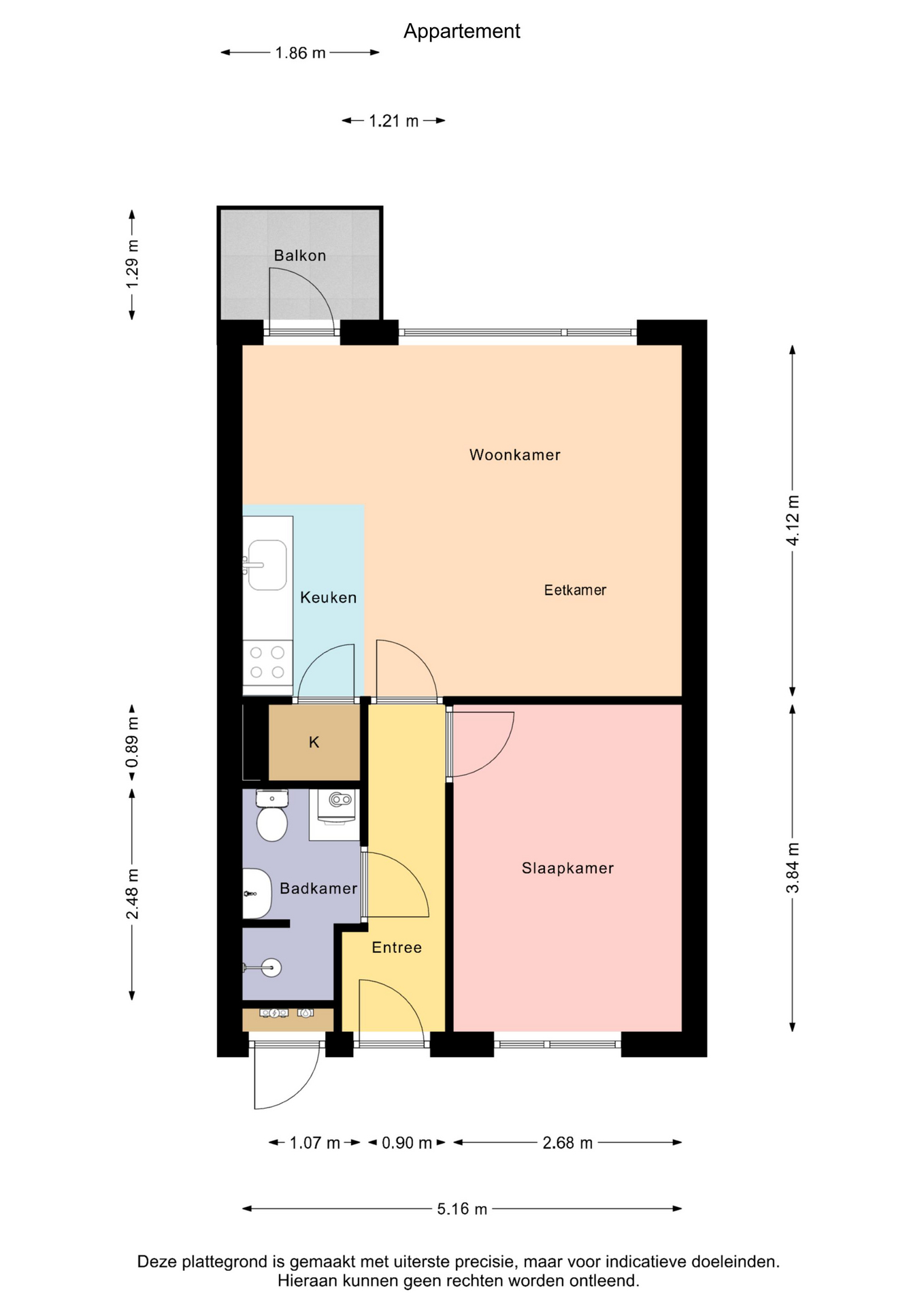 Entree via de gezamenlijke hal. Binnenkomst in de hal met toegang tot de badkamer met douche, toilet, wastafel en wasmachineaansluiting. Aansluitend de slaapkamer en de lichte woonkamer met open keuken. Vanuit de woonkamer stap je via de loopdeur het balkon op, waar je kunt genieten van de ochtendzon en het uitzicht over het water.
