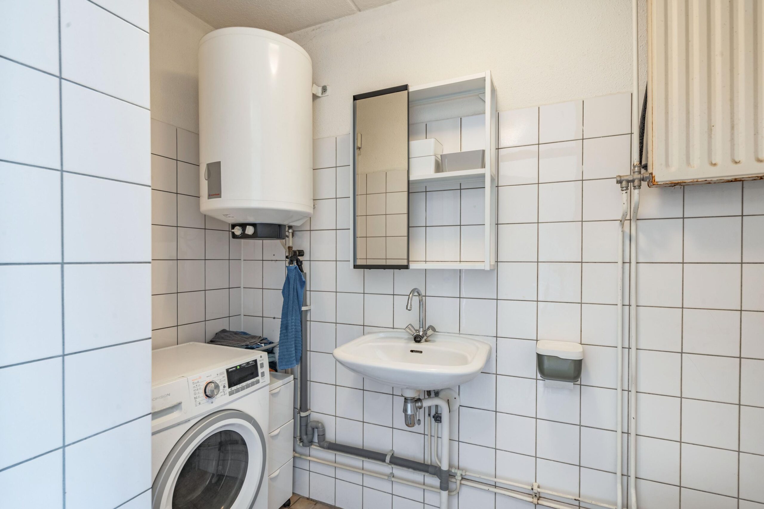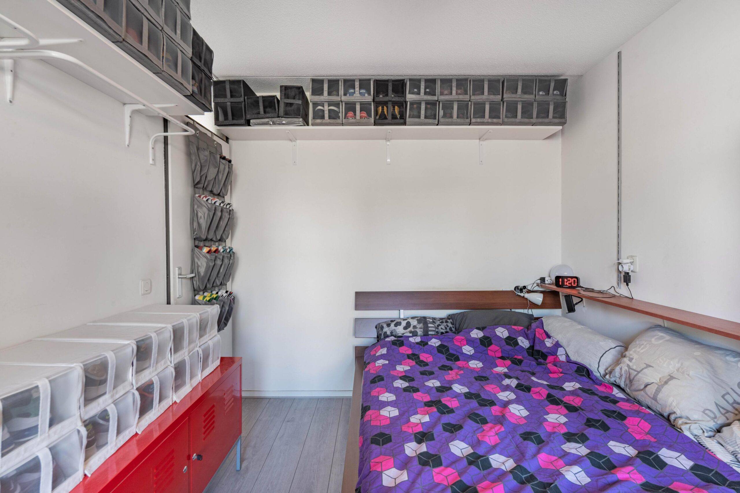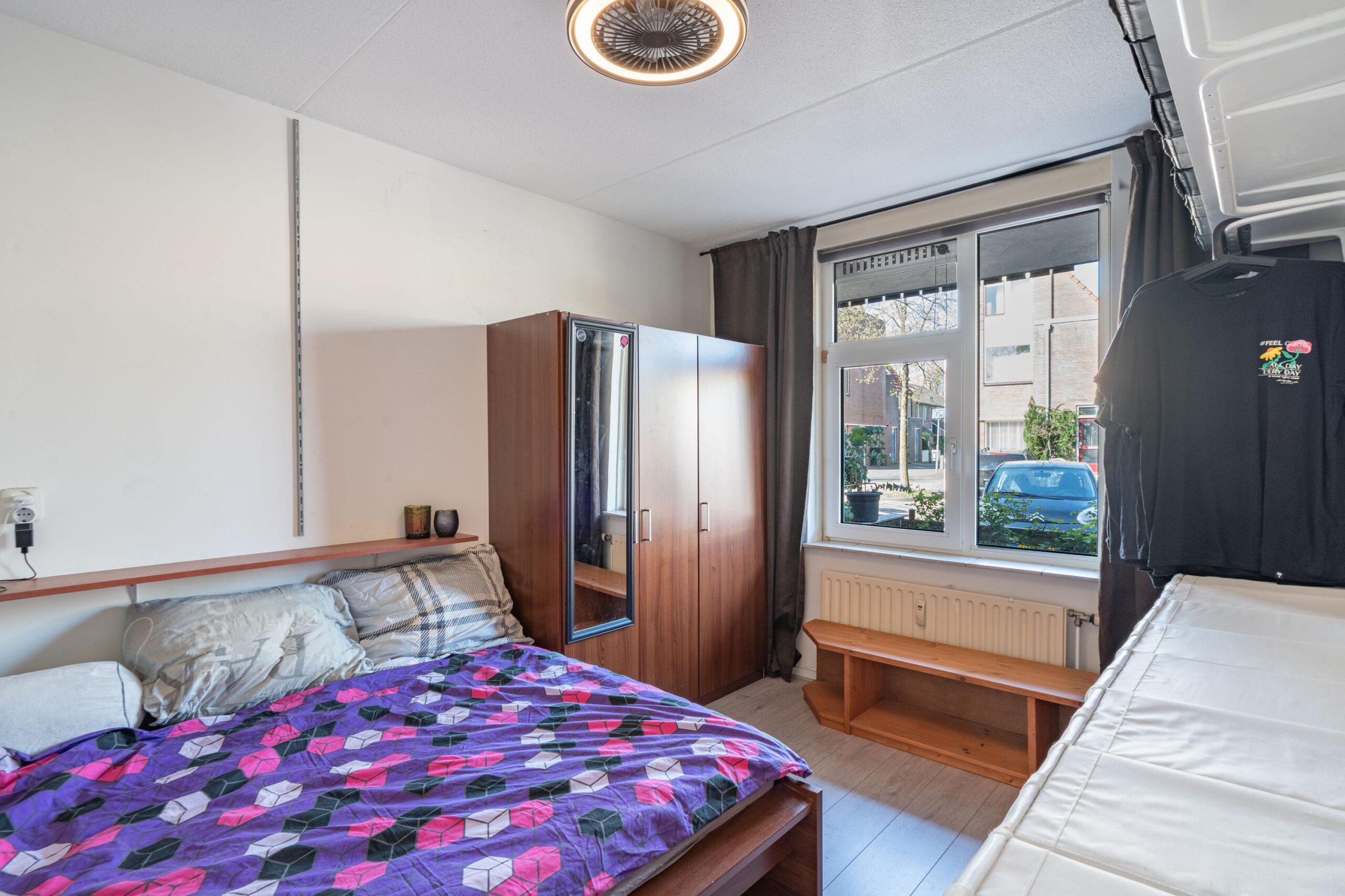 Via de entree en hal bereik je de badkamer met douche, wastafel, toilet en aansluiting voor de wasmachine. De slaapkamer biedt ruimte voor een tweepersoonsbed en kast.
