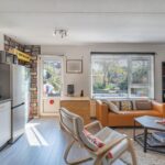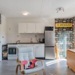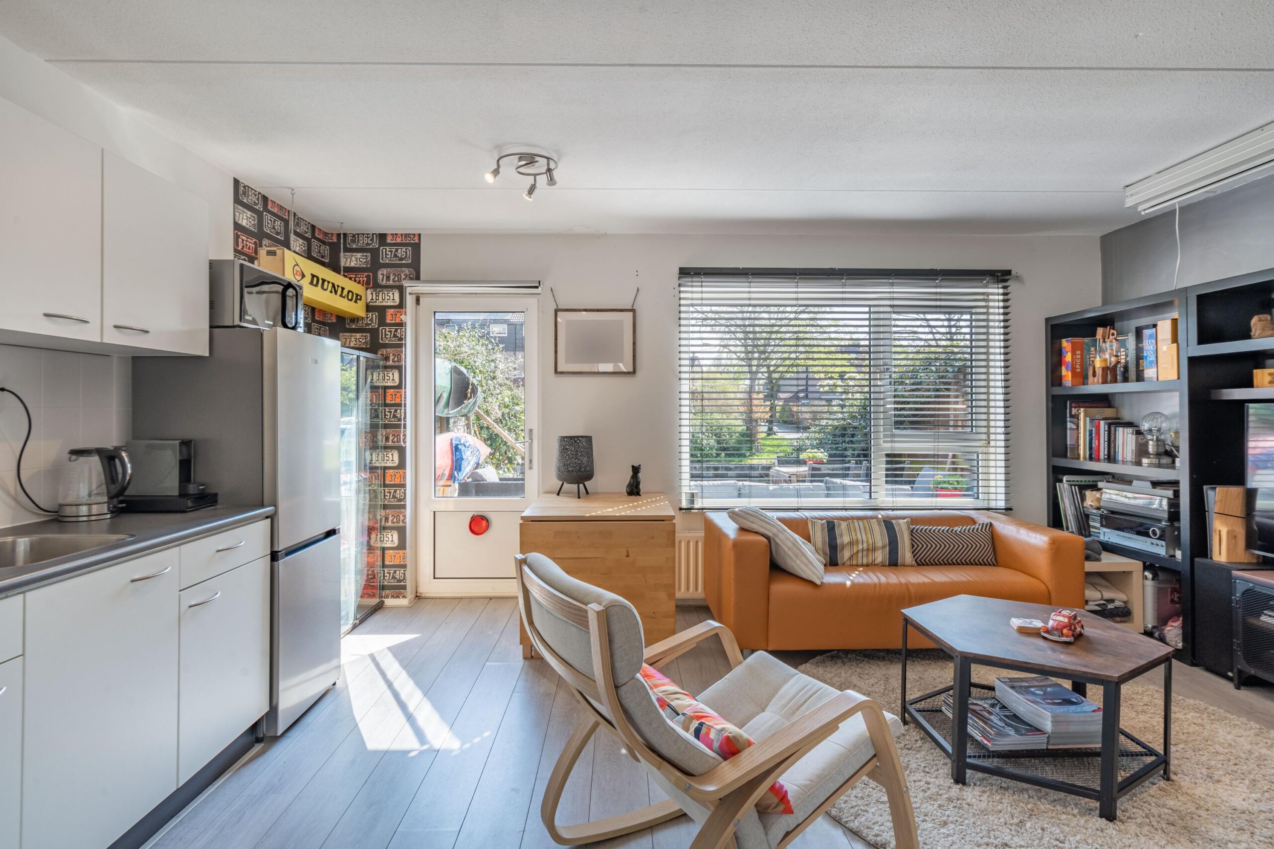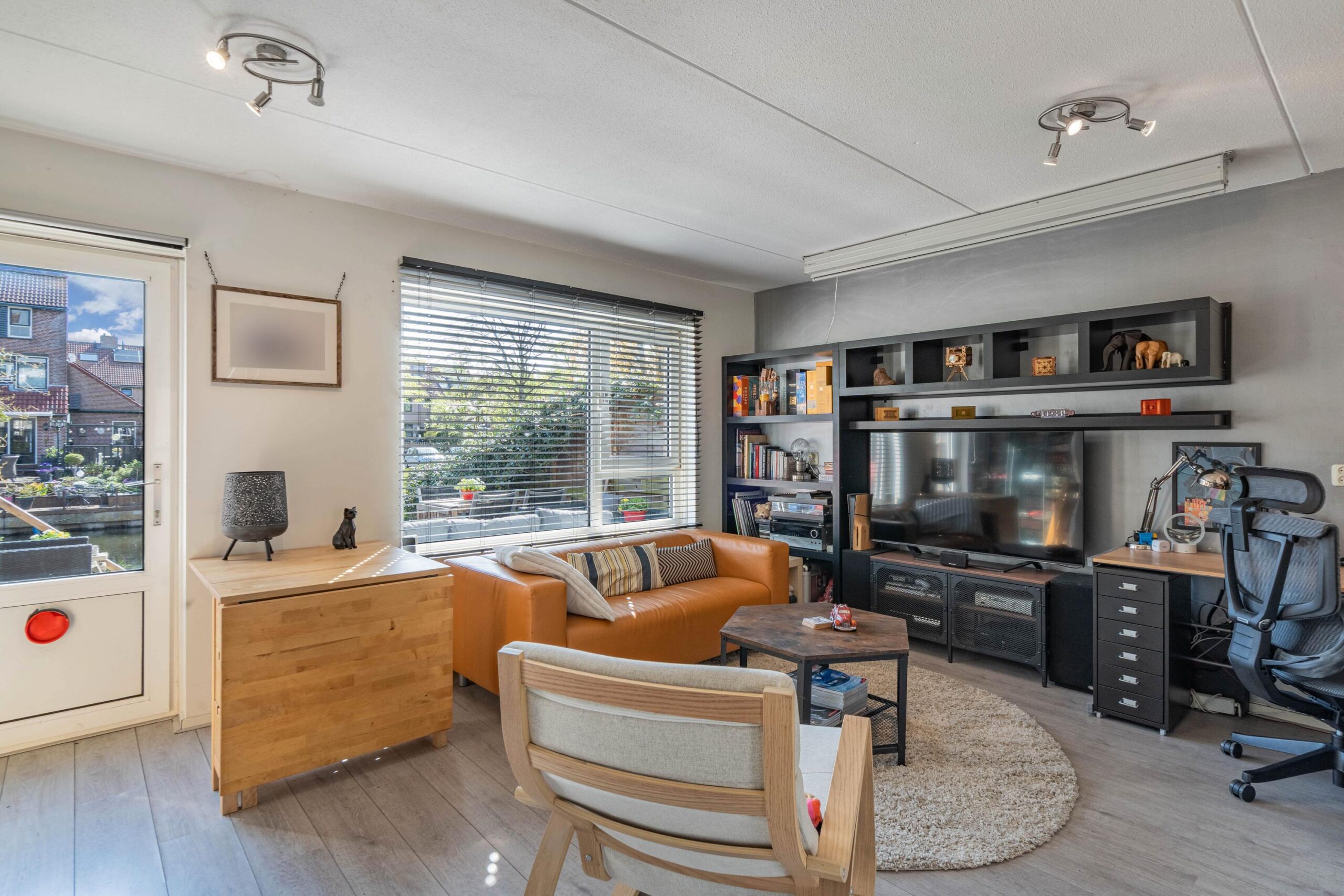 De lichte woon-/eetkamer heeft een open keuken en directe toegang tot de zonnige tuin, waar je heerlijk kunt genieten van het uitzicht op het water.