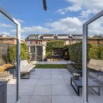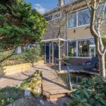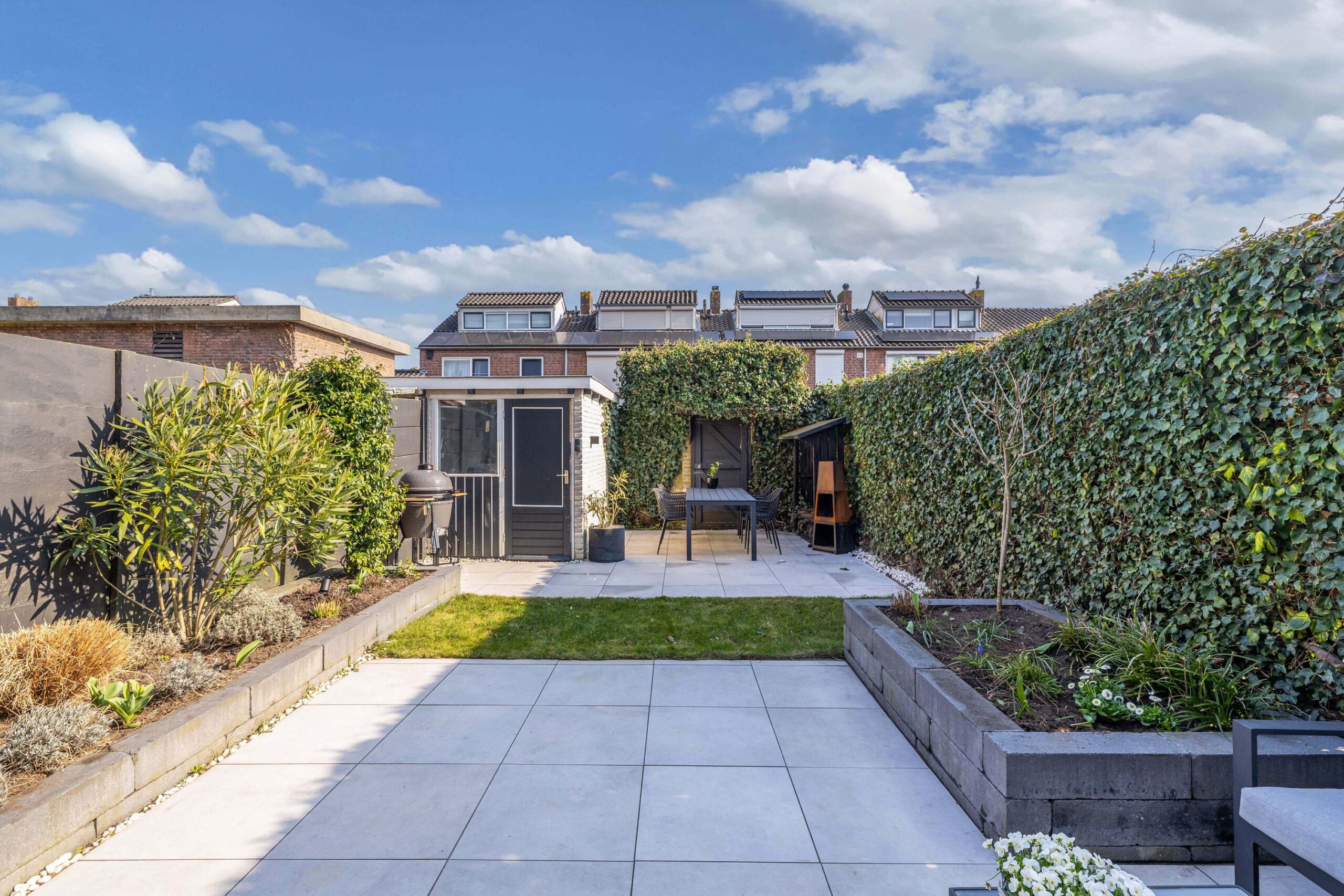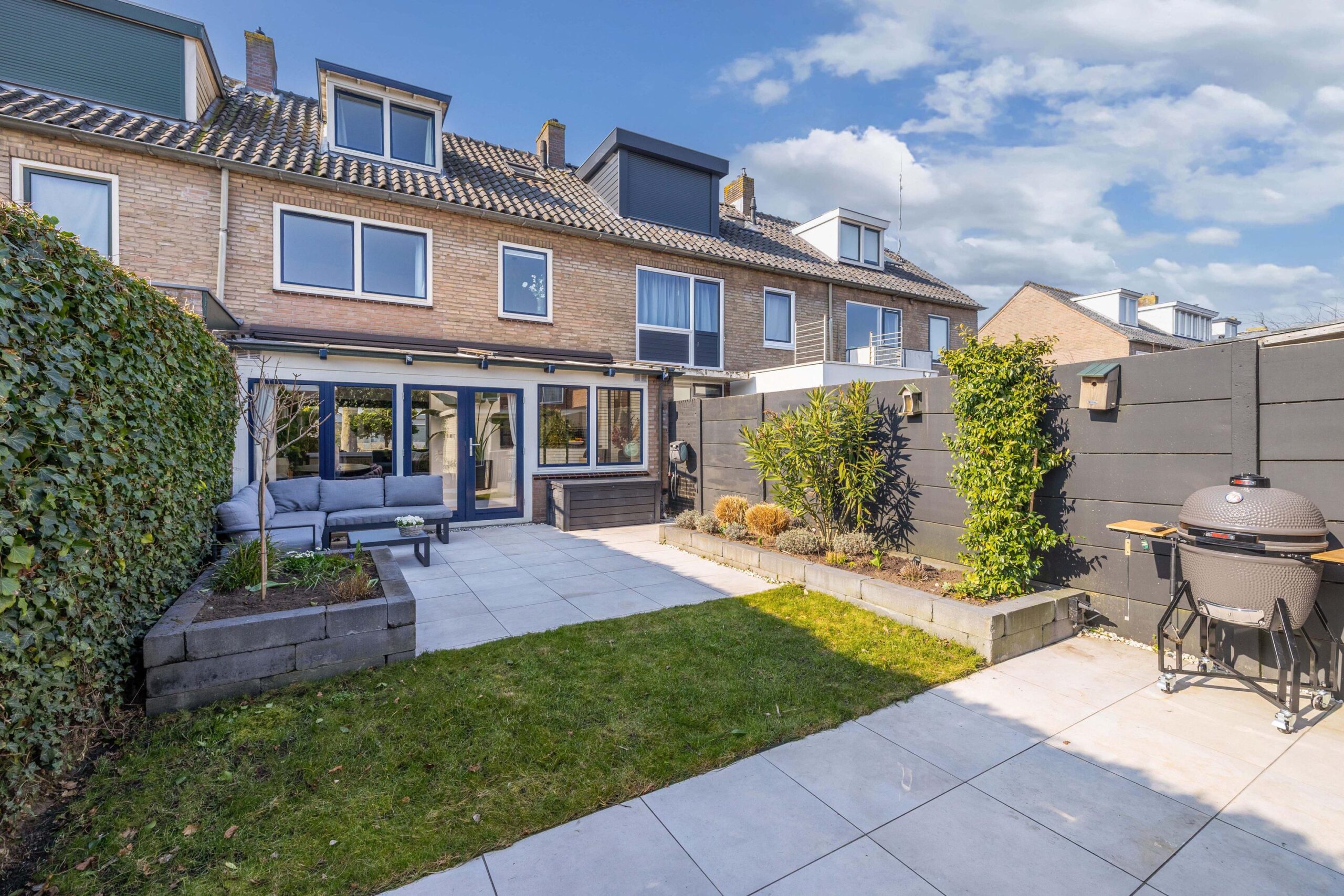 Via de openslaande deuren loopt u zo de zonnige achtertuin in.